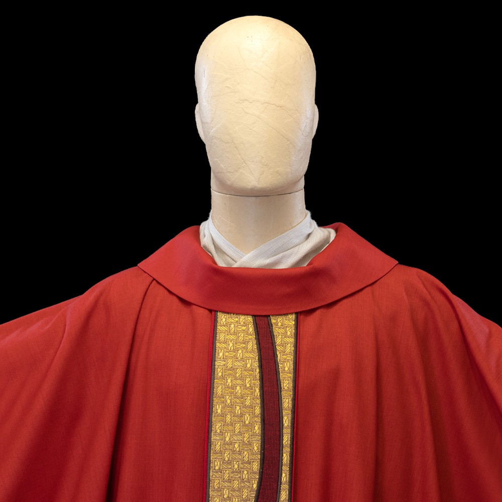 Lo stolone posto sopra il paramento sacro è realizzato e intrecciato a mano con la tecnica ad intarsio in velluto rosso e passamaneria dorata.