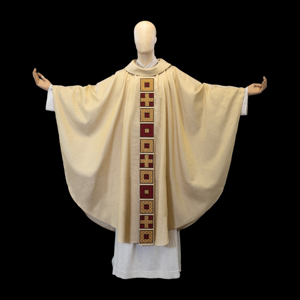 La casula è realizzata in tessuto misto 55% cotone e 45% viscosa, mentre lo stolone è finemente intrecciato a MANO con intarsio di velluto rosso decorato con croci e quadrati.