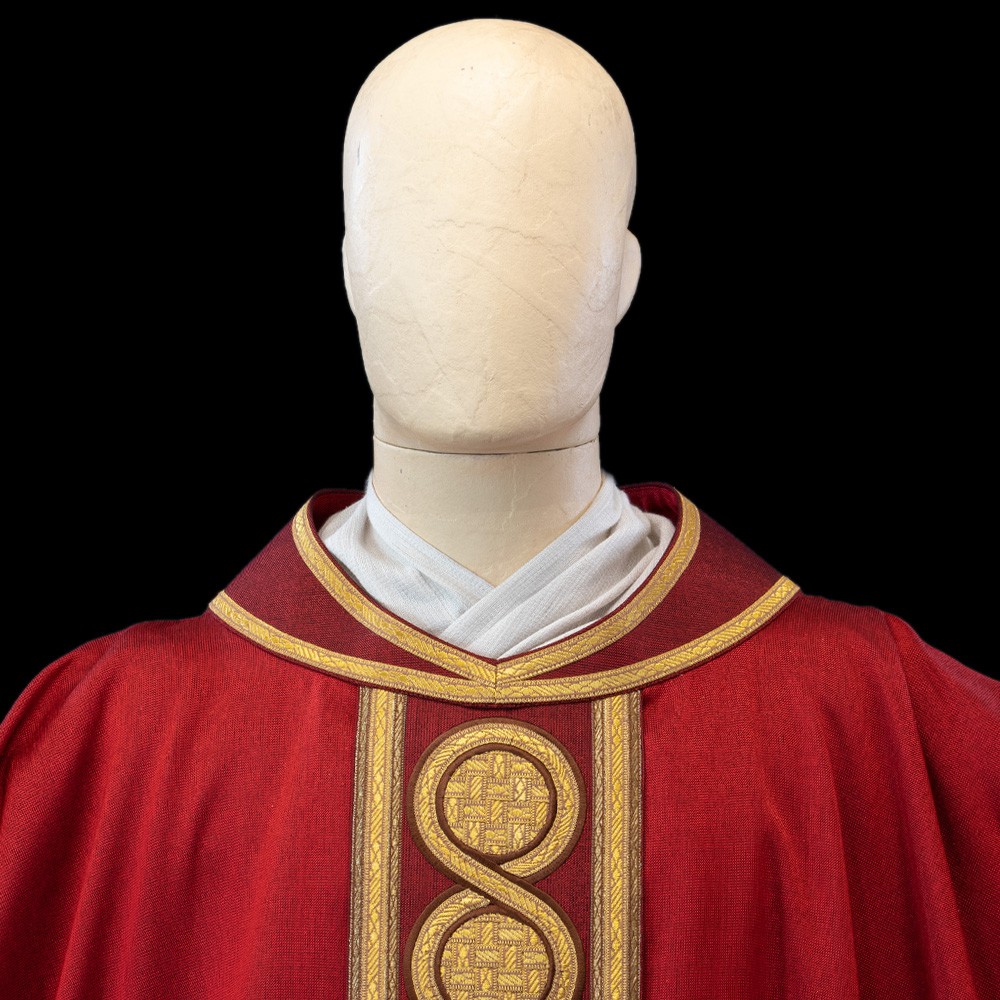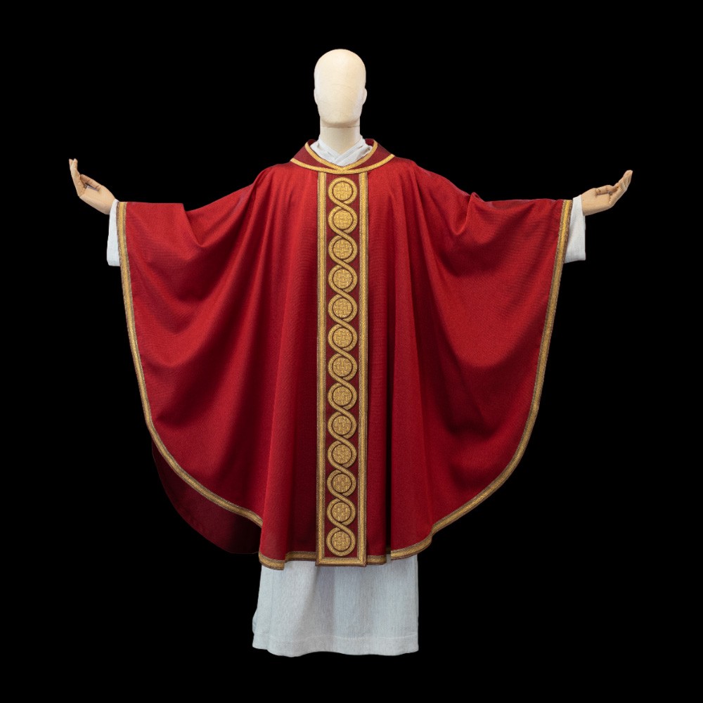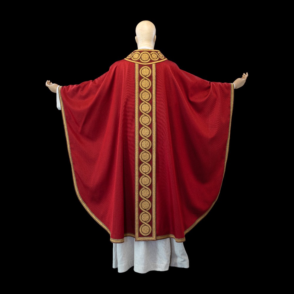 Pregiata casula sacerdotale rossa realizzata in misto cotone, viscosa, con triplo giro di passamaneria lungo tutto il perimetro.