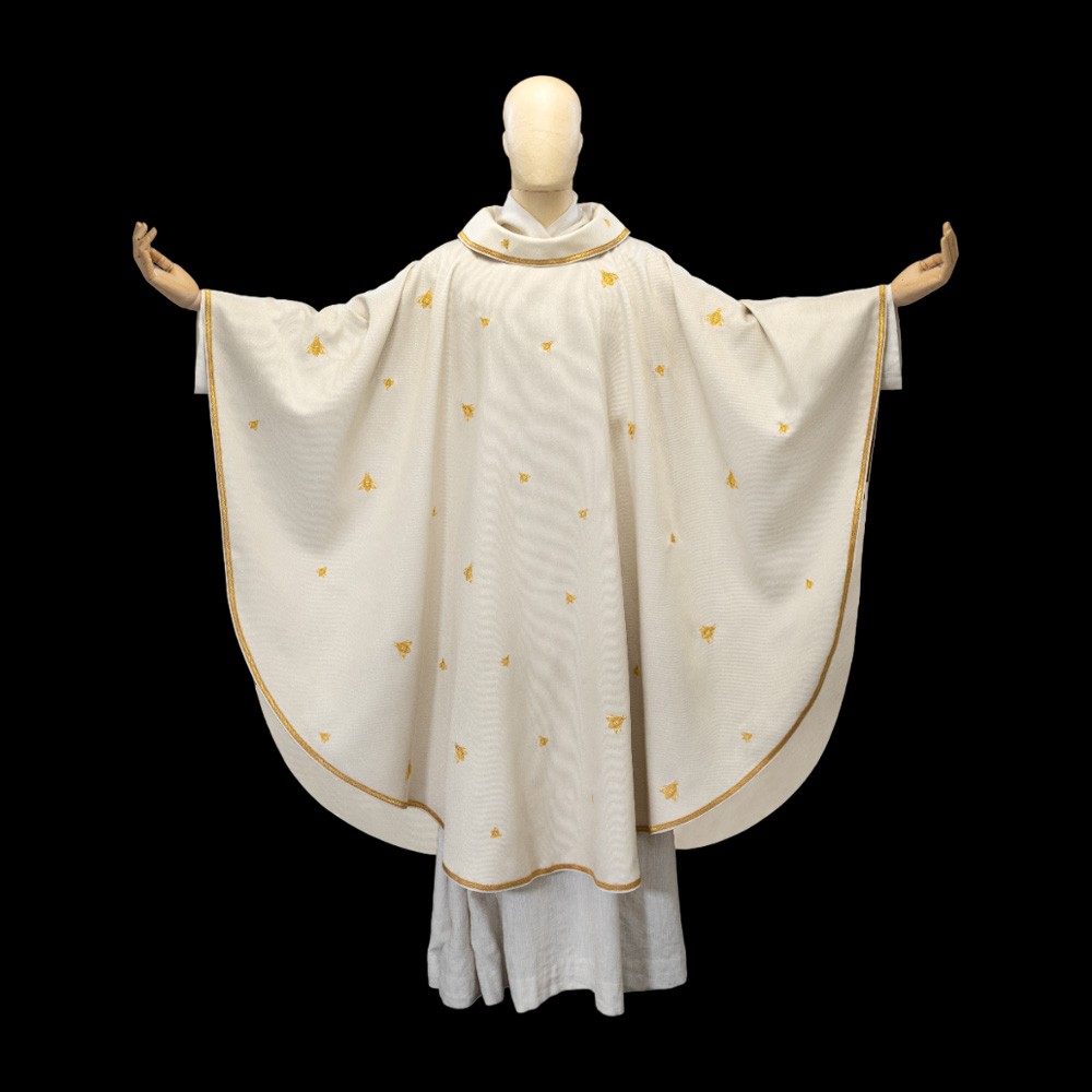Casula sacerdotale realizzata in leggerissimo tessuto misto cotone e rayon viscosa, prodotta dall'Atelier SIRIO.