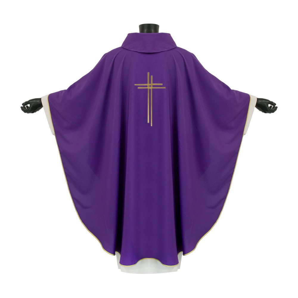 La casula è confezionata in tessuto misto con croci ricamate oro. Modello con collo ad anello e stola abbinata inclusa.