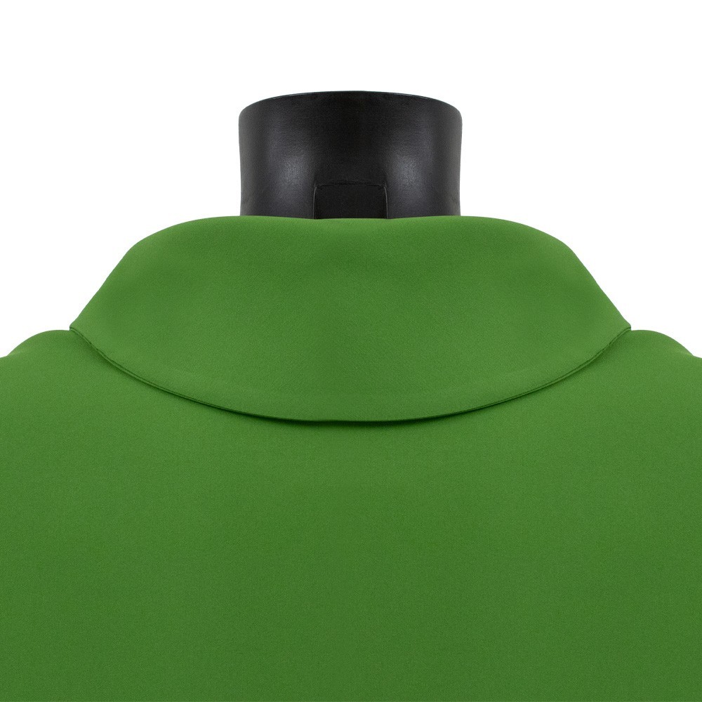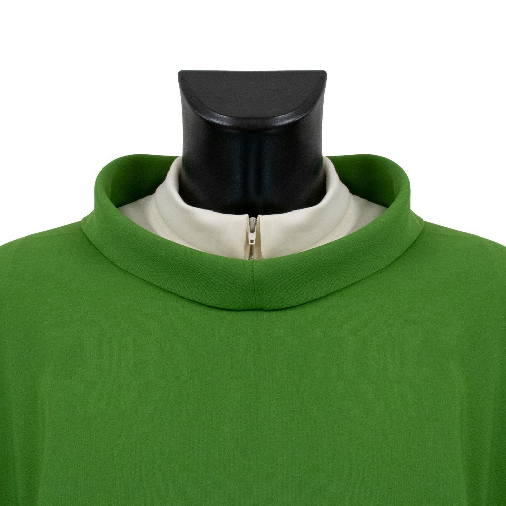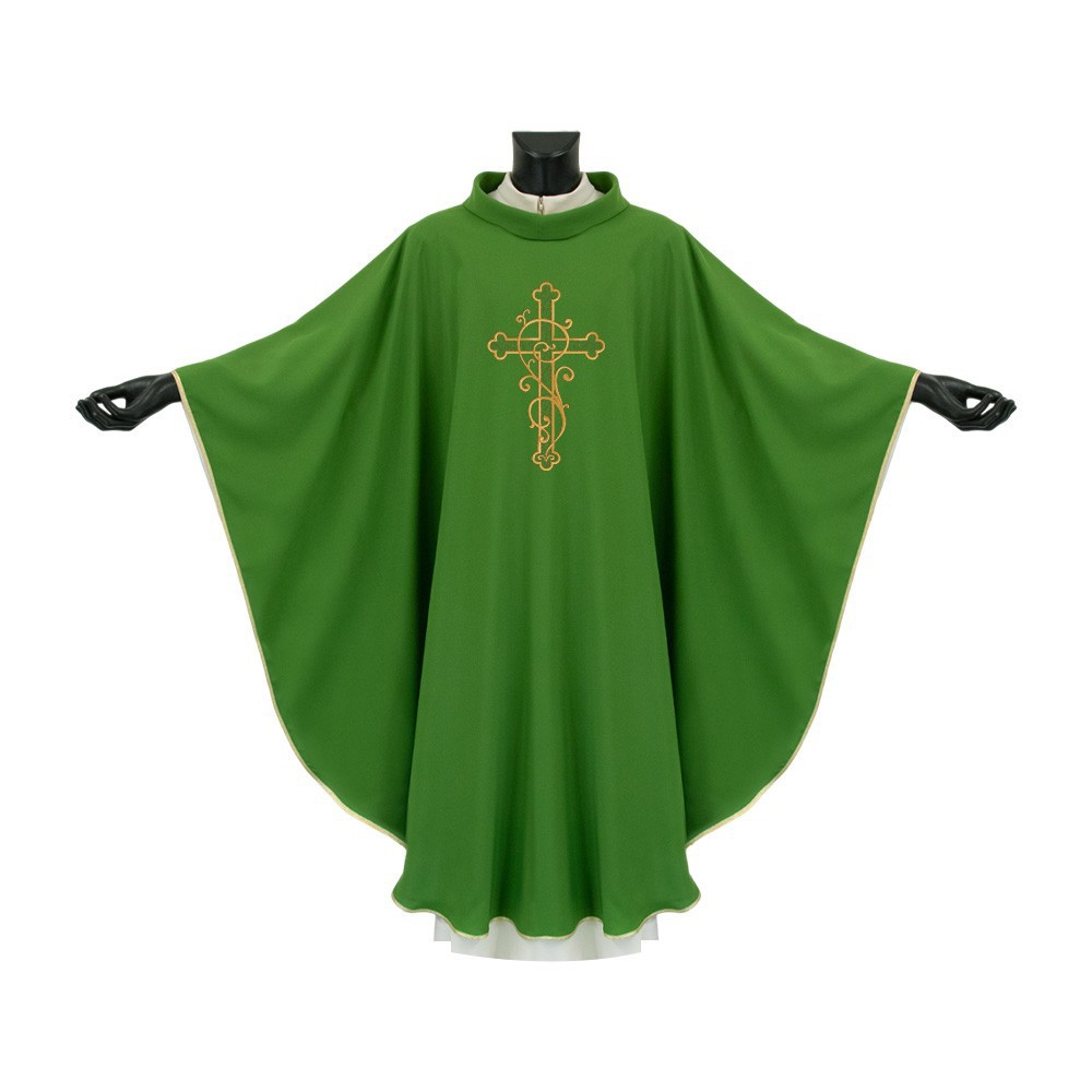 Casula sacerdotale con collo ad anello e fine ricamo eseguito accuratamente a macchina su tessuto 100% poliestere.