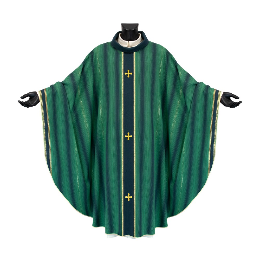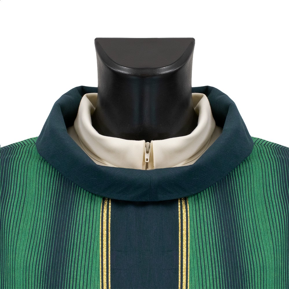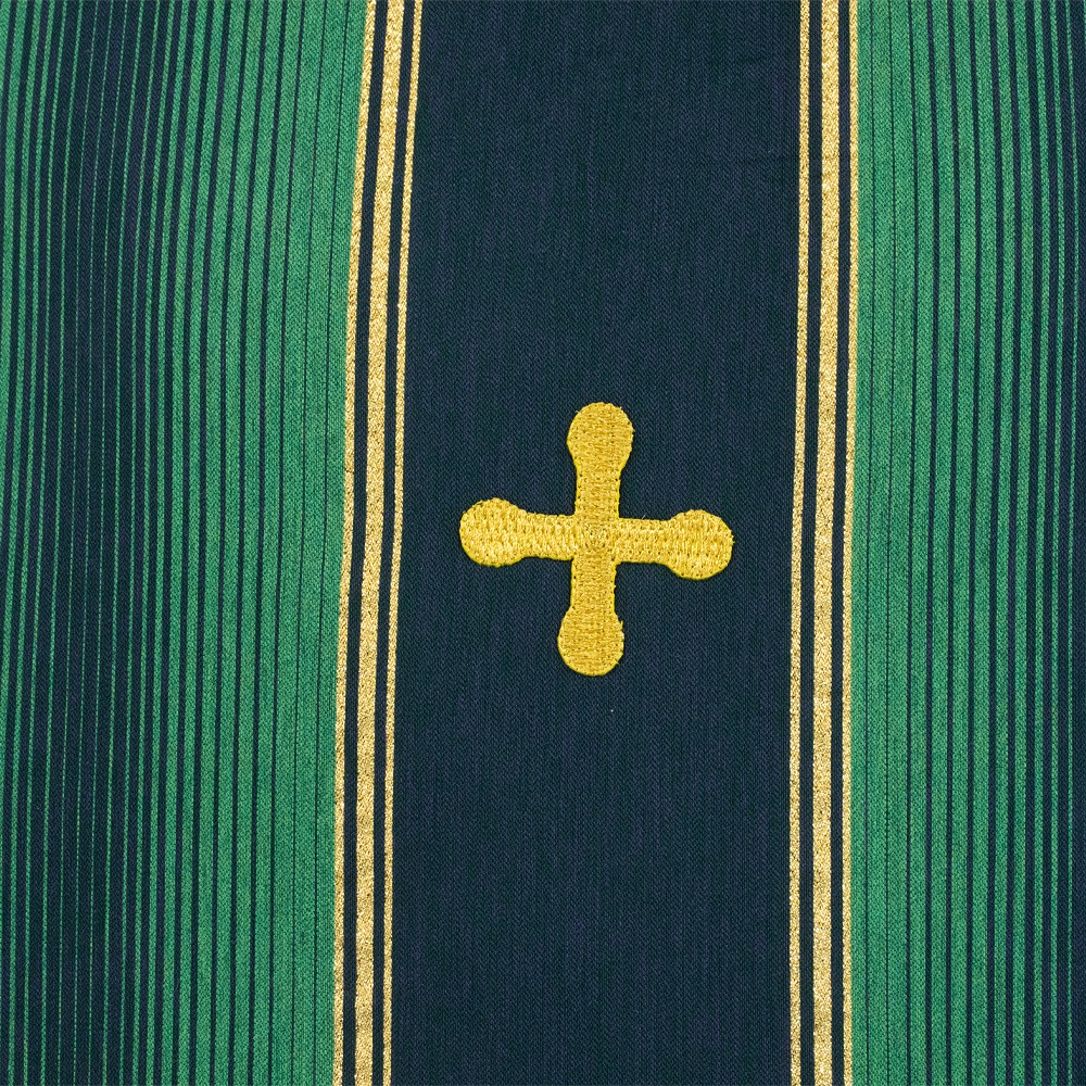 Casula liturgica verde modello rigato, con collo ad anello, confezionata in elegante tessuto misto poliestere, viscosa e lurex, pensata per garantire comfort, eleganza e durata nel tempo.