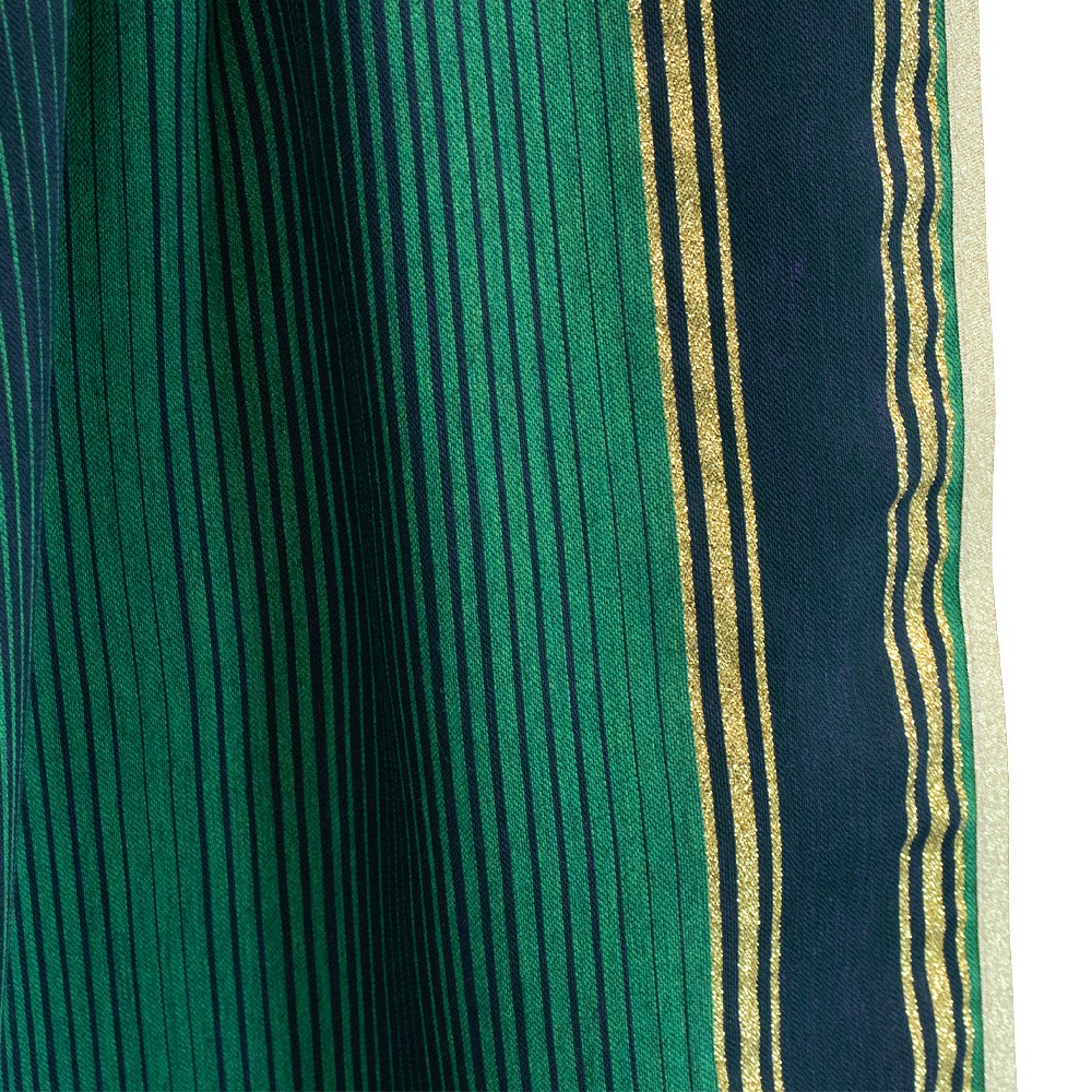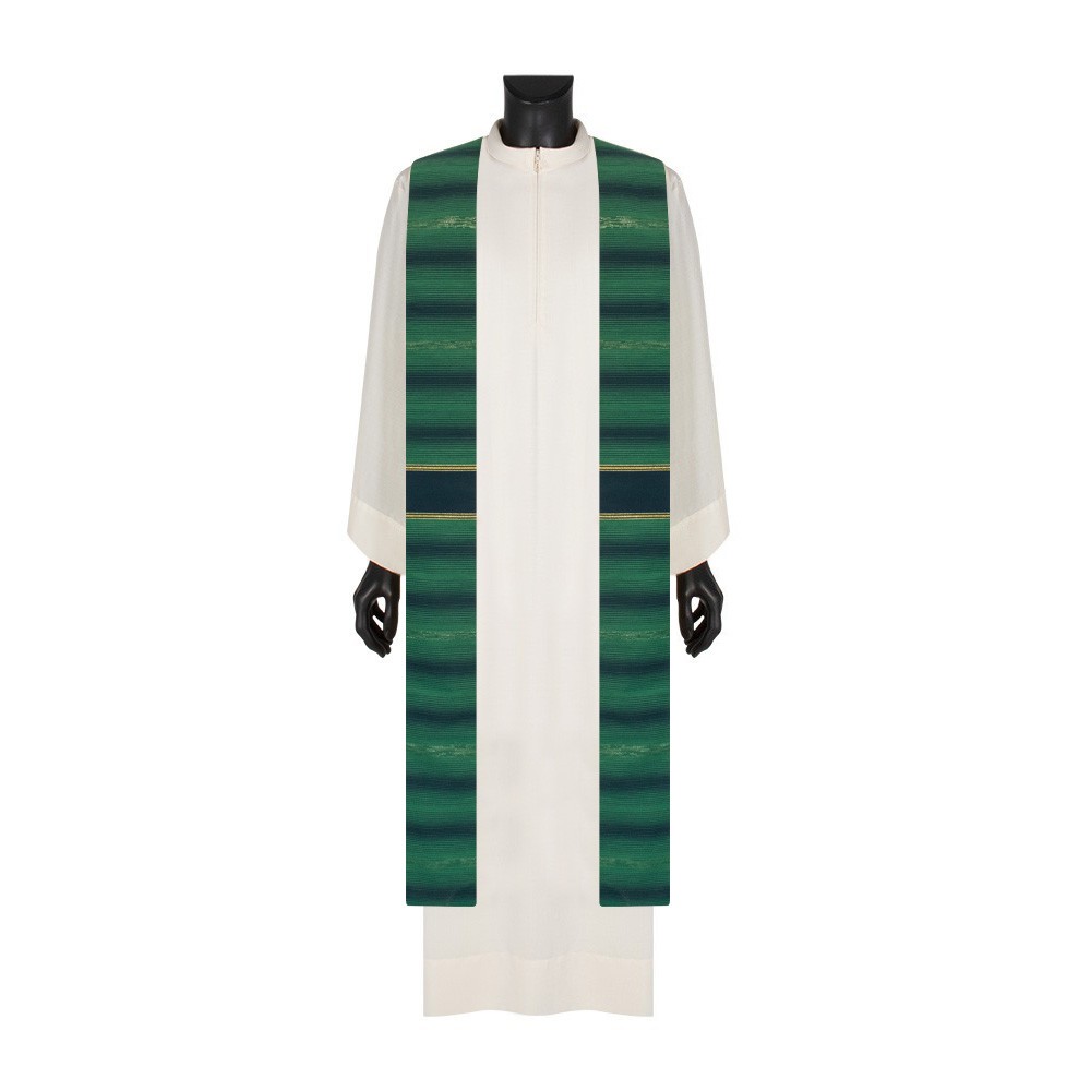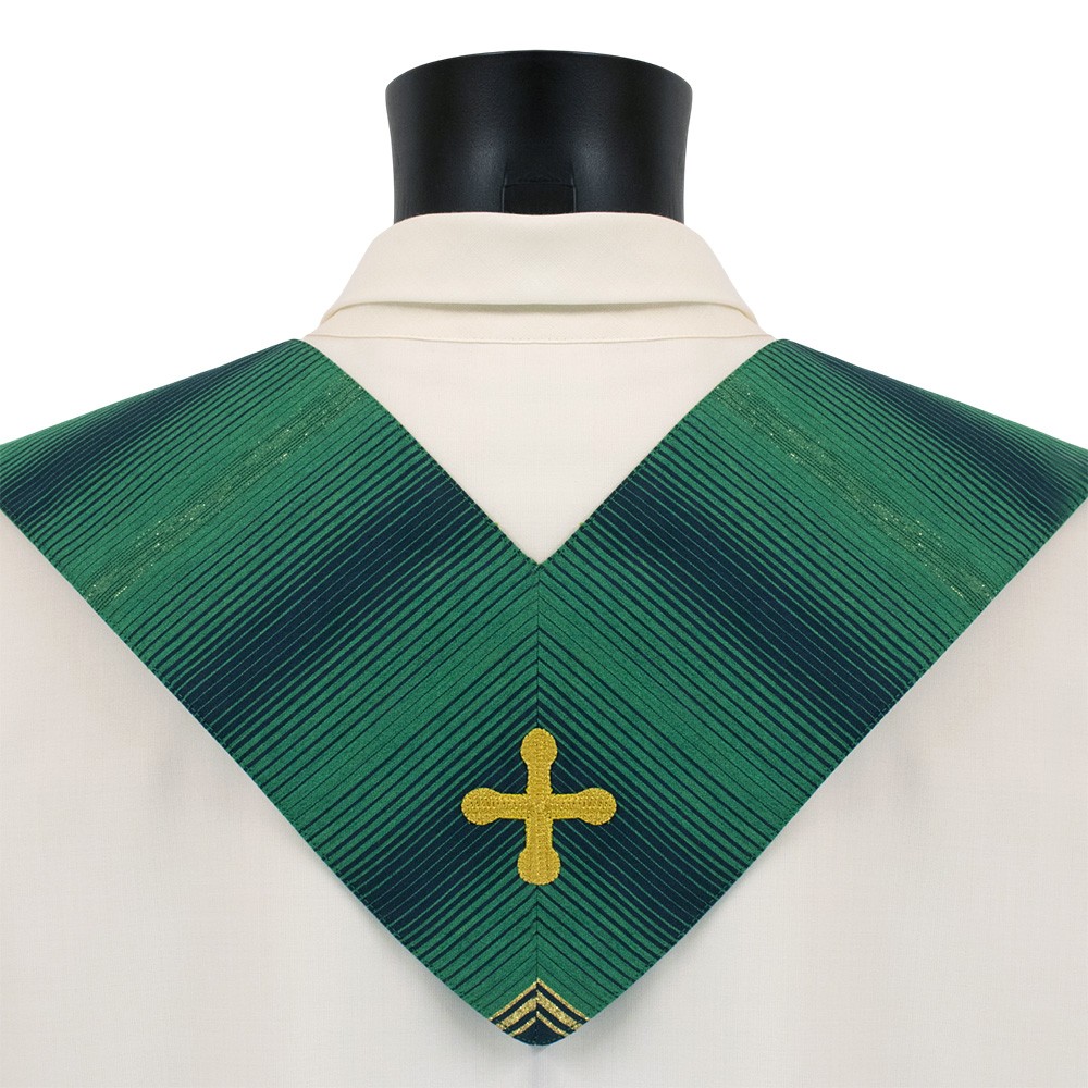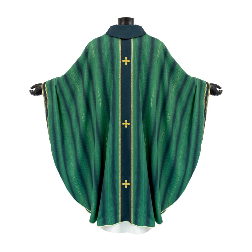 Casula liturgica verde modello rigato, con collo ad anello, confezionata in elegante tessuto misto poliestere, viscosa e lurex, pensata per garantire comfort, eleganza e durata nel tempo.