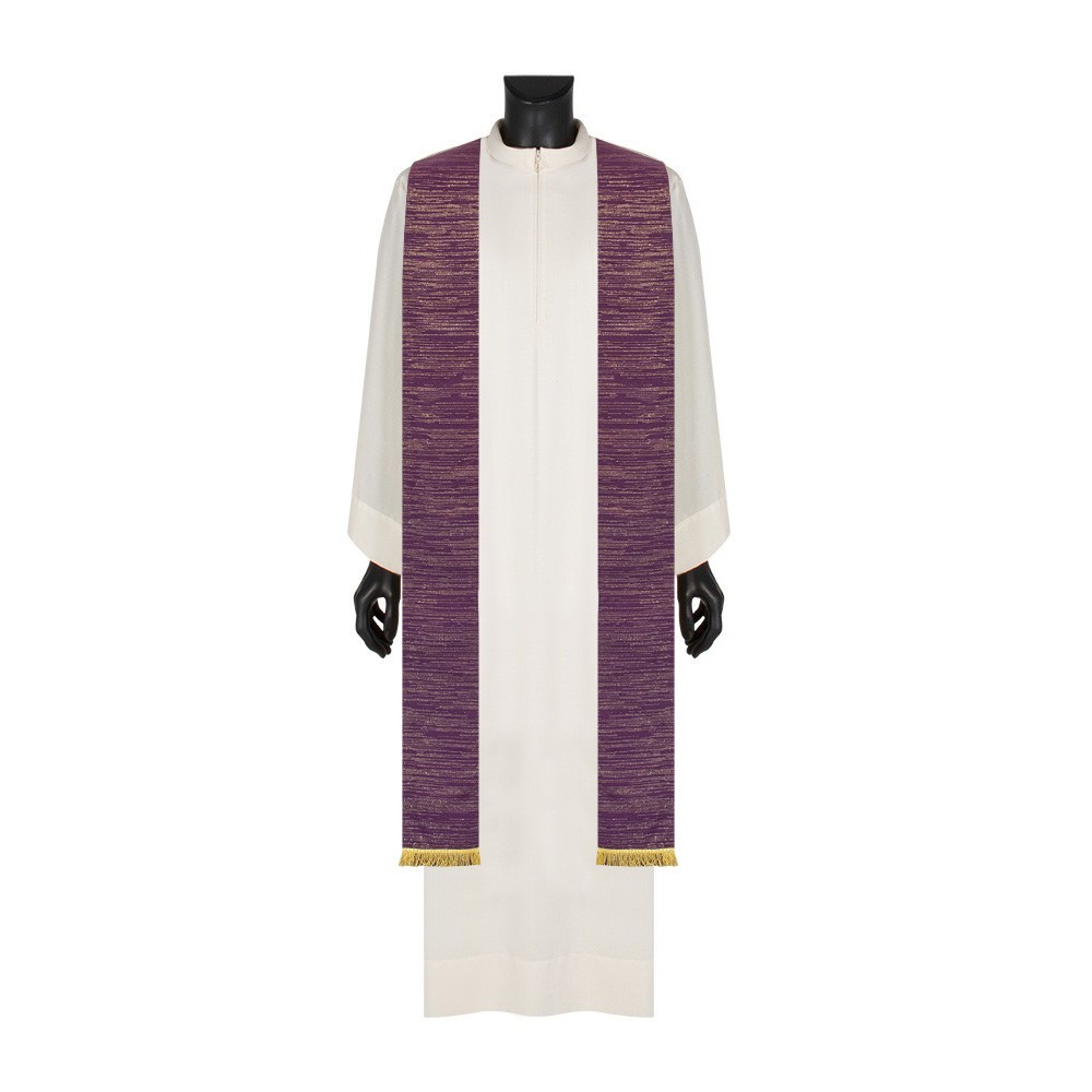 Casula liturgica viola dal design essenziale, con collo ad anello e stola abbinata rifinita con frangia dorata. Ideale per Avvento e Quaresima.