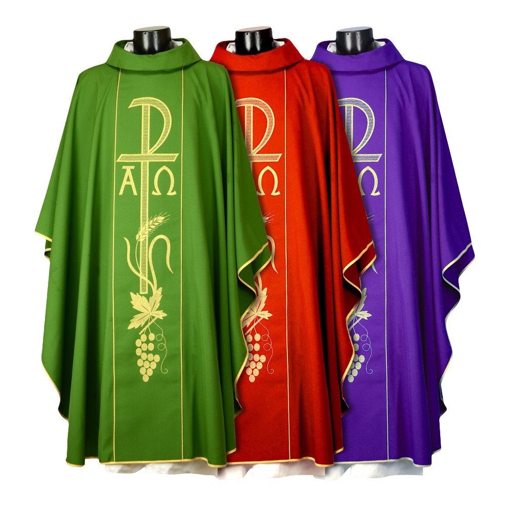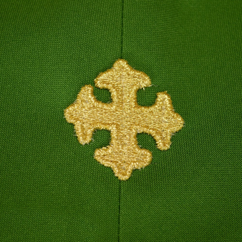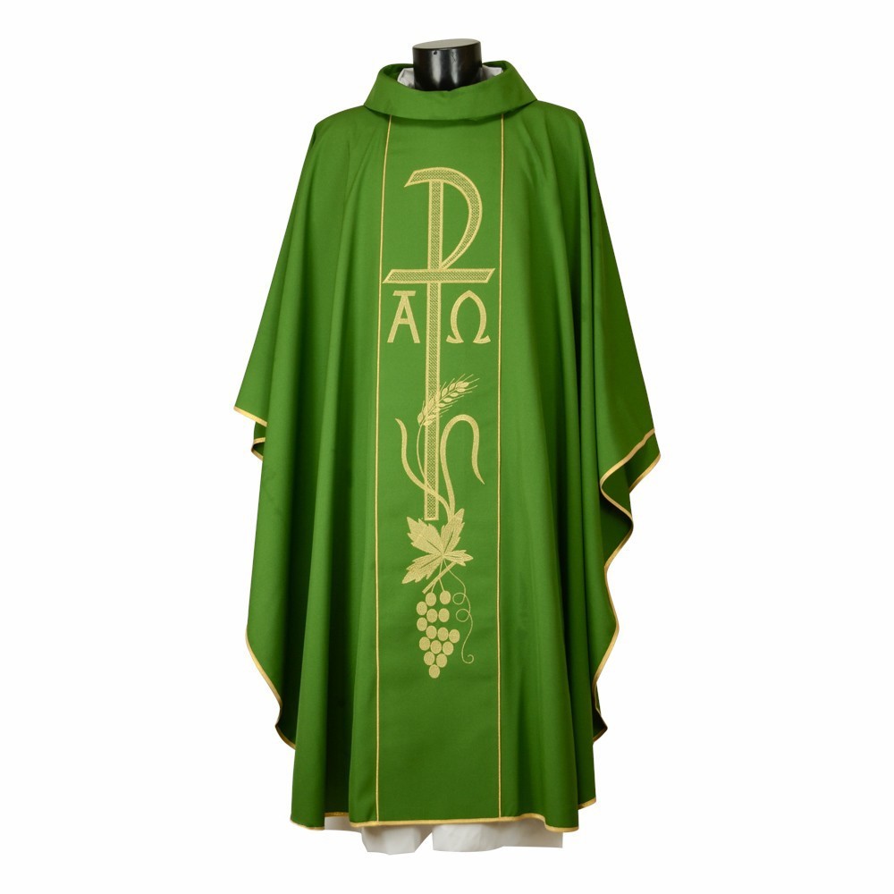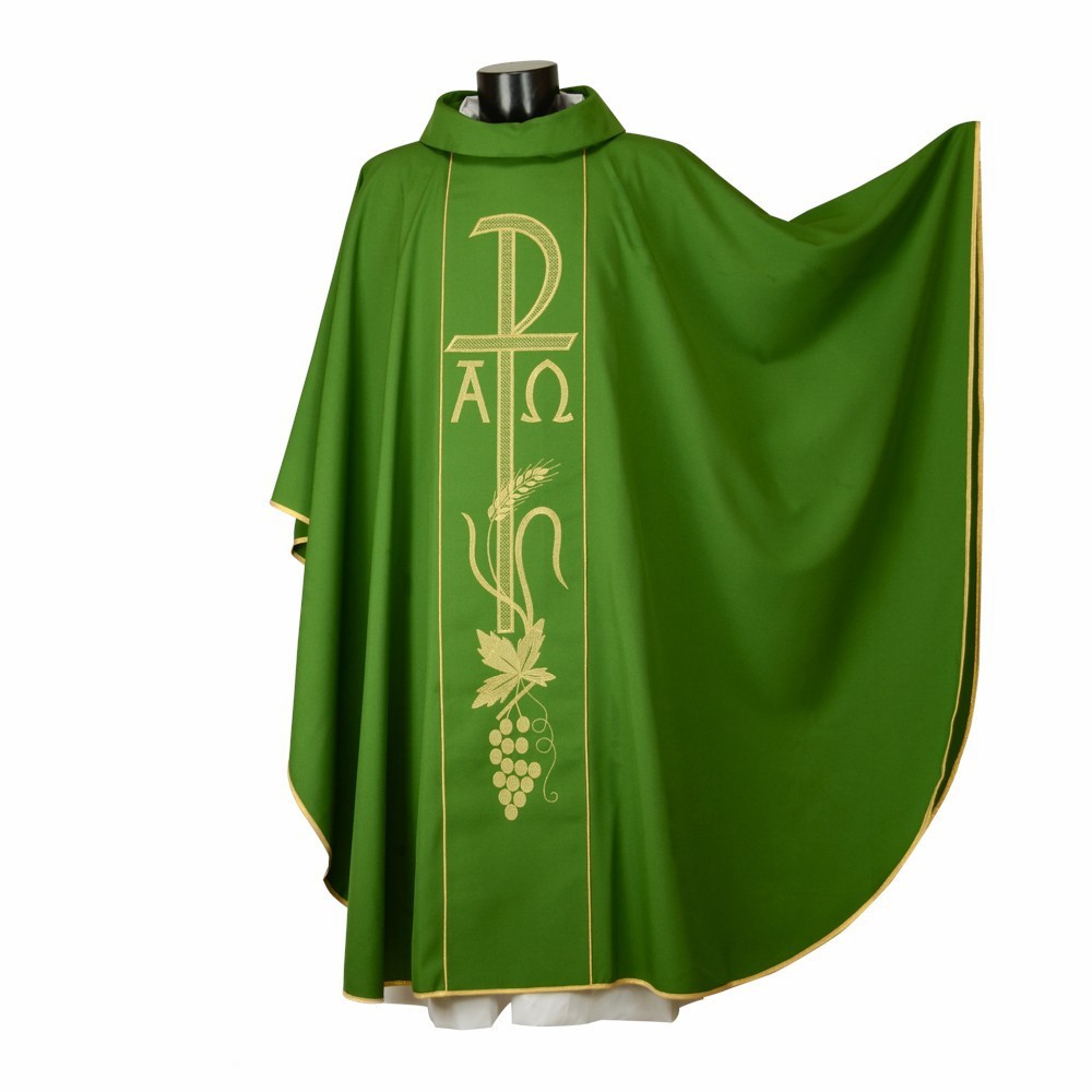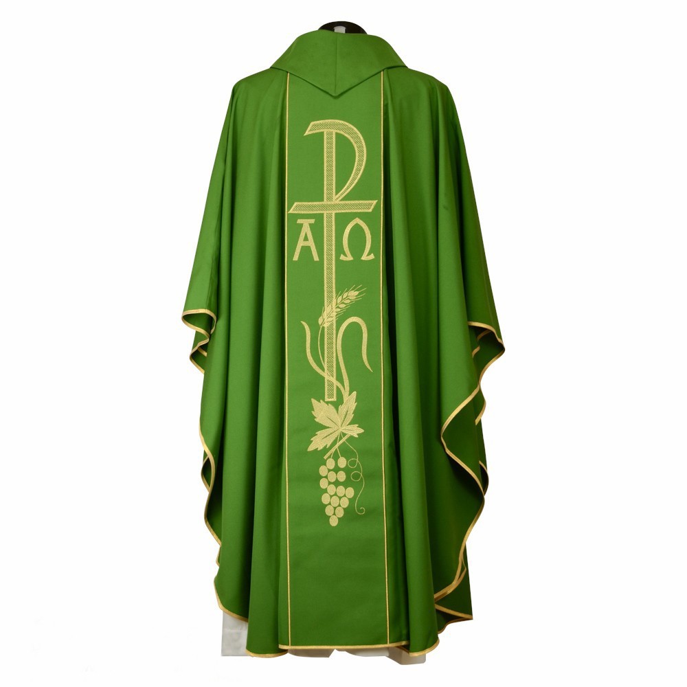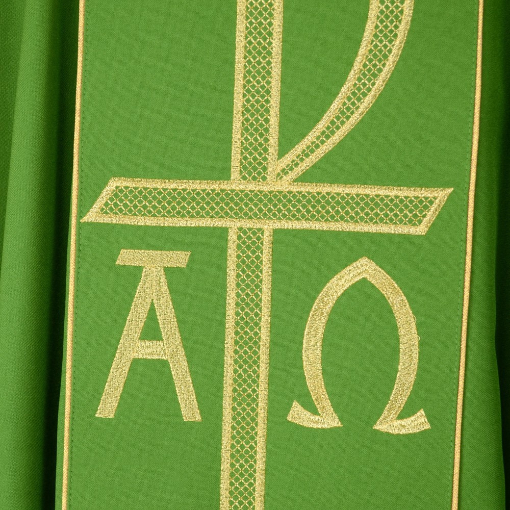 Graziosa casula per sacerdote di colore verde realizzata 80% poliestere e 20% Lana. Questo paramento si presenta con un ricco ricamo dorato Croce XP, Alfa e Omega. Bordata color oro. Completa di stola. La casula è realizzata con ottimi tessuti, garantendo la qualità. Corredata di scatola.