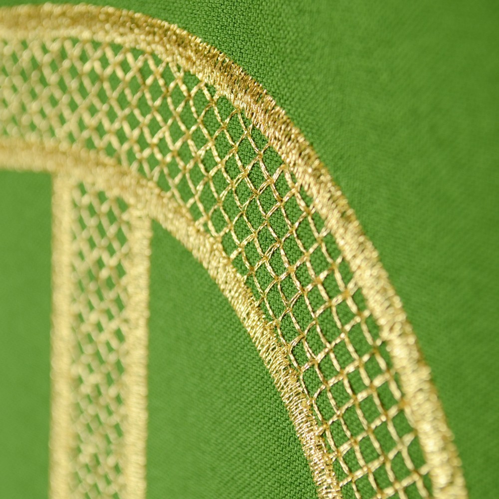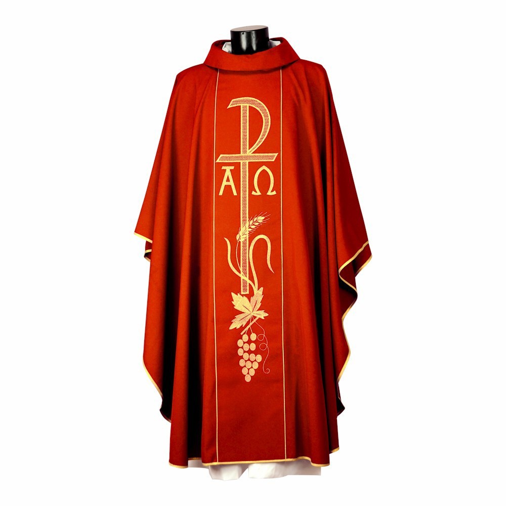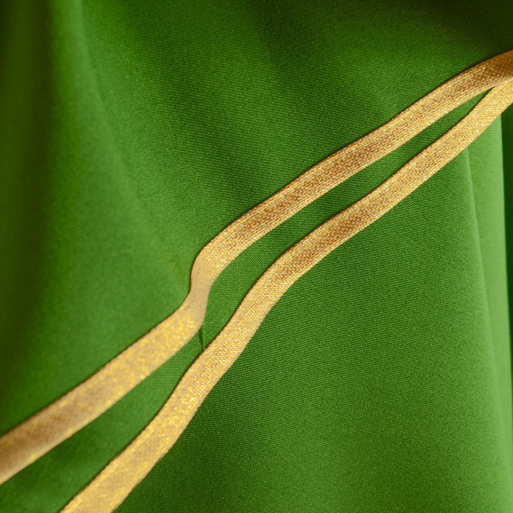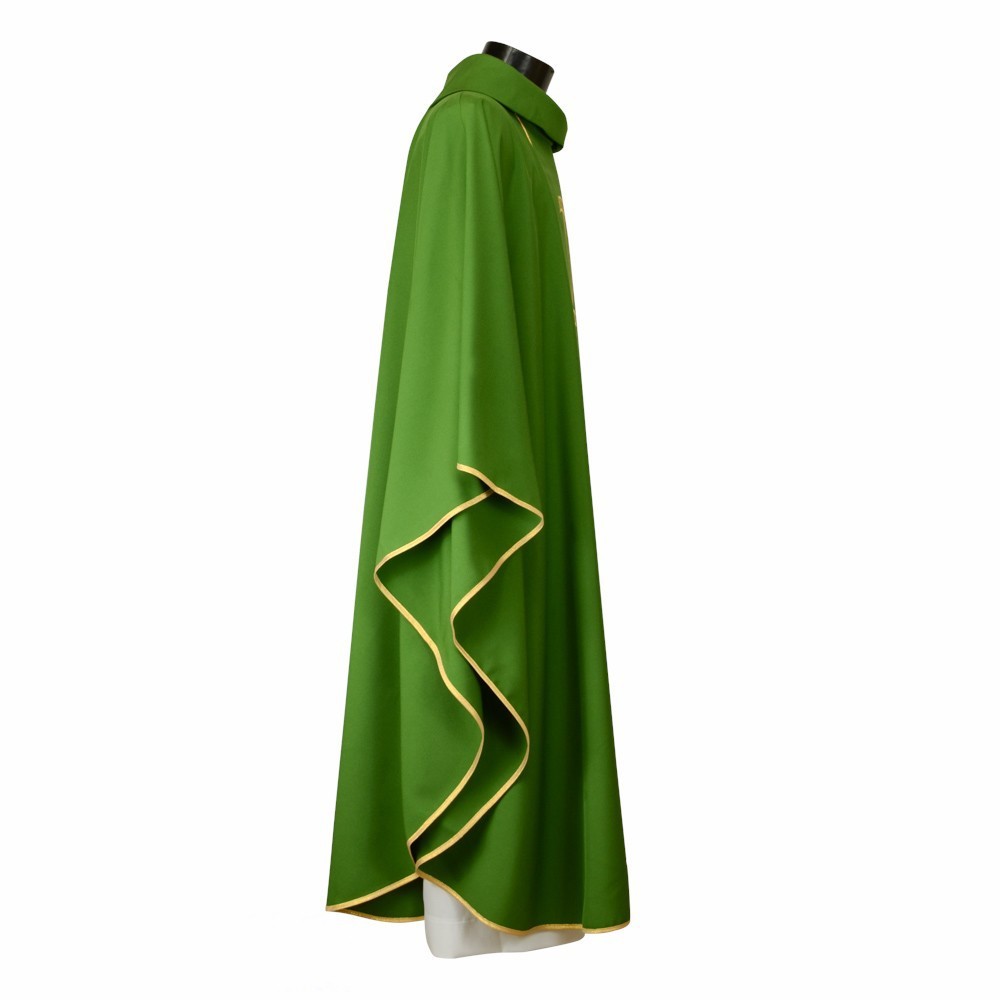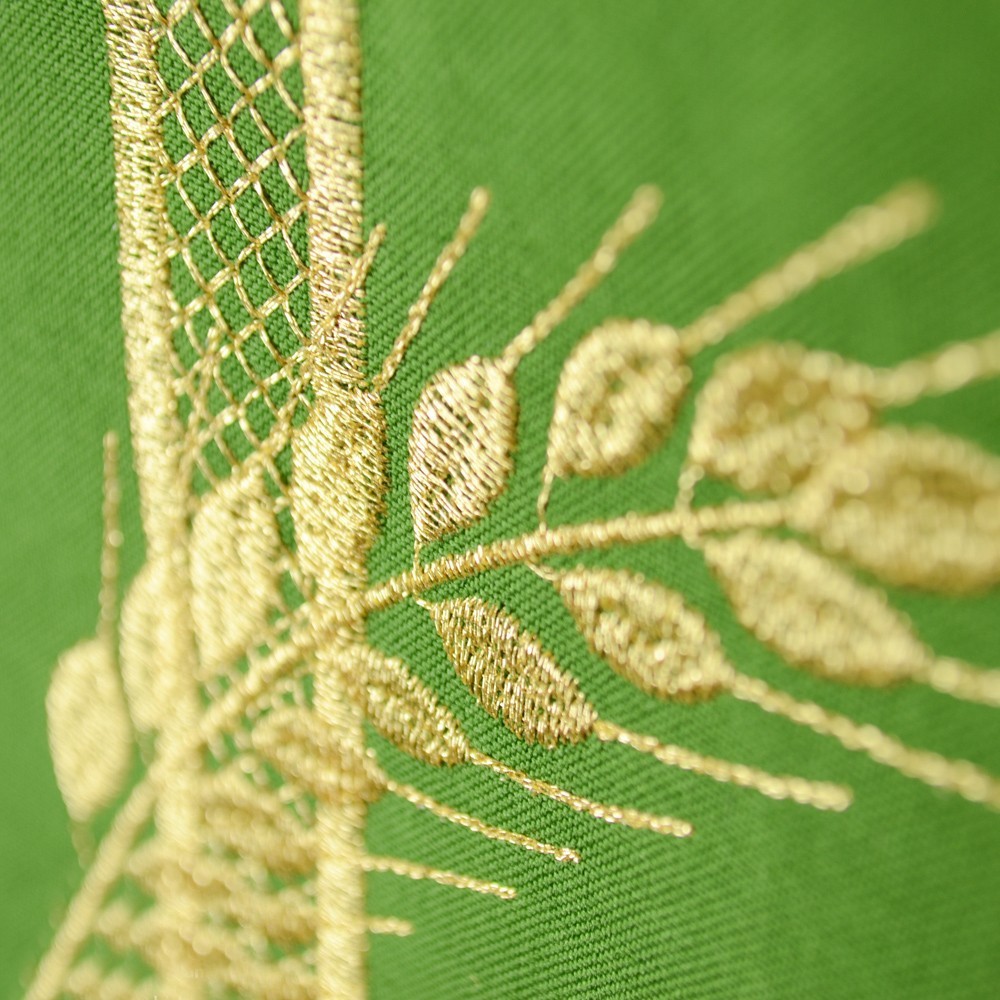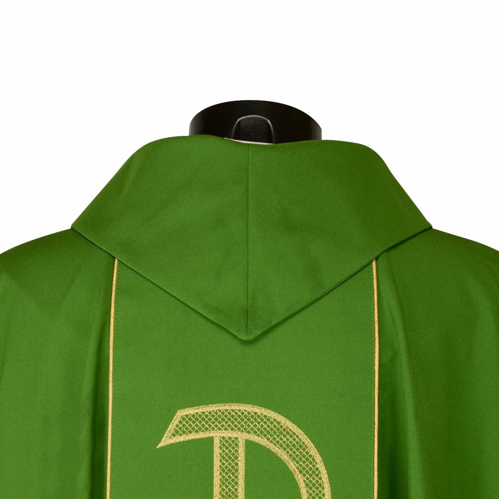 Graziosa casula per sacerdote di colore verde realizzata 80% poliestere e 20% Lana. Questo paramento si presenta con un ricco ricamo dorato Croce XP, Alfa e Omega. Bordata color oro. Completa di stola. La casula è realizzata con ottimi tessuti, garantendo la qualità. Corredata di scatola.