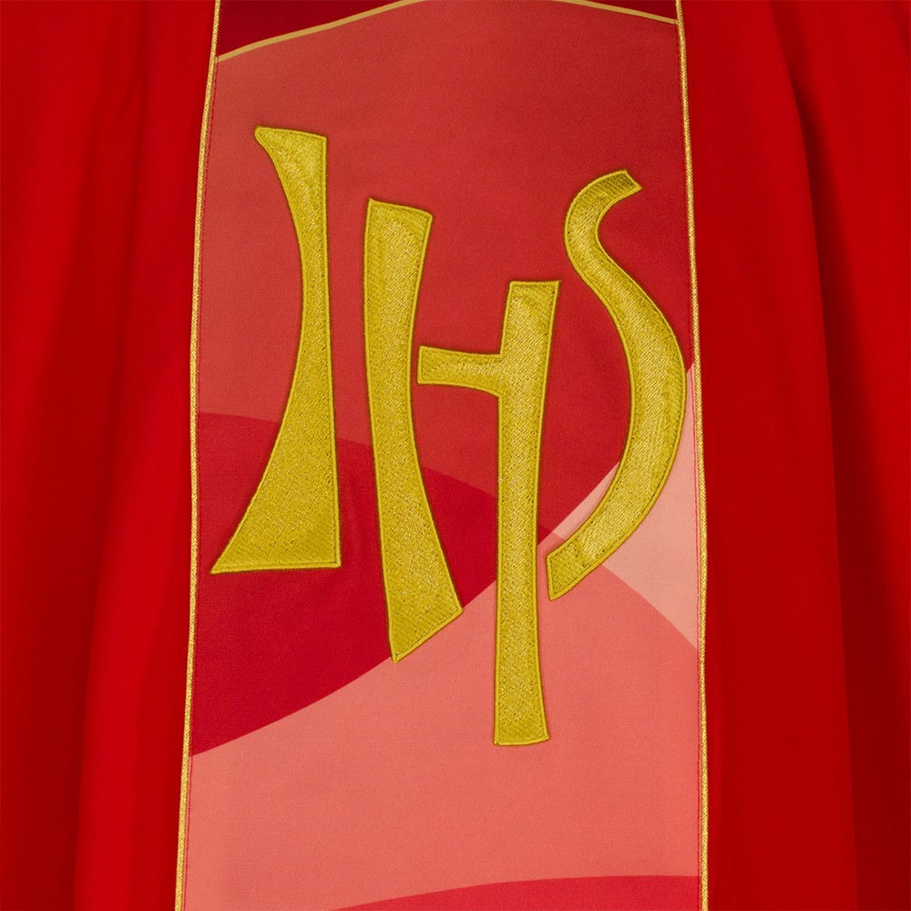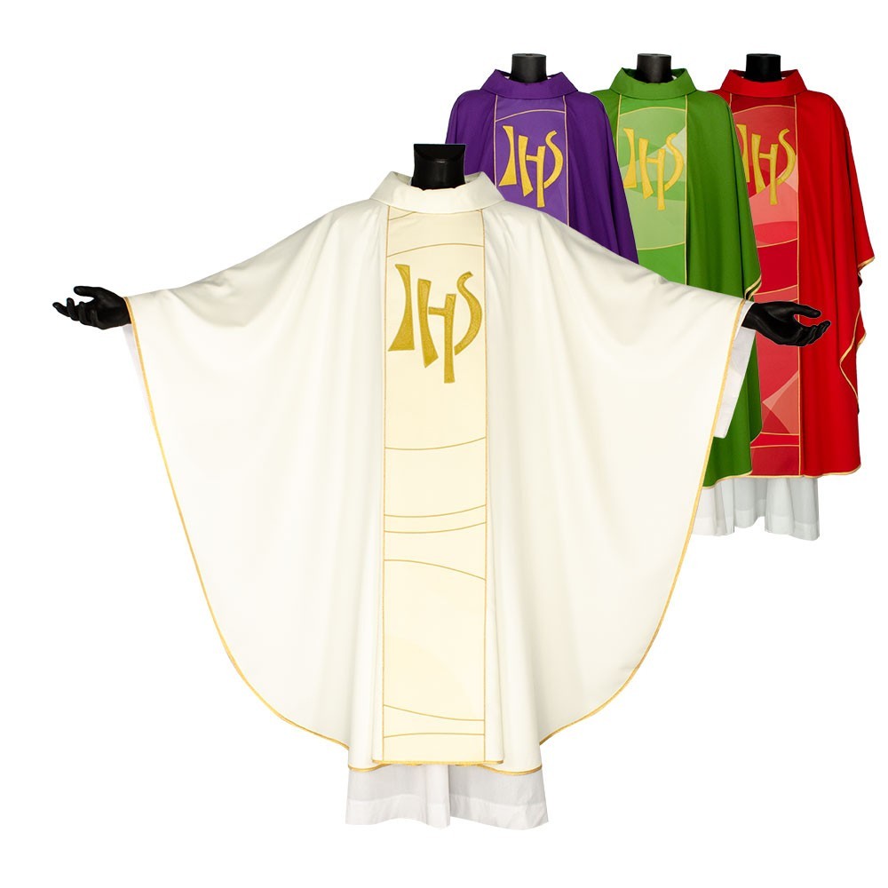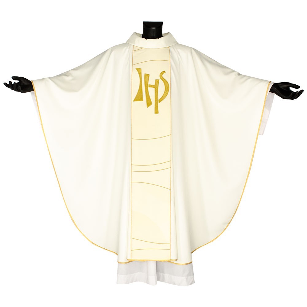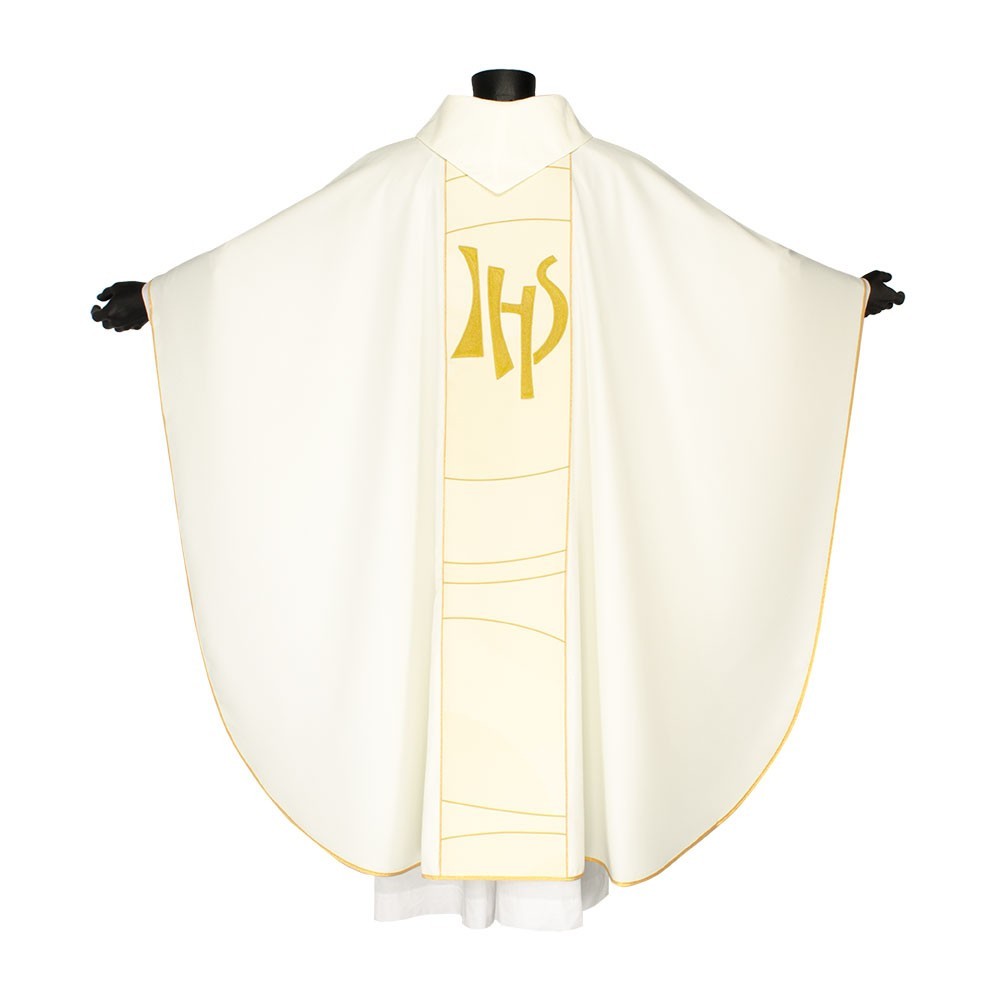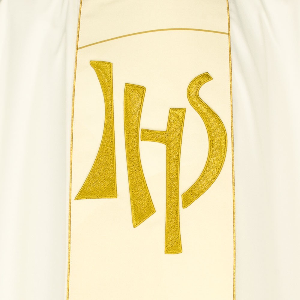 Casula liturgica in tessuto 20% Lana e 80% poliestere, con stolone e ricamo JHS. Il ricamo è realizzato finemente a macchina con grande precisione, i colori utilizzati rendono questo paramento molto elegante e luminoso. Rifinita con sbieco perimetrale dorato. Corredata di stola.