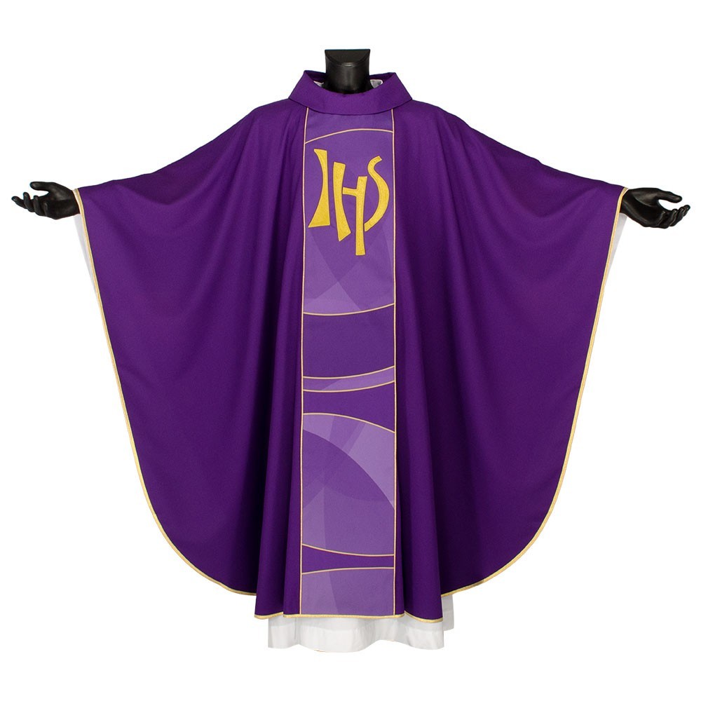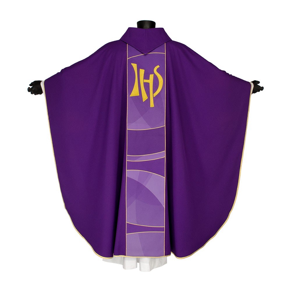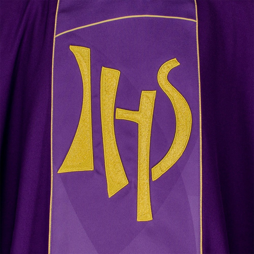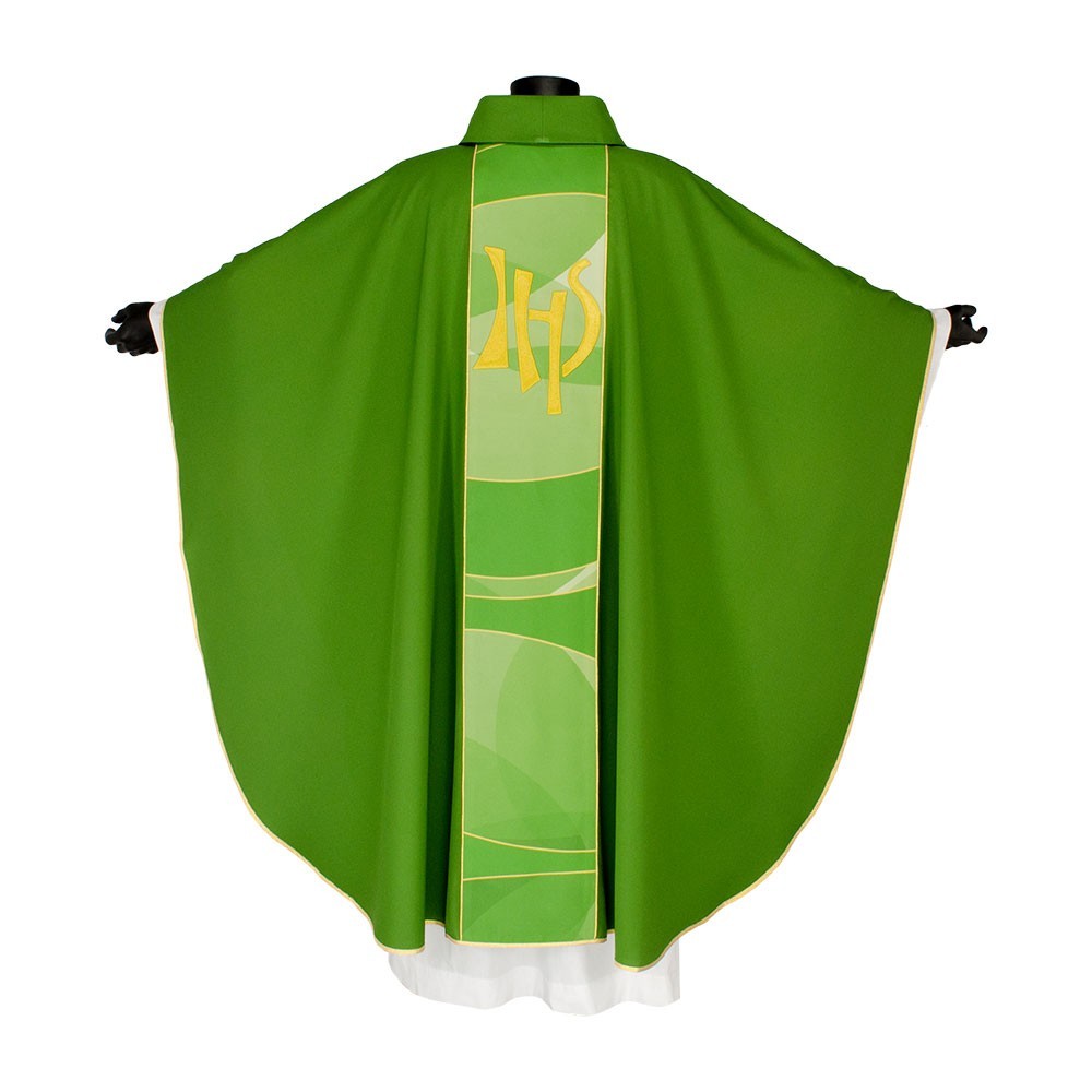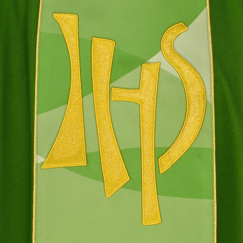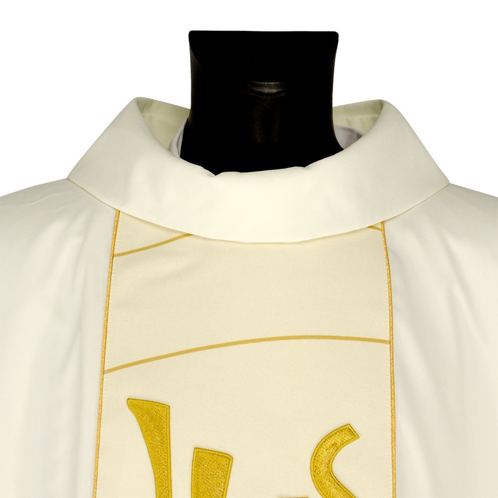 Casula liturgica in tessuto 20% Lana e 80% poliestere, con stolone e ricamo JHS. Il ricamo è realizzato finemente a macchina con grande precisione, i colori utilizzati rendono questo paramento molto elegante e luminoso. Rifinita con sbieco perimetrale dorato. Corredata di stola.
