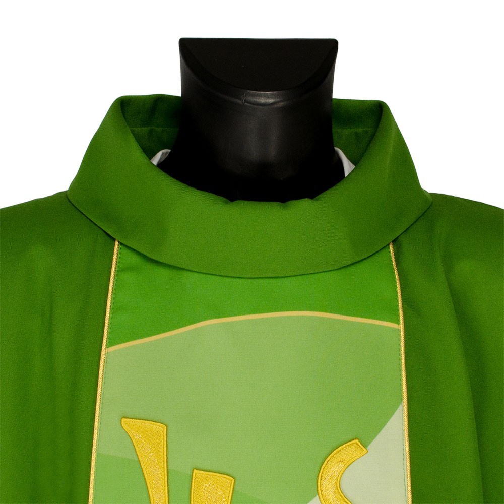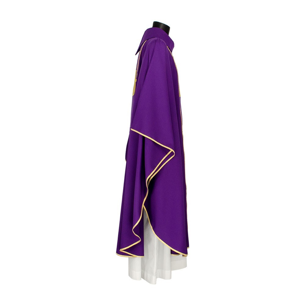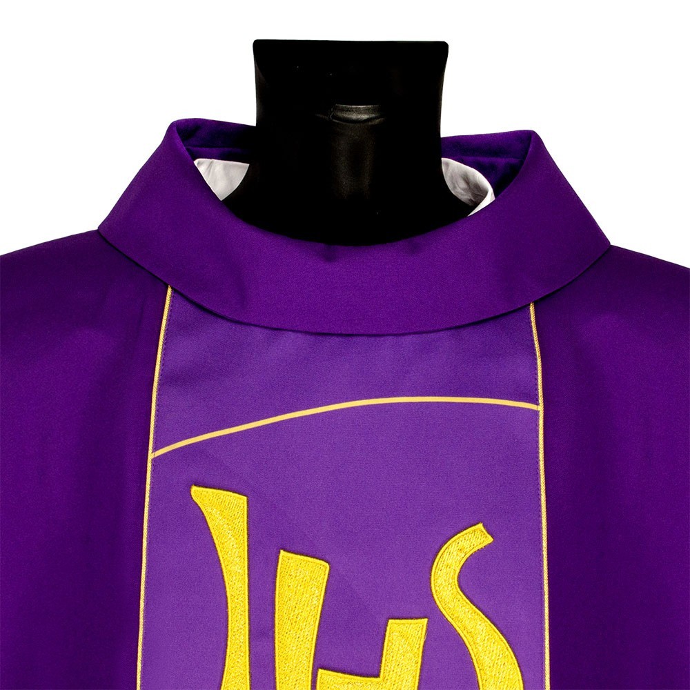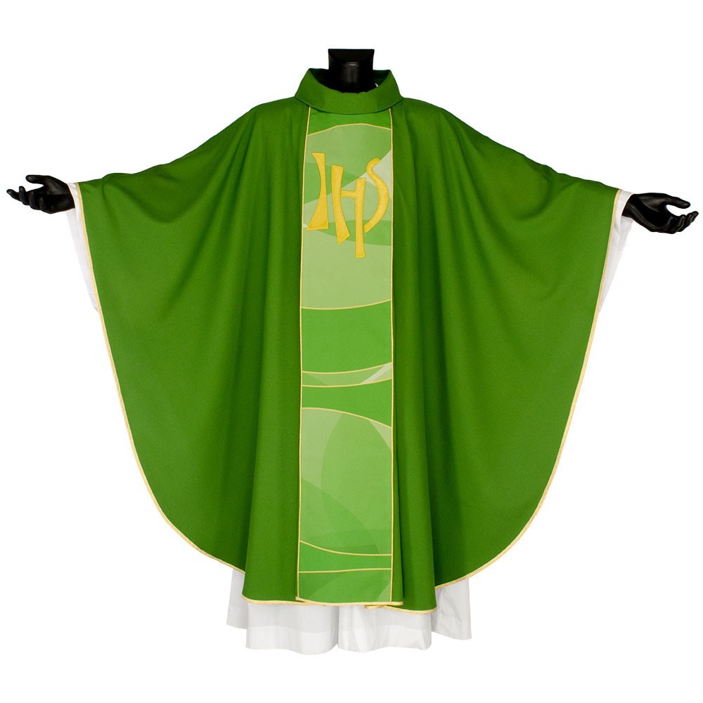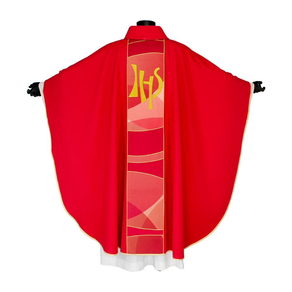 Casula liturgica in tessuto 20% Lana e 80% poliestere, con stolone e ricamo JHS. Il ricamo è realizzato finemente a macchina con grande precisione, i colori utilizzati rendono questo paramento molto elegante e luminoso. Rifinita con sbieco perimetrale dorato. Corredata di stola.