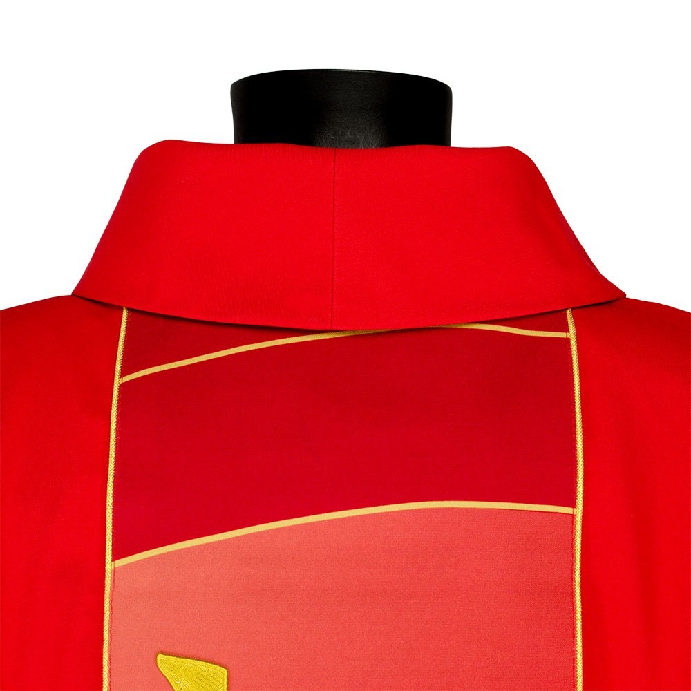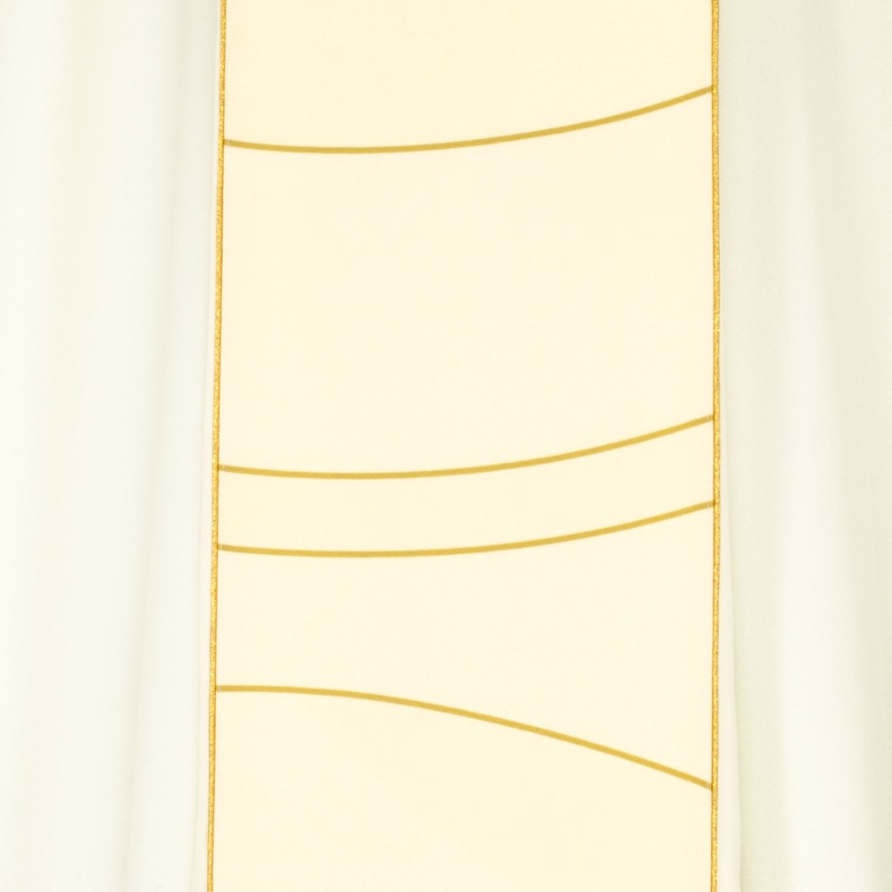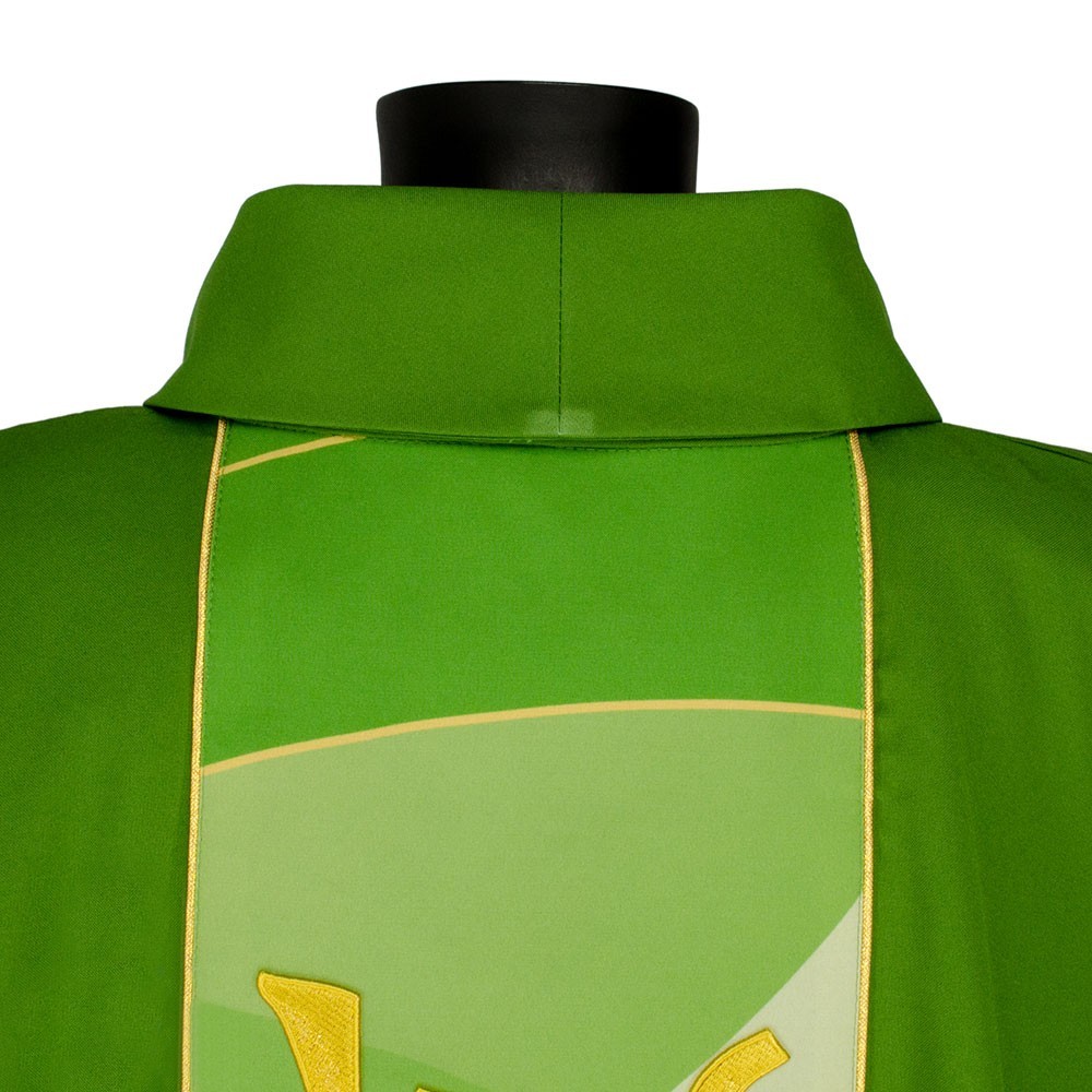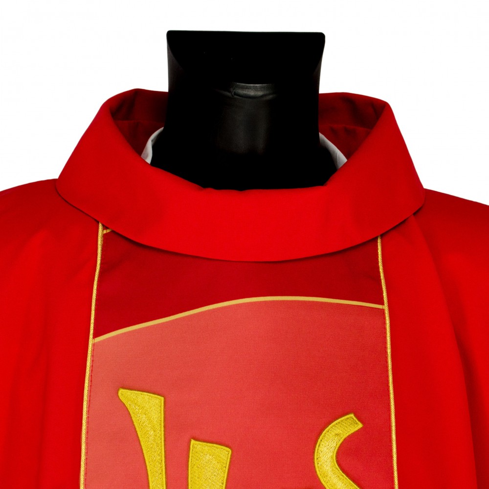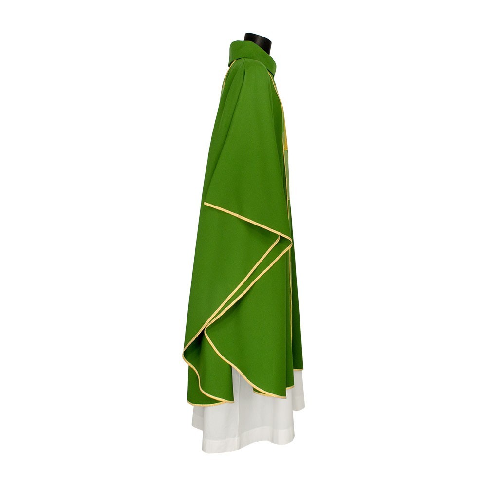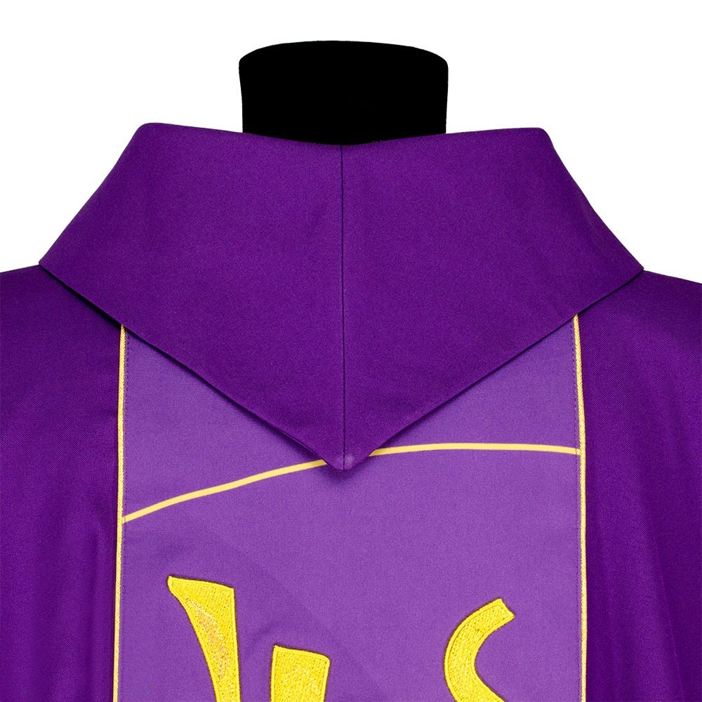 Casula liturgica in tessuto 20% Lana e 80% poliestere, con stolone e ricamo JHS. Il ricamo è realizzato finemente a macchina con grande precisione, i colori utilizzati rendono questo paramento molto elegante e luminoso. Rifinita con sbieco perimetrale dorato. Corredata di stola.