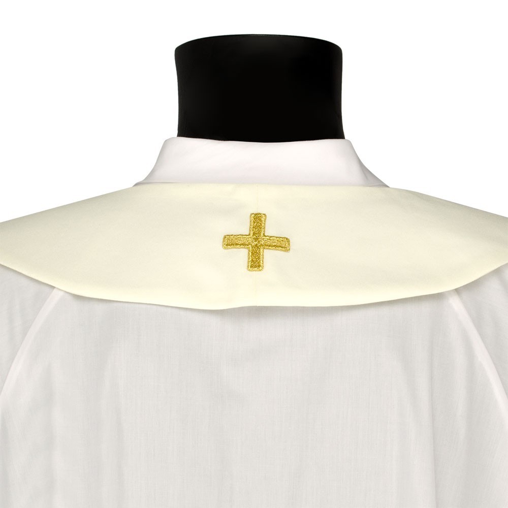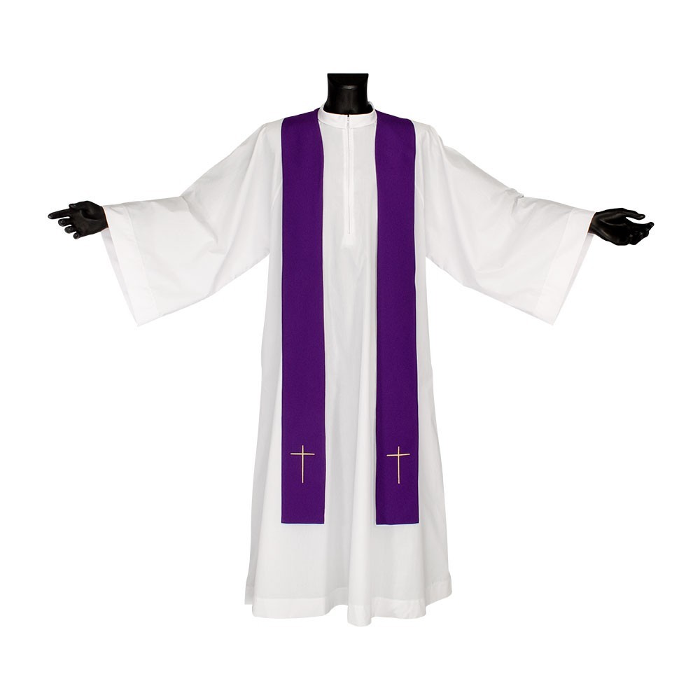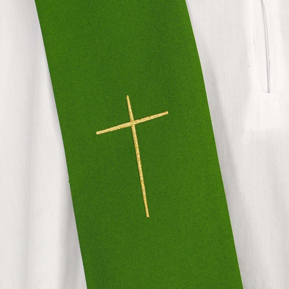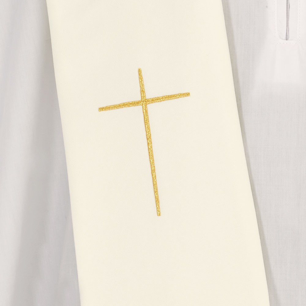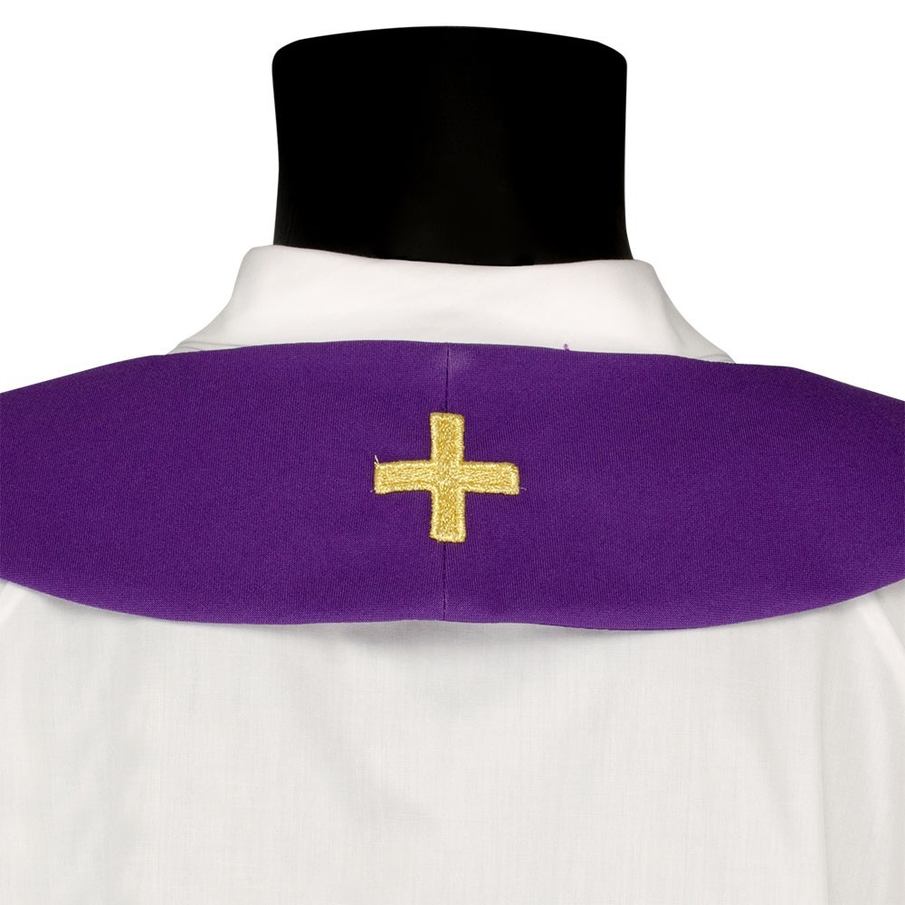 La casula è confezionata in tessuto misto con croci ricamate oro. Modello con collo ad anello e stola abbinata inclusa.