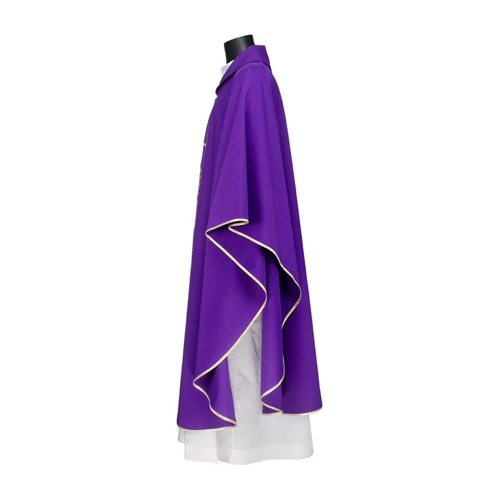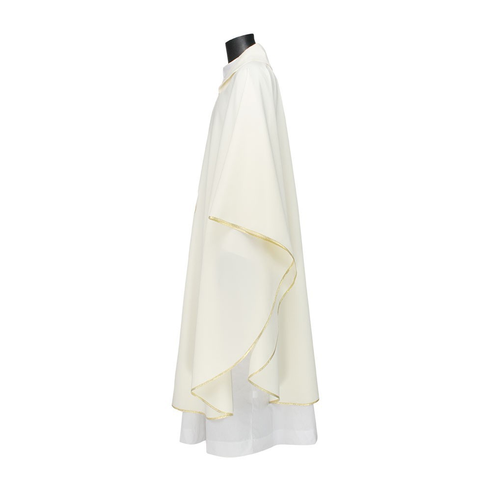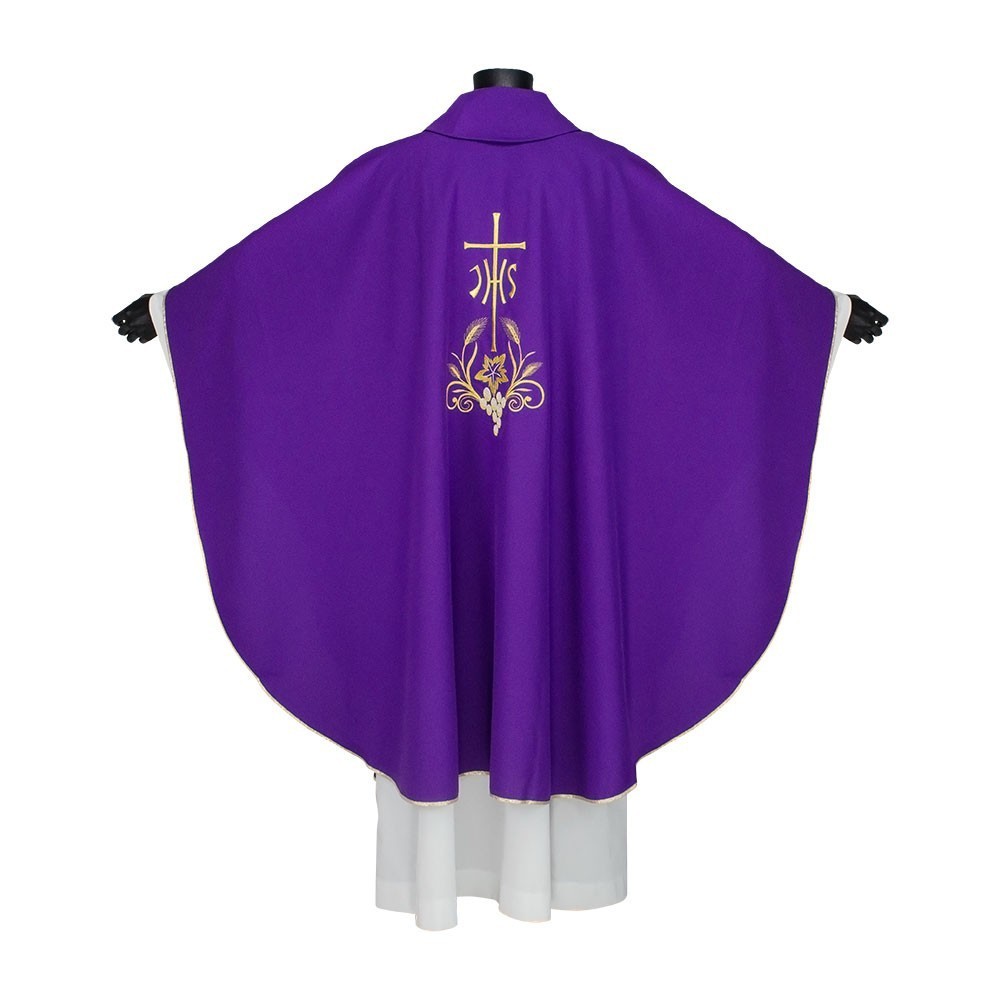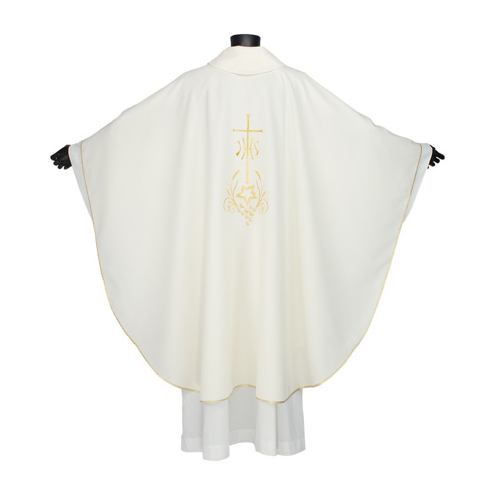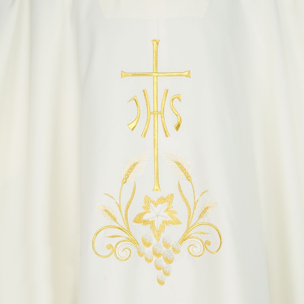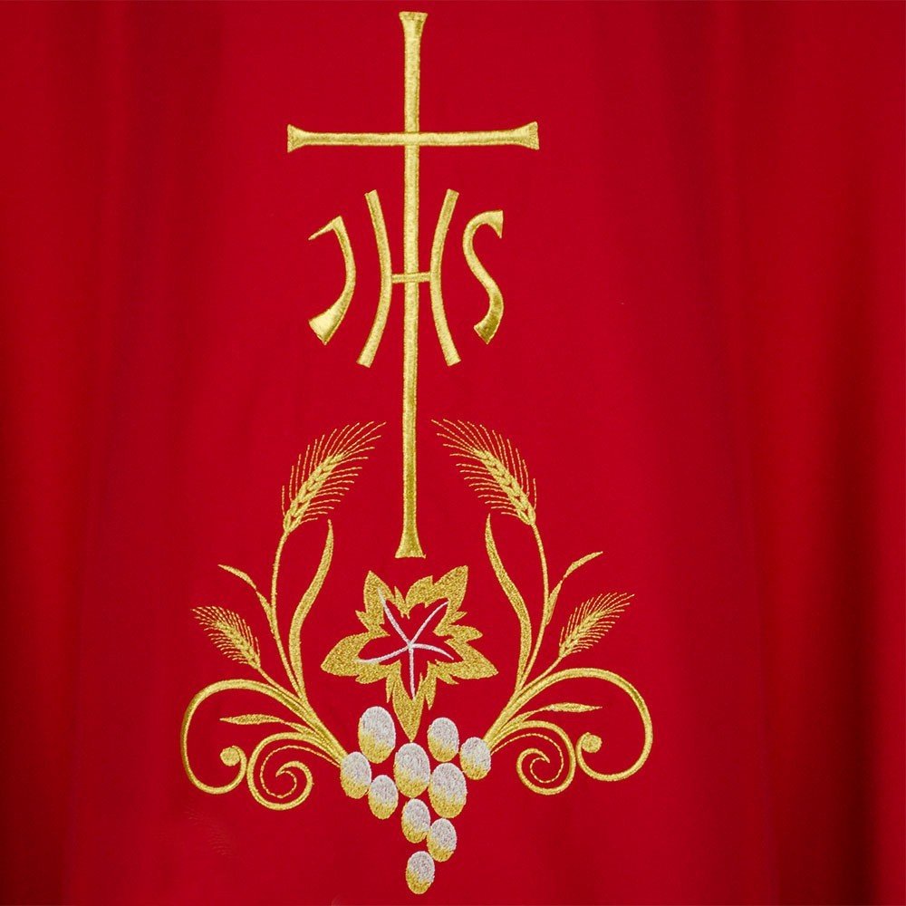 Il ricamo viene realizzato a macchina con alta precisione, presente sia sul fronte che sul retro. Rifinita con sbieco dorato lungo tutto il profilo della casula. Corredata di stola. Questo paramento sacro è prodotto da una sartoria italiana, confezionata in tessuto leggerissimo in poliestere.