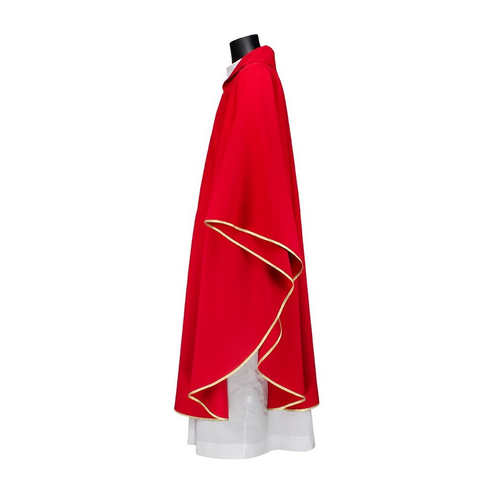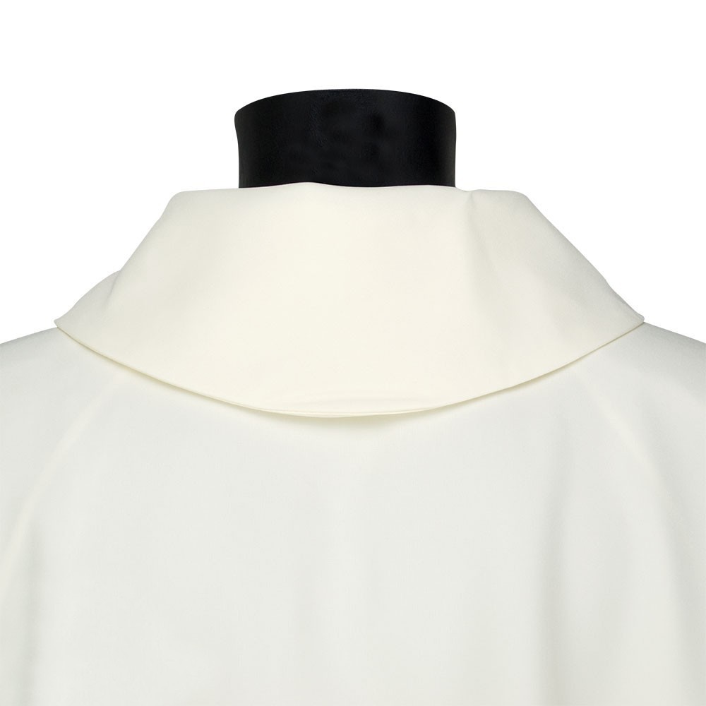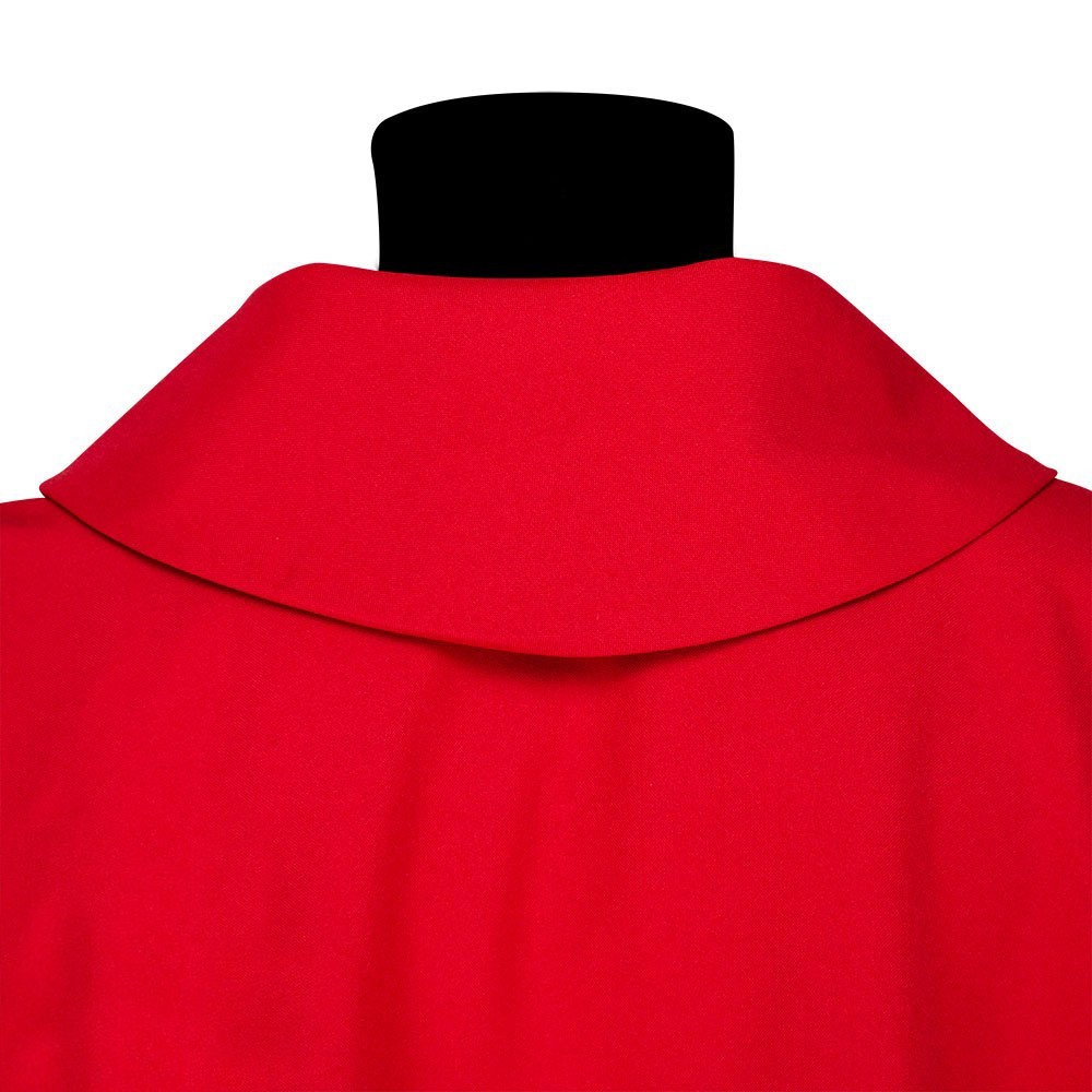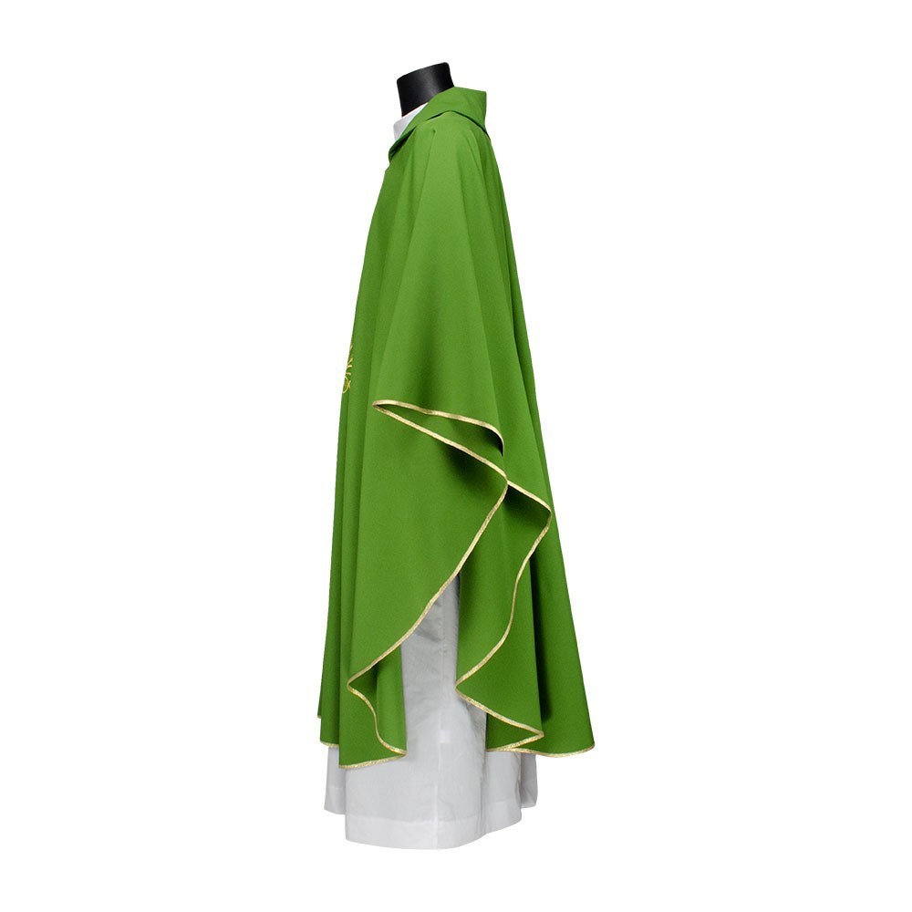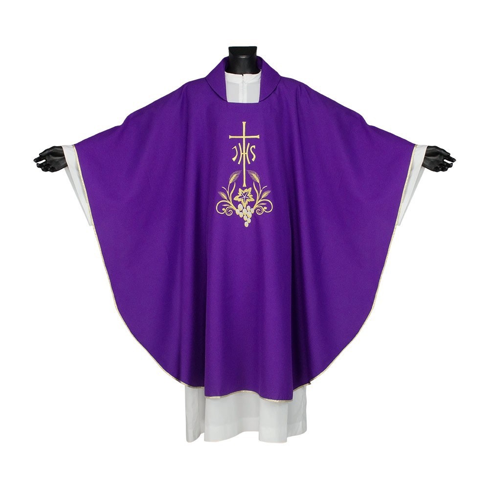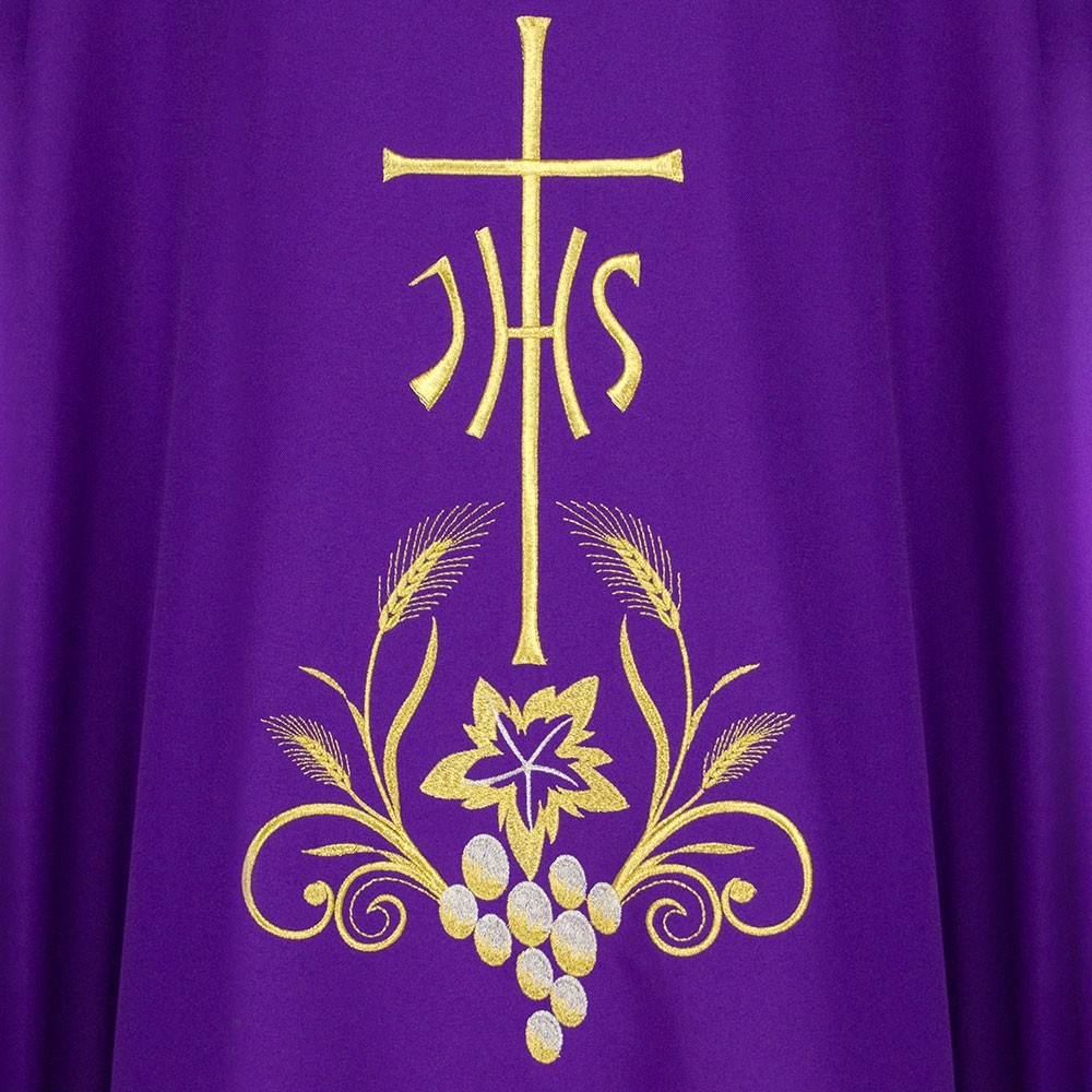 Il ricamo viene realizzato a macchina con alta precisione, presente sia sul fronte che sul retro. Rifinita con sbieco dorato lungo tutto il profilo della casula. Corredata di stola. Questo paramento sacro è prodotto da una sartoria italiana, confezionata in tessuto leggerissimo in poliestere.