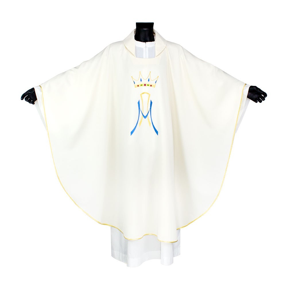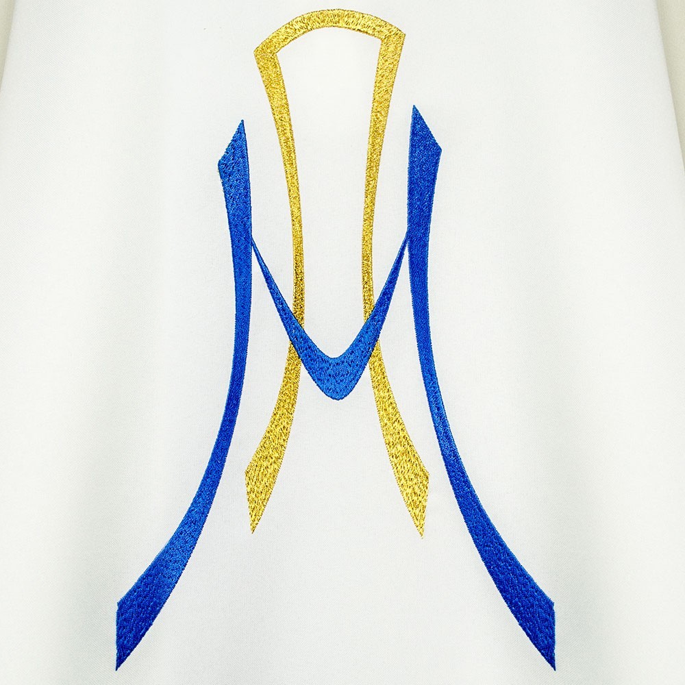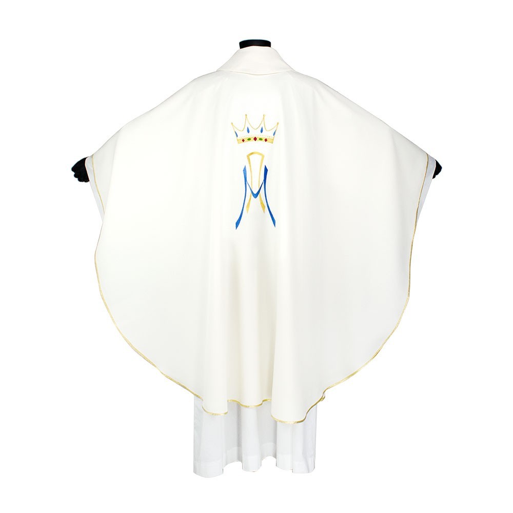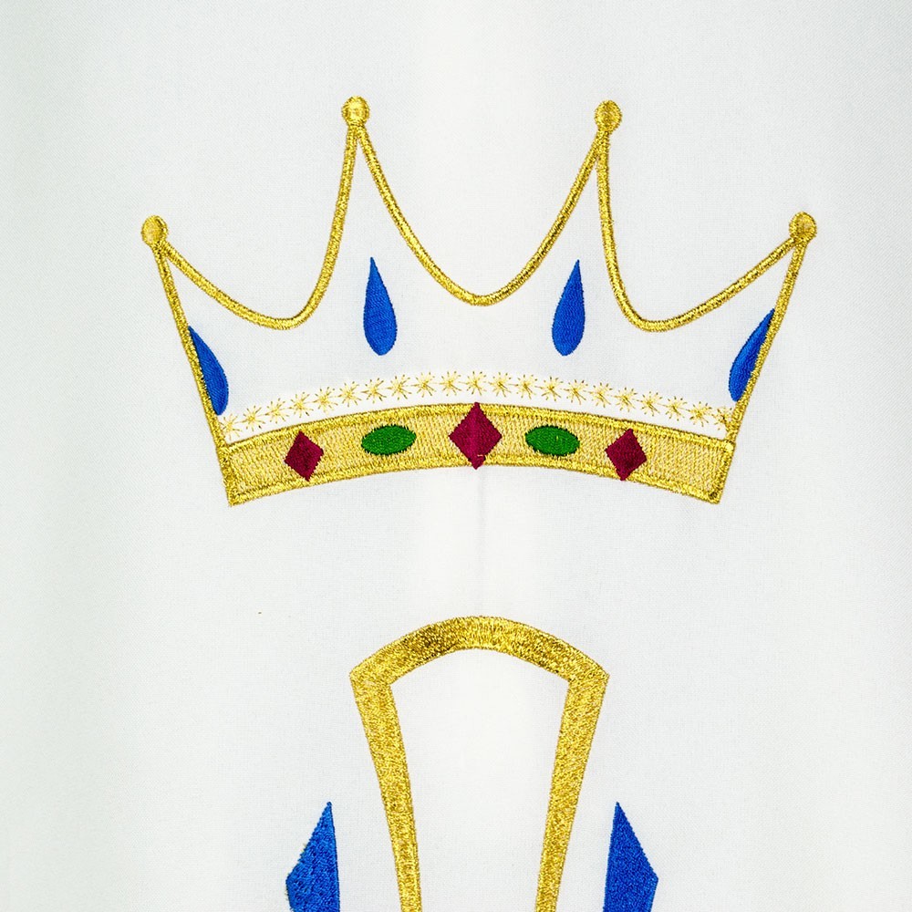 Casula mariana realizzata in leggero e resistente tessuto poliestere. Il ricamo raffigura le simbologie liturgiche mariane, viene eseguito a macchina ed è presente sia sul lato anteriore che sul quello posteriore.