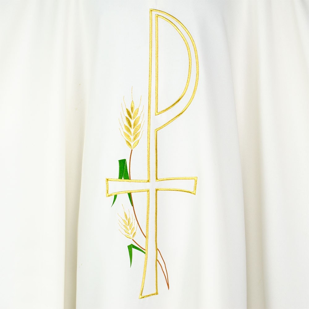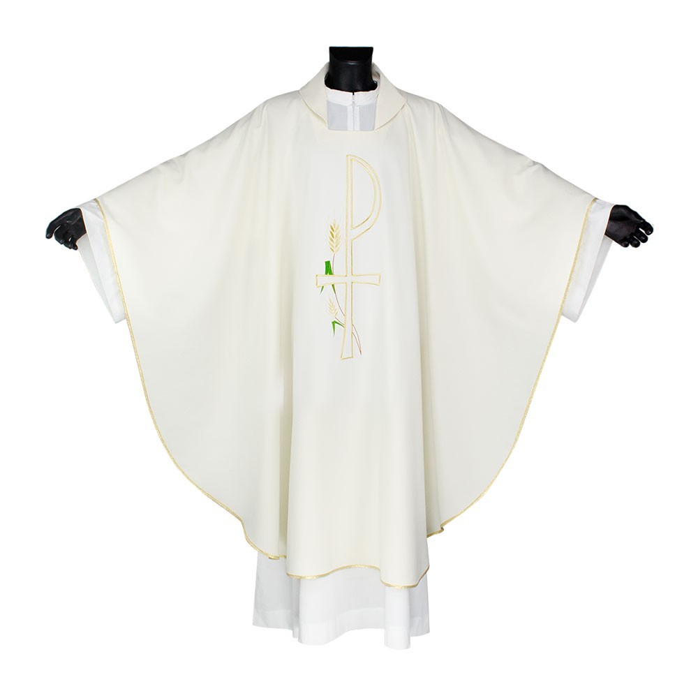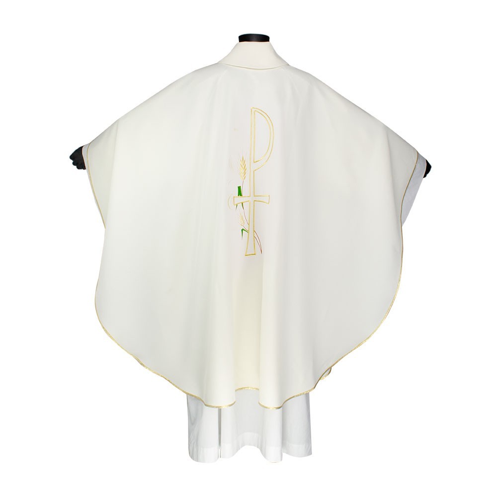 In fresco e leggero tessuto in poliestere. Questa veste liturgica è finemente ricamata, presente sia sul fronte che sul retro. Taglio classico e rifinita con sbieco perimetrale dorato. Completa di stola. La casula è prodotta interamente in Italia, garantendo tessuti dio ottima qualità.