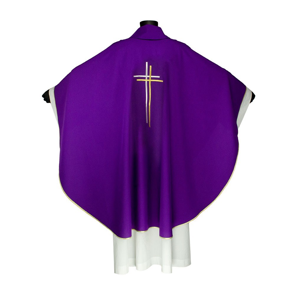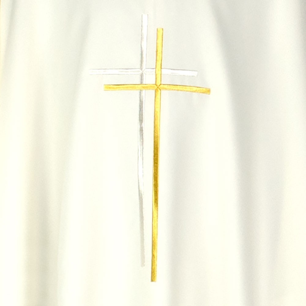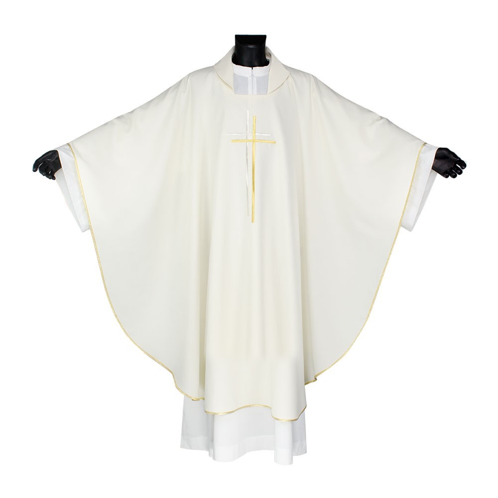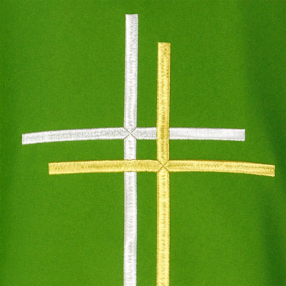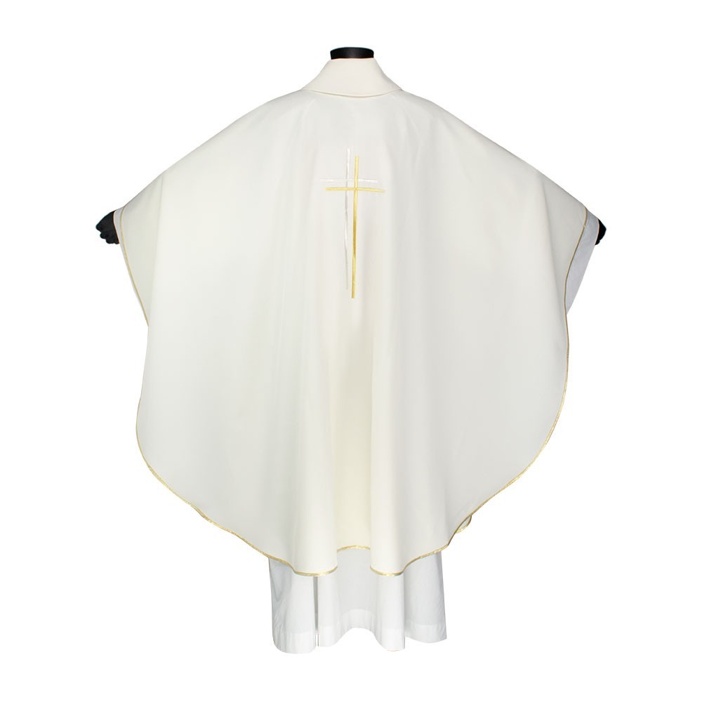 Confezionata in leggero e fresco tessuto in poliestere, rifinita con sbieco dorato. Il ricamo realizzato a macchina raffigura due croci sovrapposte di colore bianco e oro, presente sia sul lato anteriore che su quello posteriore.e. Corredata di stola abbinata. Ottima anche per uso ordinario.