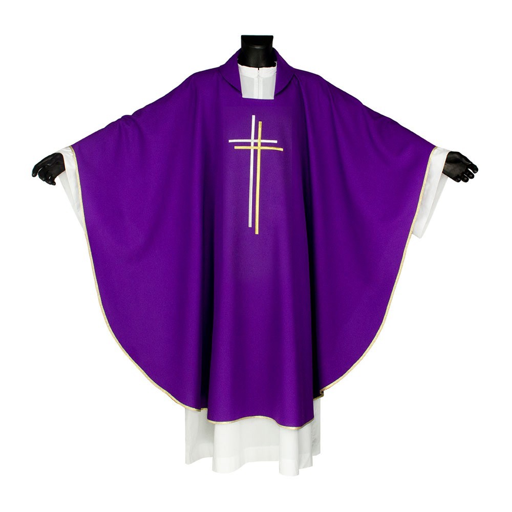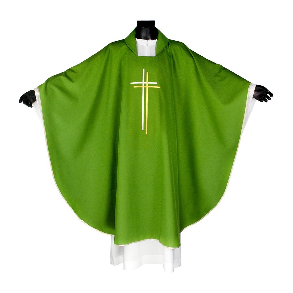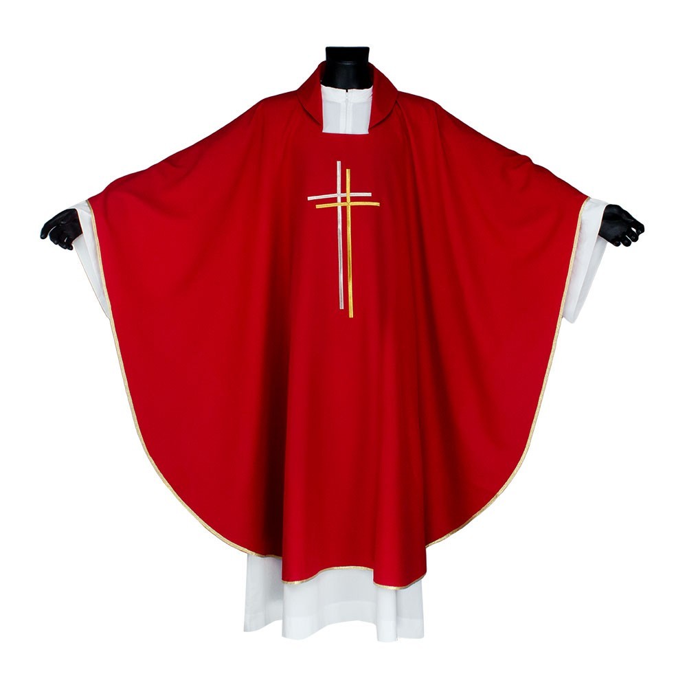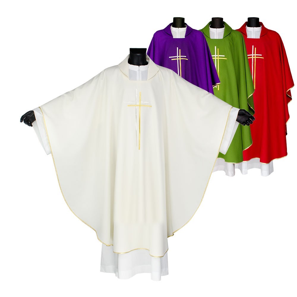 Confezionata in leggero e fresco tessuto in poliestere, rifinita con sbieco dorato. Il ricamo realizzato a macchina raffigura due croci sovrapposte di colore bianco e oro, presente sia sul lato anteriore che su quello posteriore.e. Corredata di stola abbinata. Ottima anche per uso ordinario.