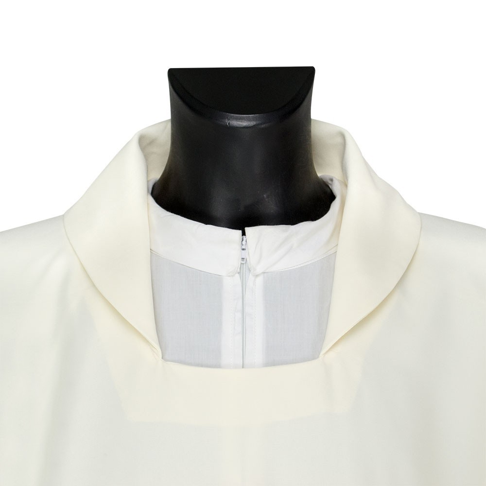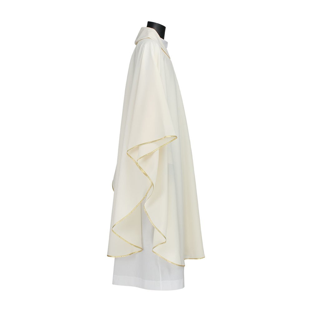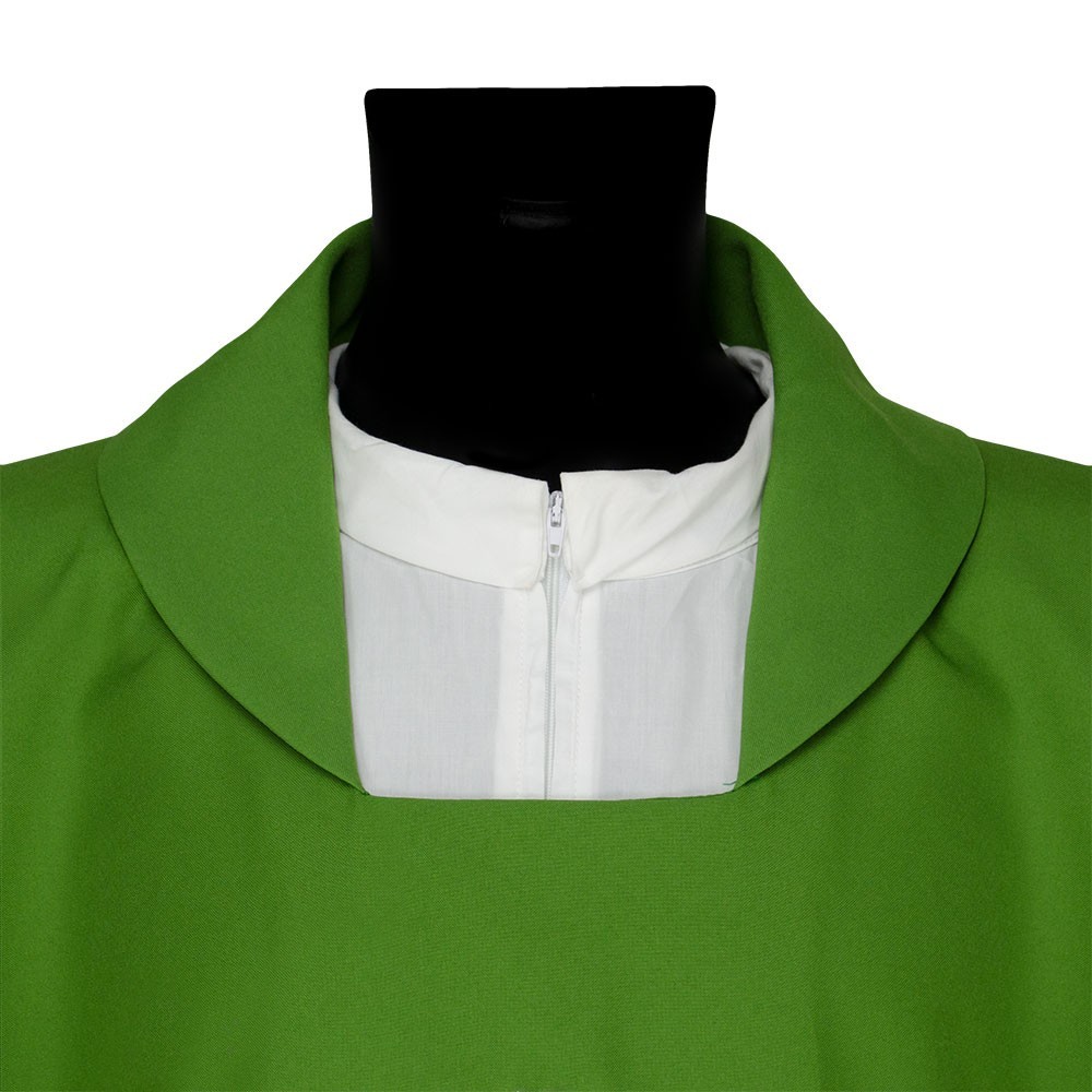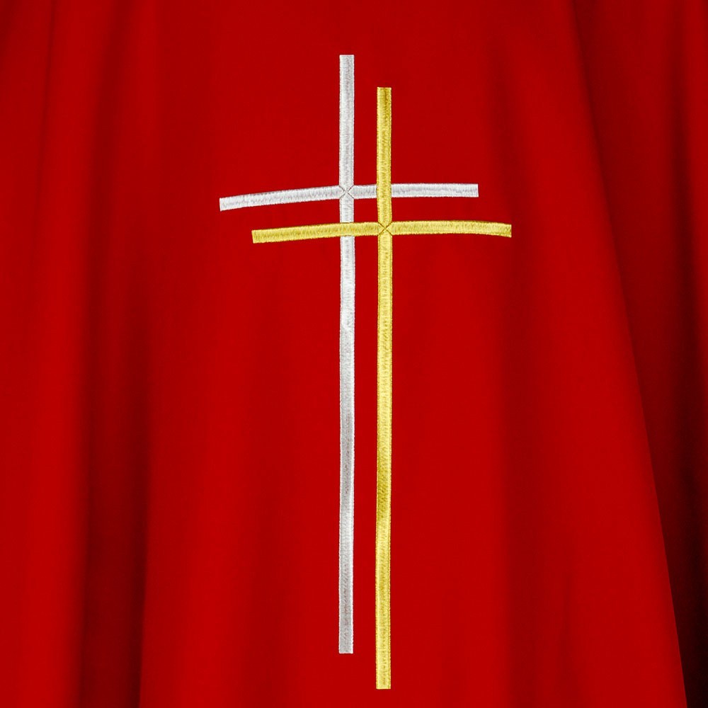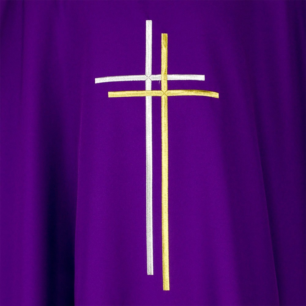 Confezionata in leggero e fresco tessuto in poliestere, rifinita con sbieco dorato. Il ricamo realizzato a macchina raffigura due croci sovrapposte di colore bianco e oro, presente sia sul lato anteriore che su quello posteriore.e. Corredata di stola abbinata. Ottima anche per uso ordinario.