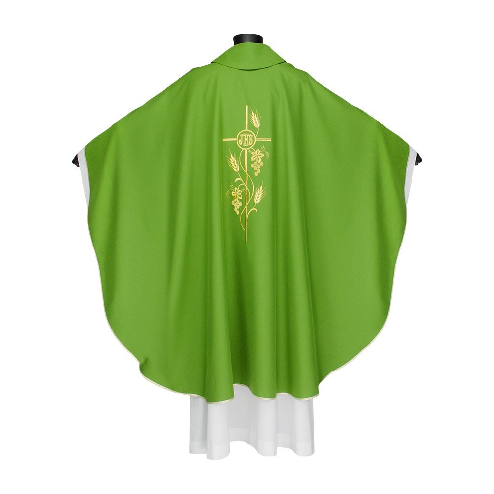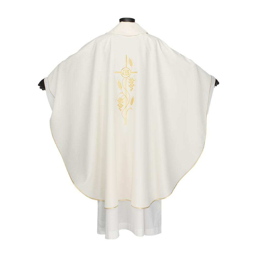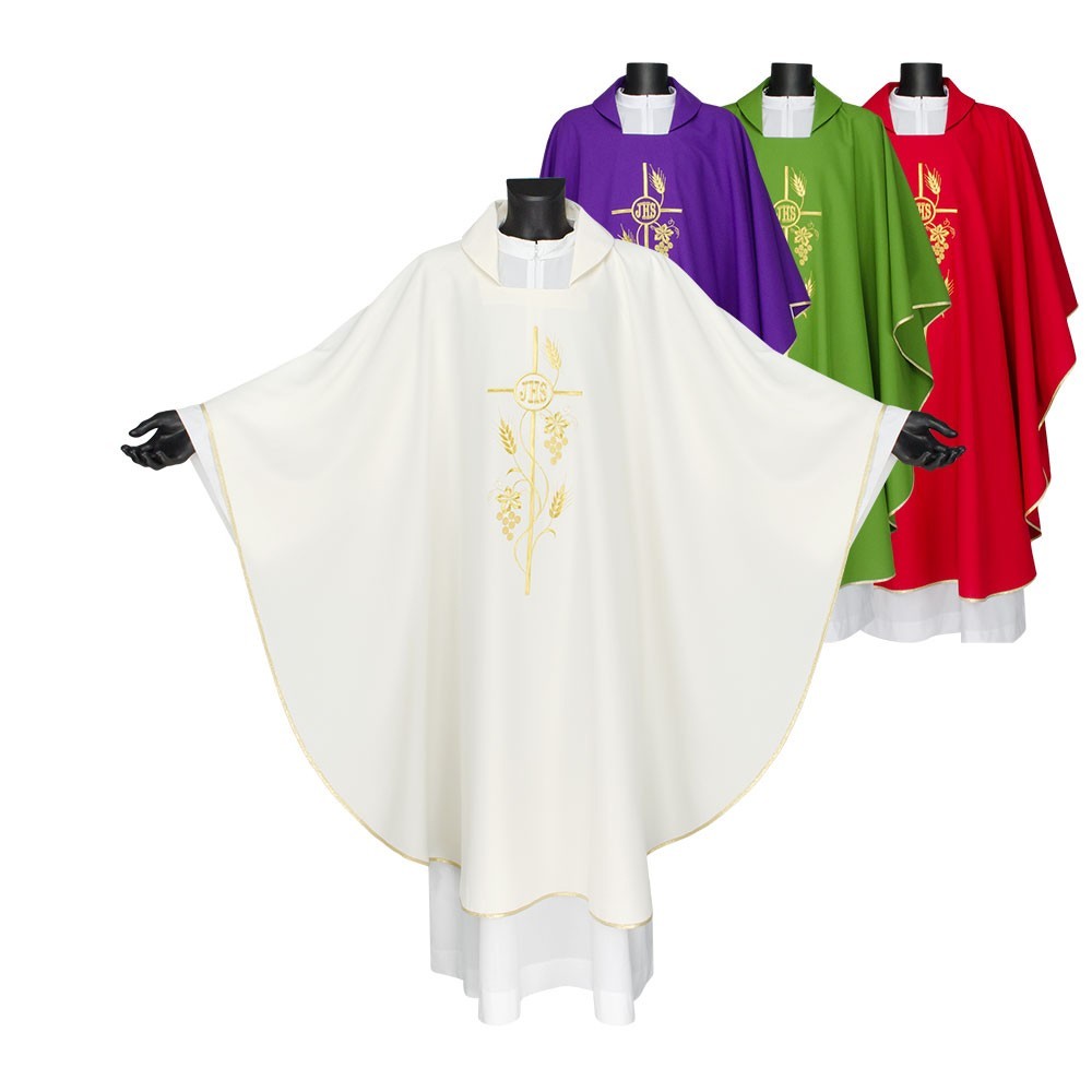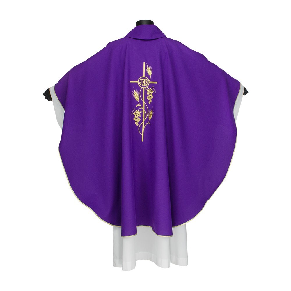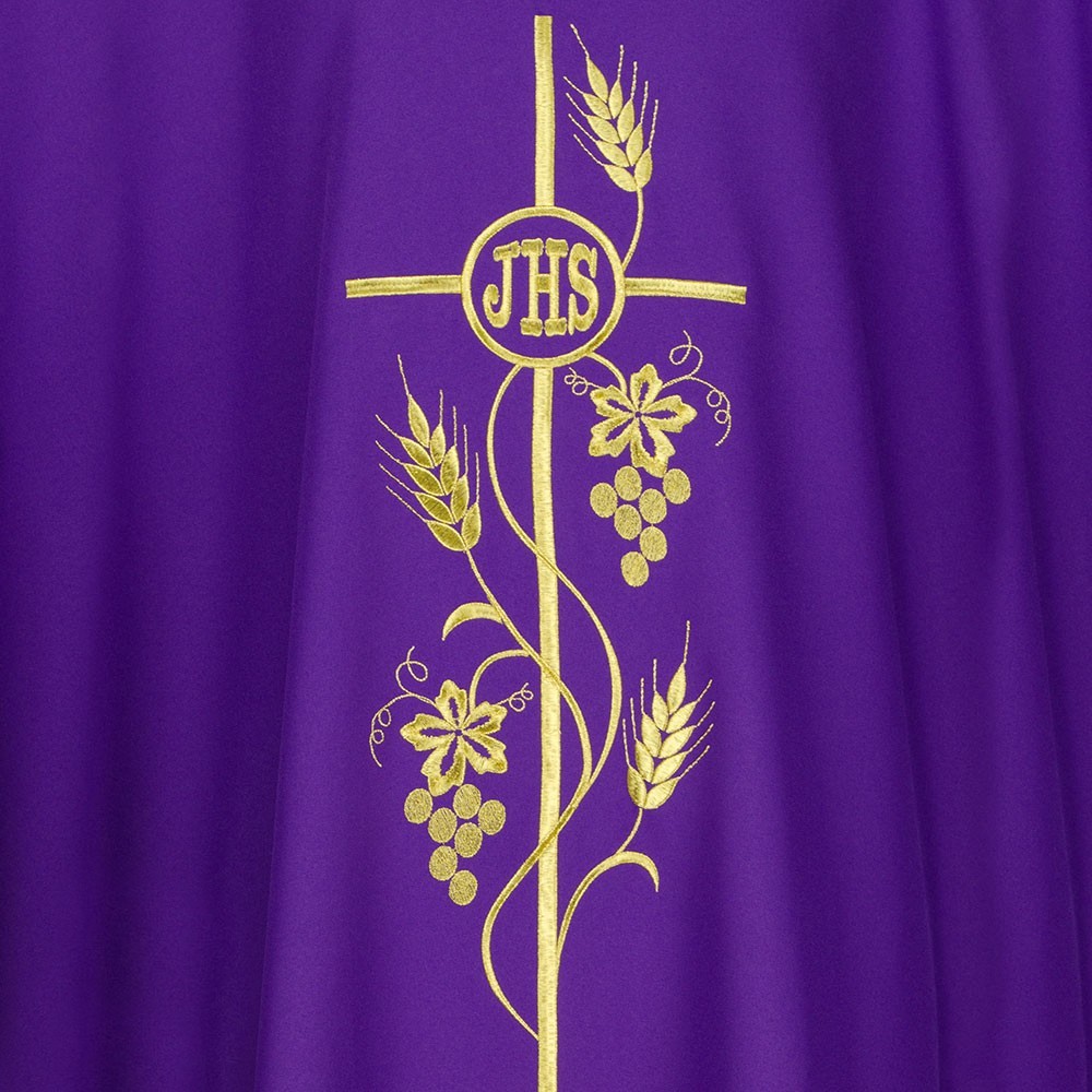Casula 100% poliestere disponibile nei quattro colori liturgici. Questo paramento sacro presenta un ricco ricamo in oro posto al centro, raffigurante una croce intrecciata da spighe e scritta JHS. Il ricamo viene realizzato a macchina ed è presente sia sul lato anteriore che su quello posteriore. Viene fornita di stola abbinata. Indicata per uso ordinario e quotidiano.