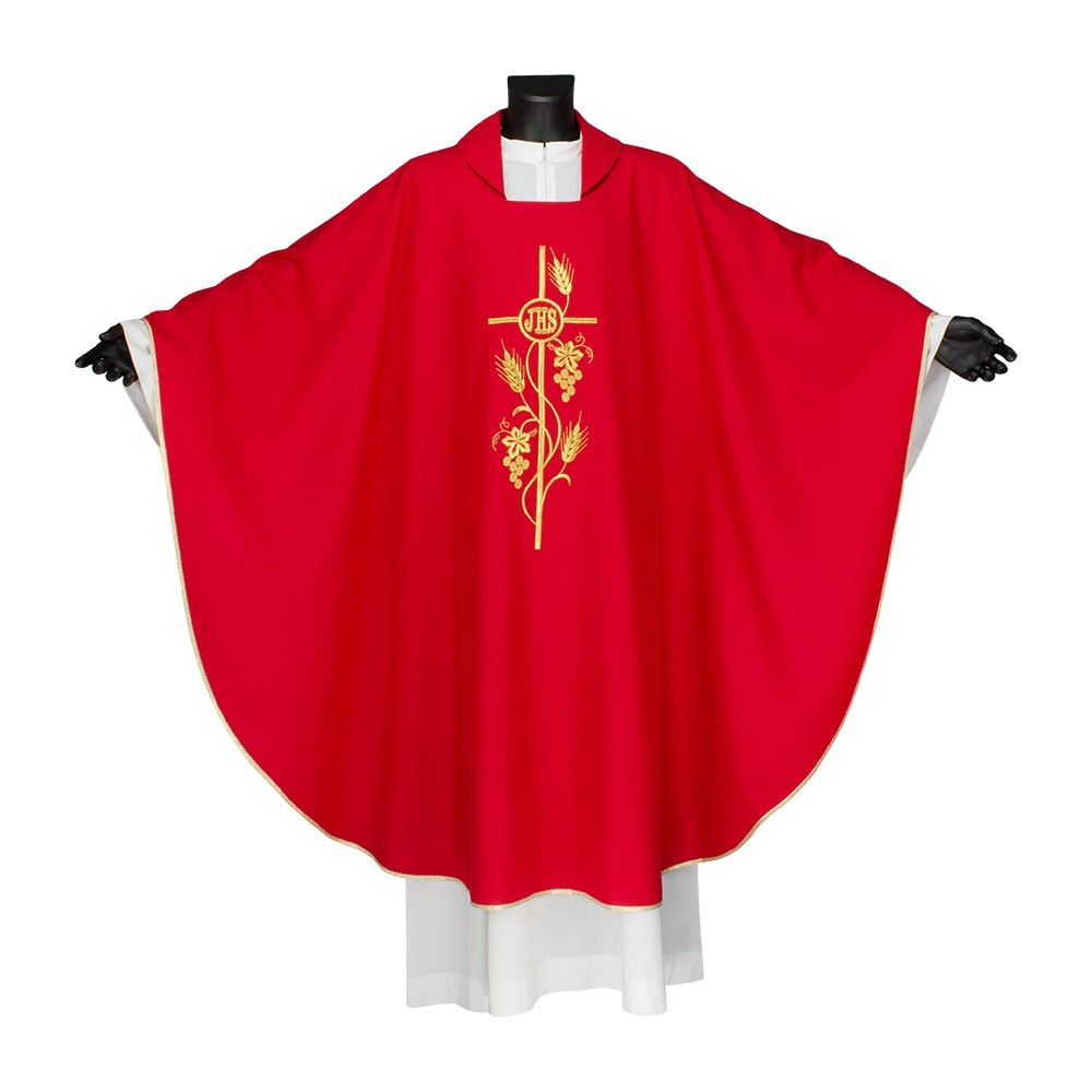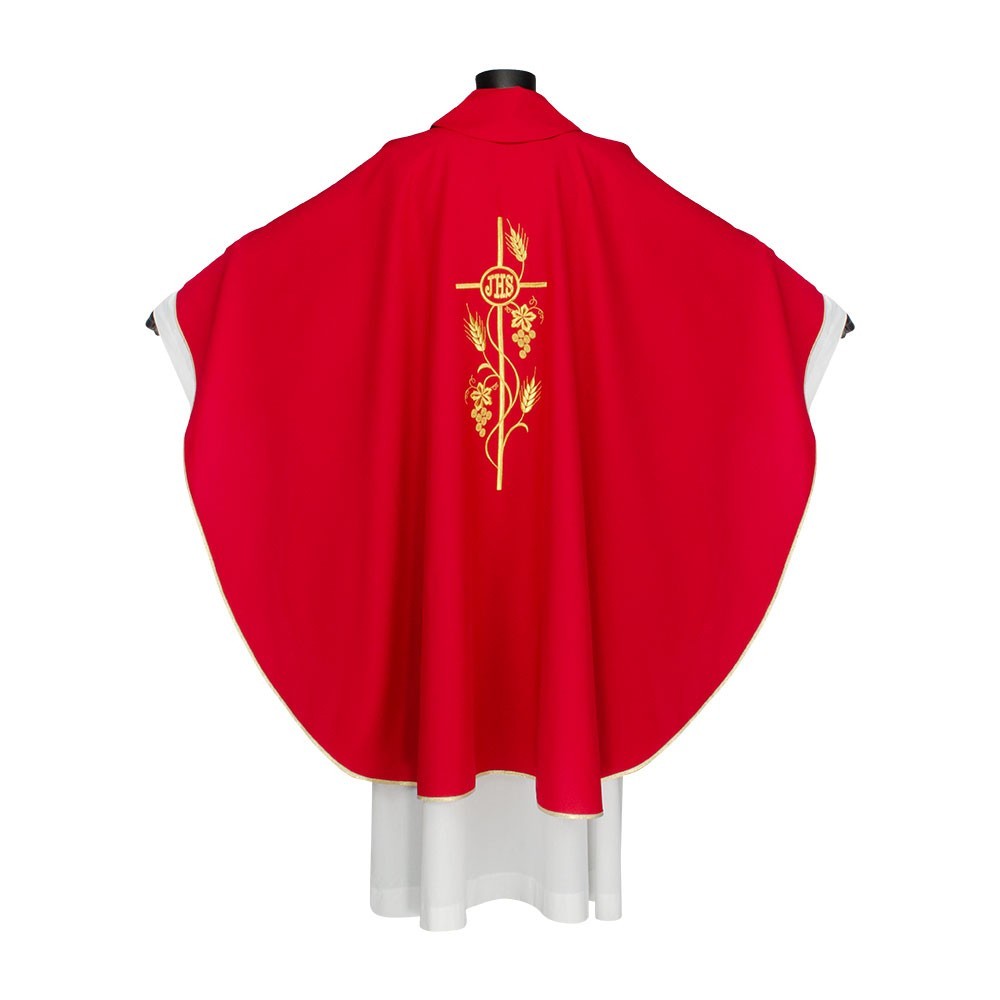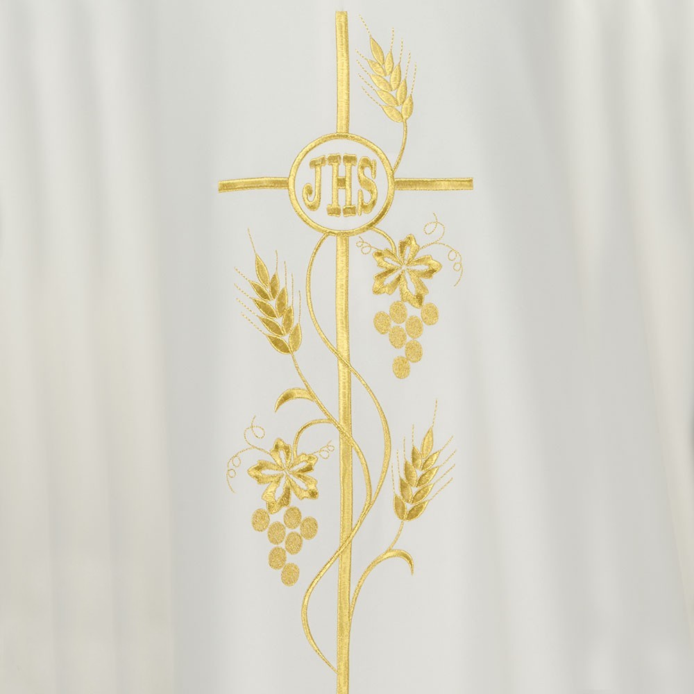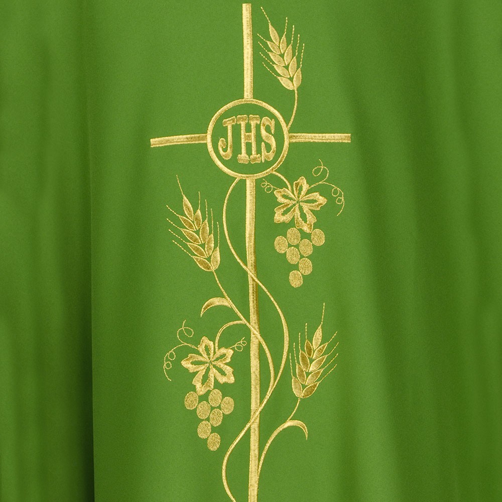 Casula 100% poliestere disponibile nei quattro colori liturgici. Questo paramento sacro presenta un ricco ricamo in oro posto al centro, raffigurante una croce intrecciata da spighe e scritta JHS. Il ricamo viene realizzato a macchina ed è presente sia sul lato anteriore che su quello posteriore. Viene fornita di stola abbinata. Indicata per uso ordinario e quotidiano.