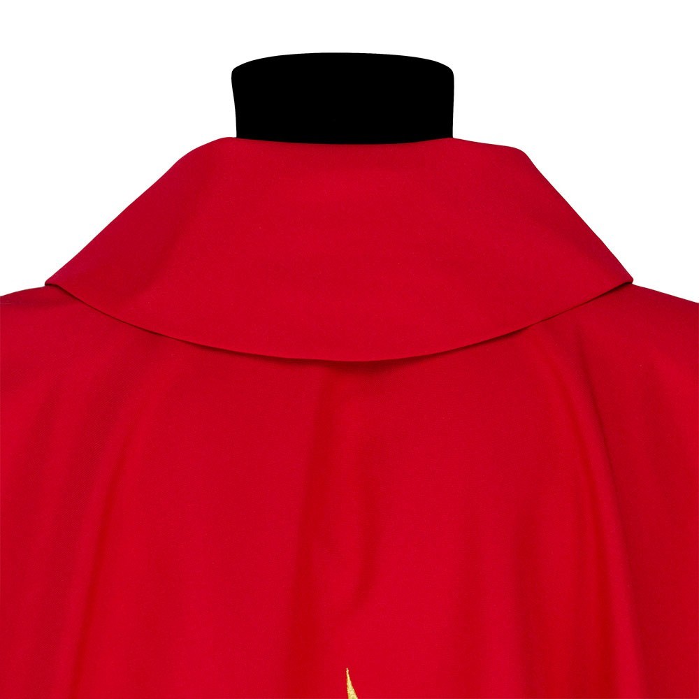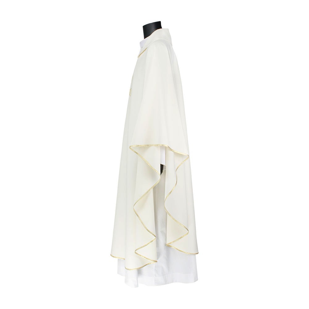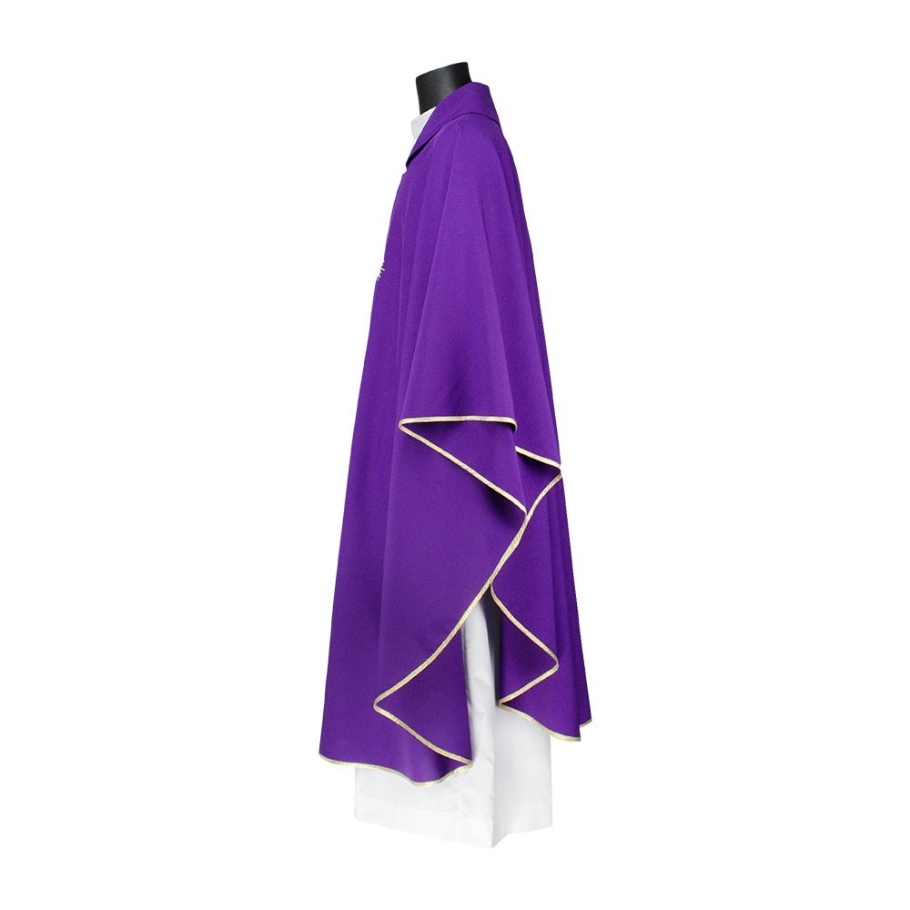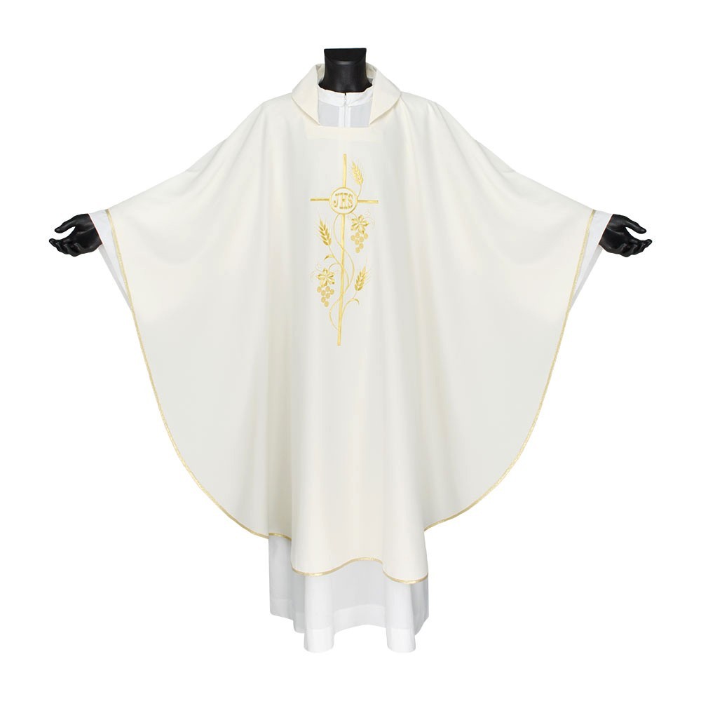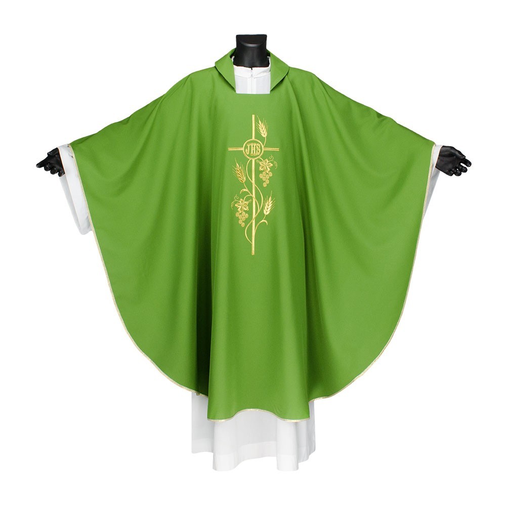 Casula 100% poliestere disponibile nei quattro colori liturgici. Questo paramento sacro presenta un ricco ricamo in oro posto al centro, raffigurante una croce intrecciata da spighe e scritta JHS. Il ricamo viene realizzato a macchina ed è presente sia sul lato anteriore che su quello posteriore. Viene fornita di stola abbinata. Indicata per uso ordinario e quotidiano.
