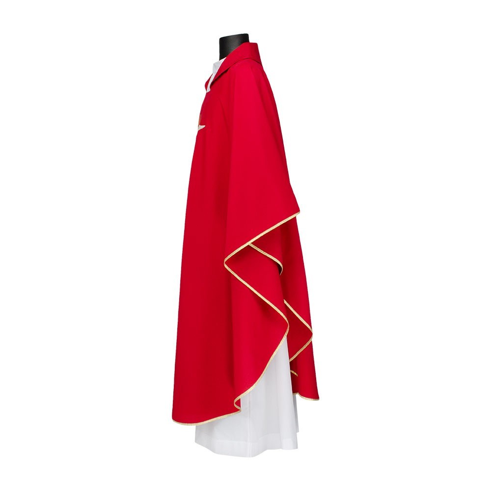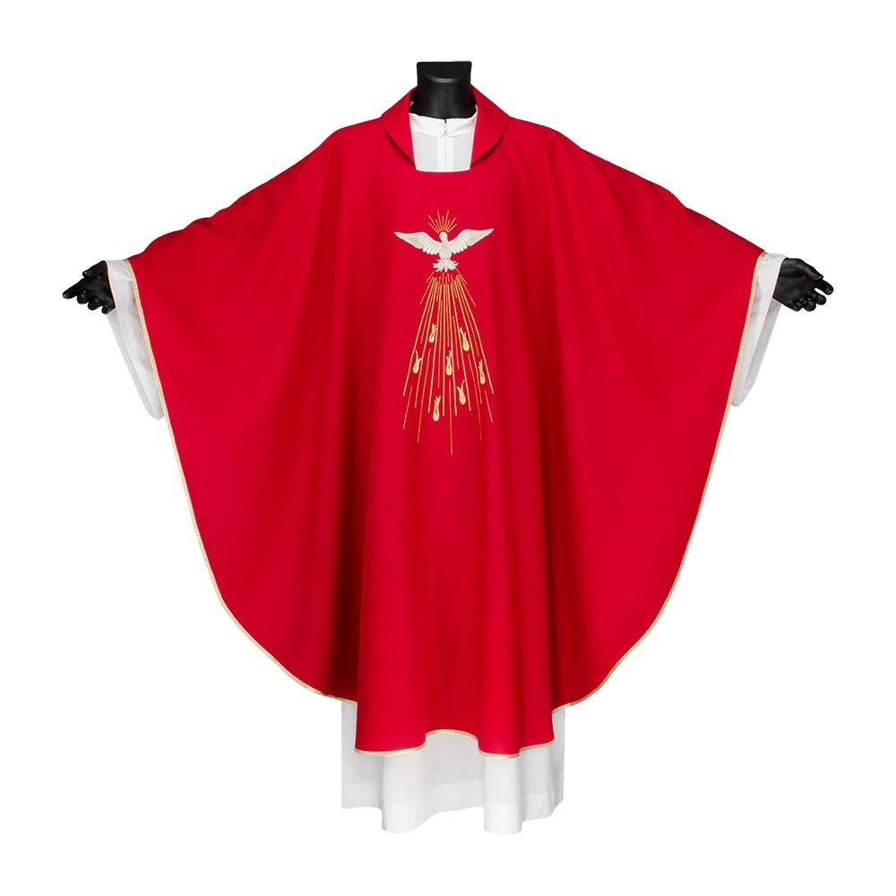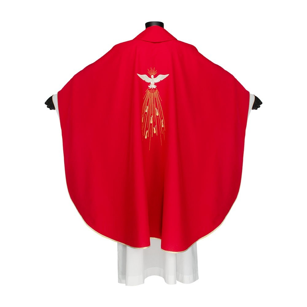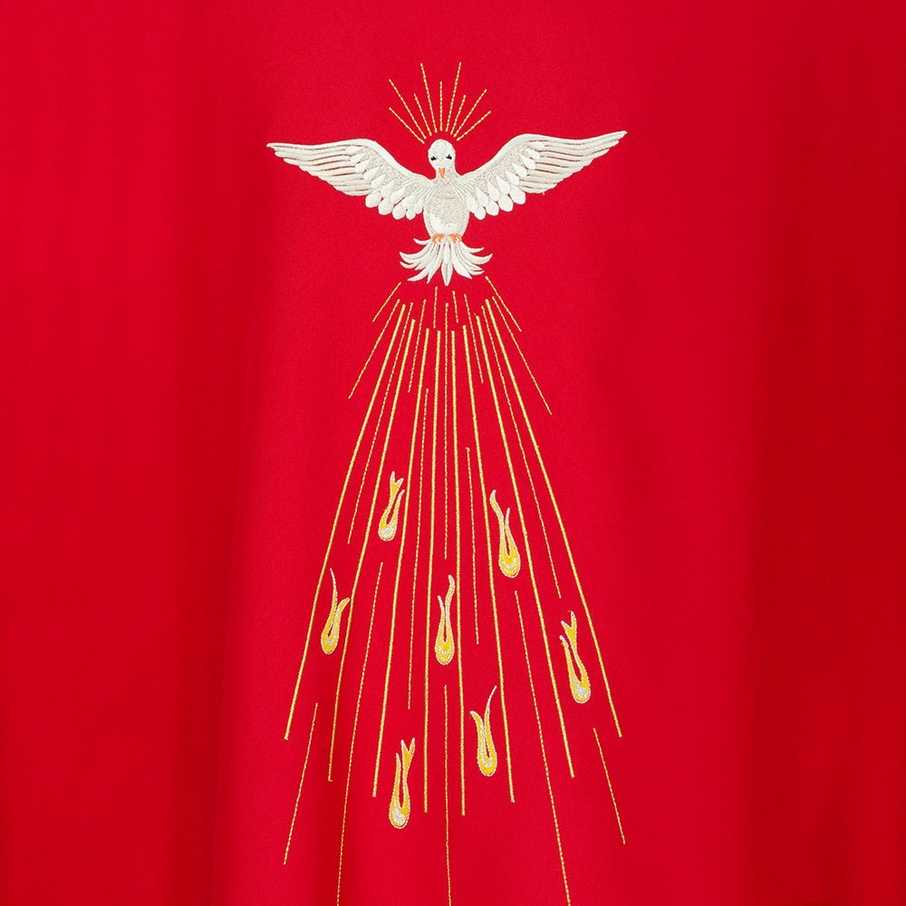 Casula rossa con ricamo Spirito Santo. Realizzata in leggero e fresco tessuto in poliestere. Il ricamo raffigura lo Spirito Santo (Colomba) e fiamme, presente sia sul lato anteriore che su quello posteriore. Corredata di stola.
