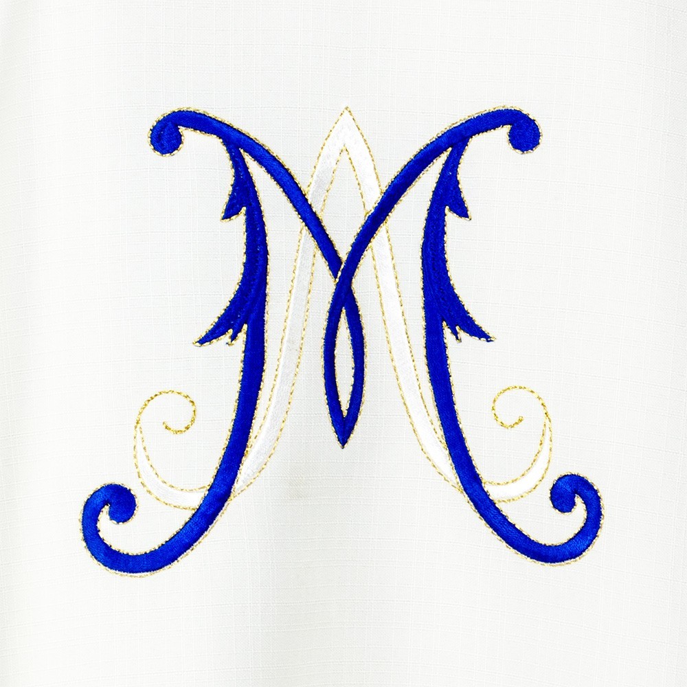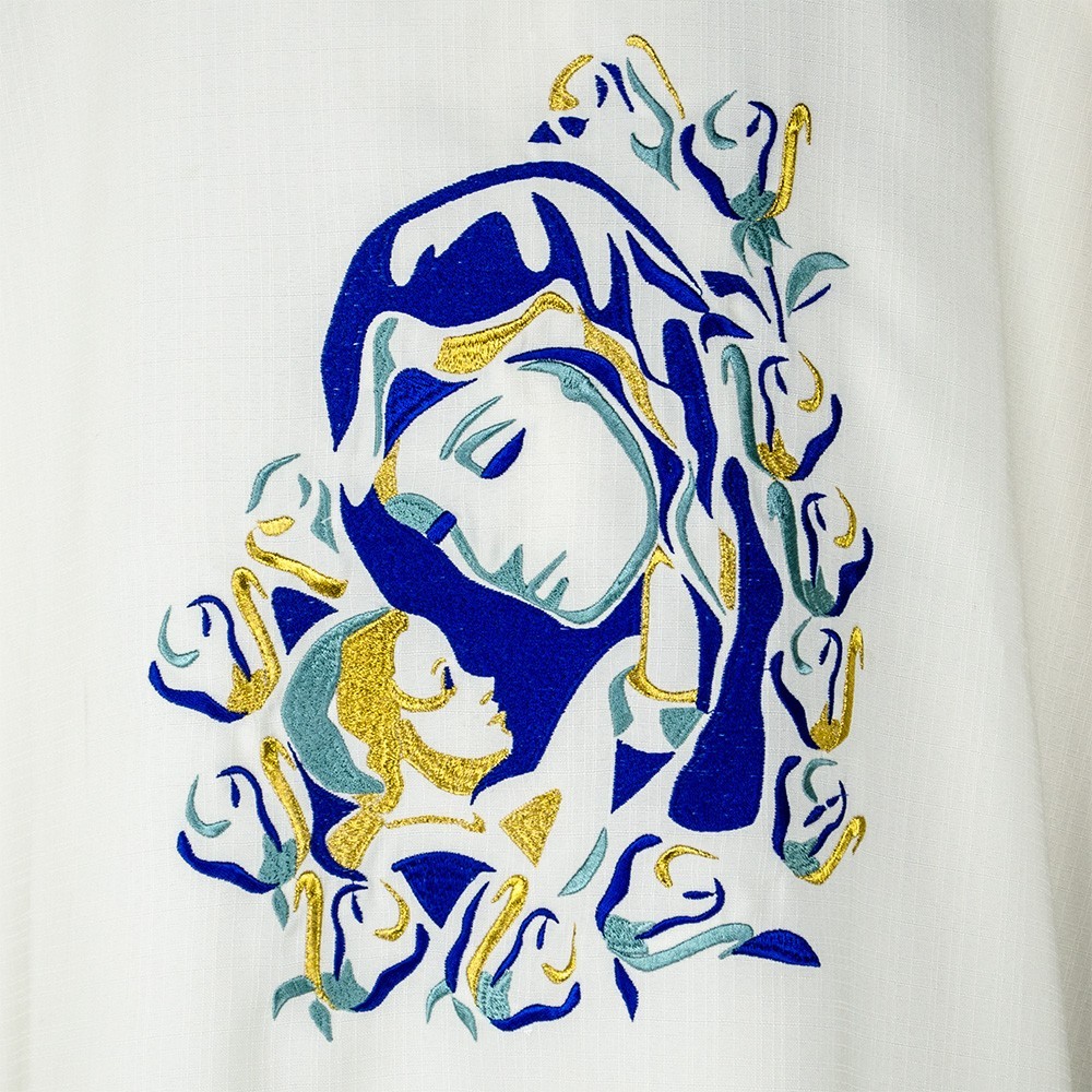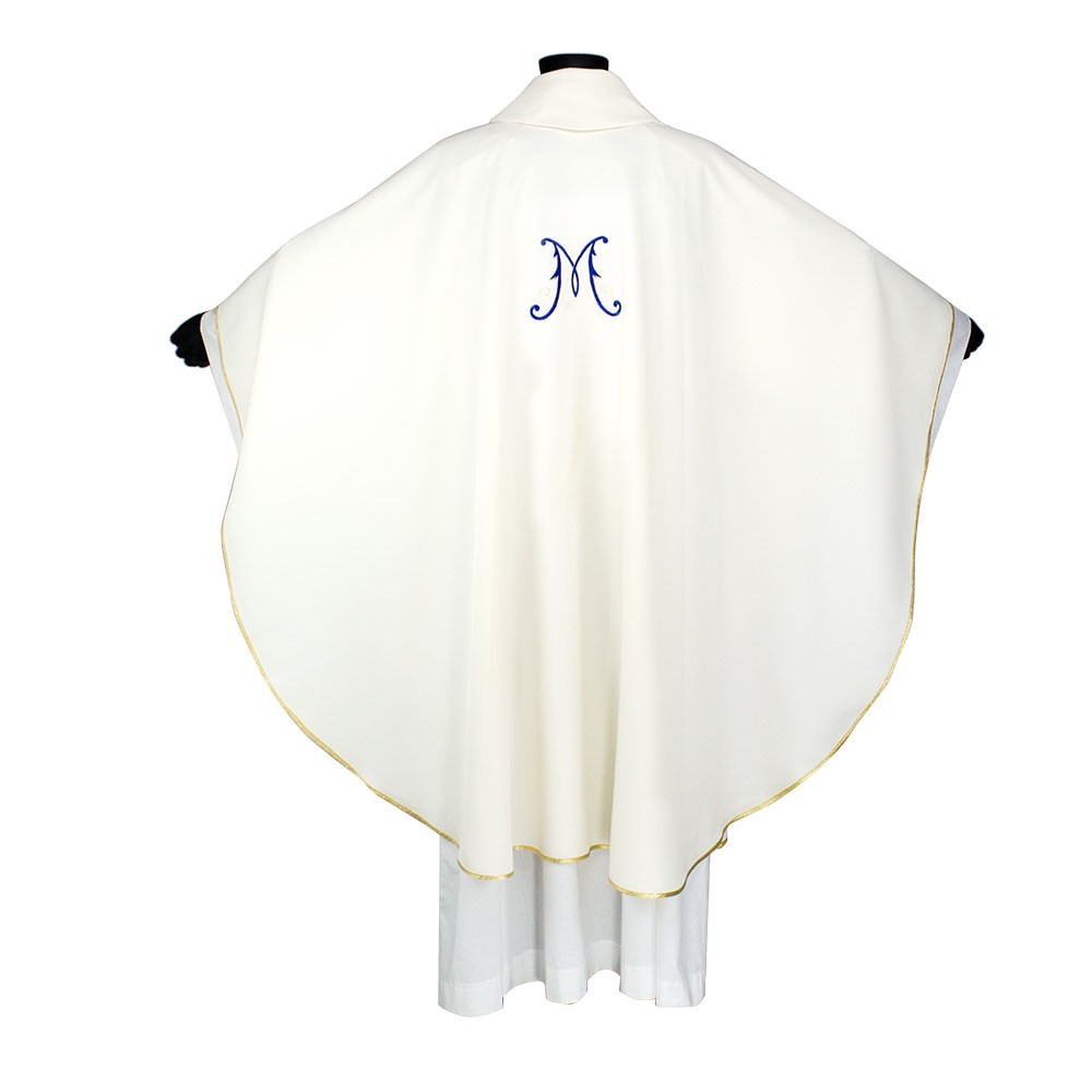 Casula mariana in tessuto poliestere lavorato. La casula si presenta con un grazioso ricamo sul fronte in oro e seta policroma raffigurante la Madonna con Bambino e sul retro la "M" di Maria.