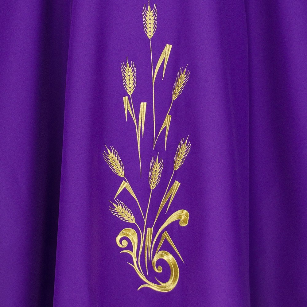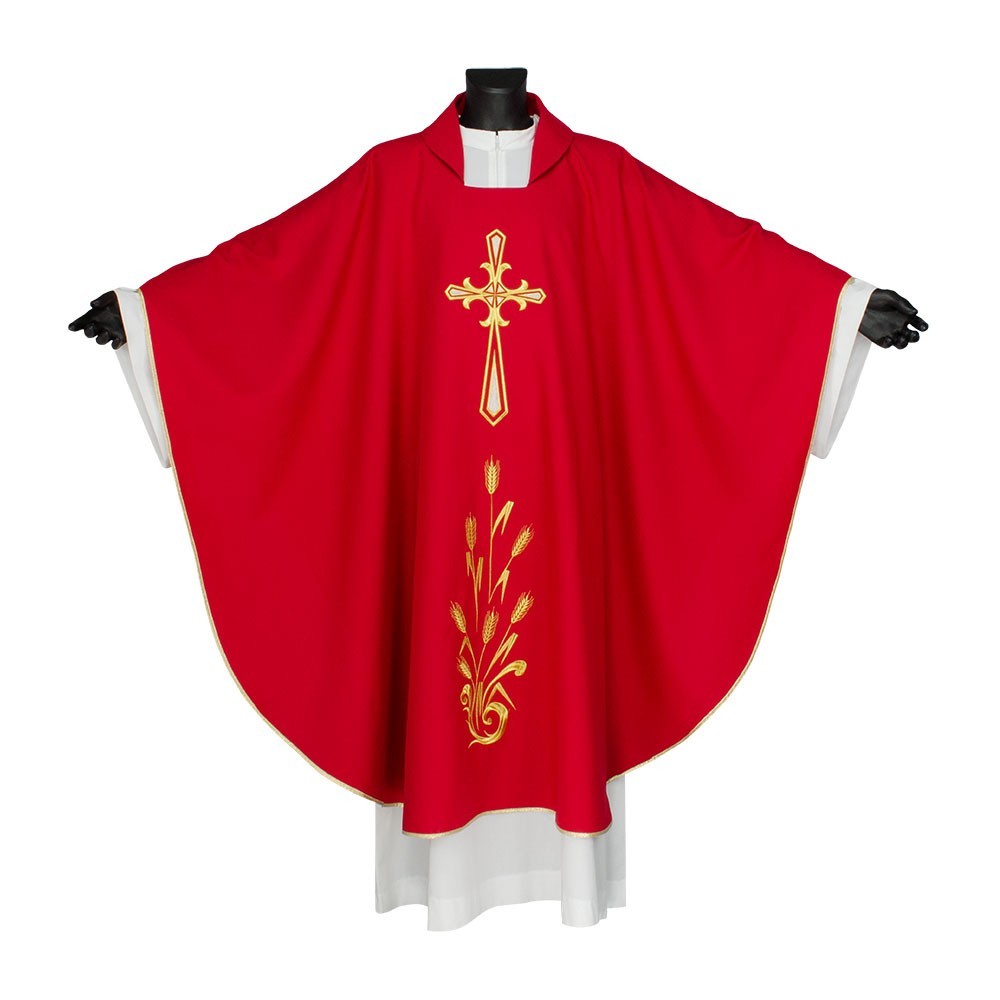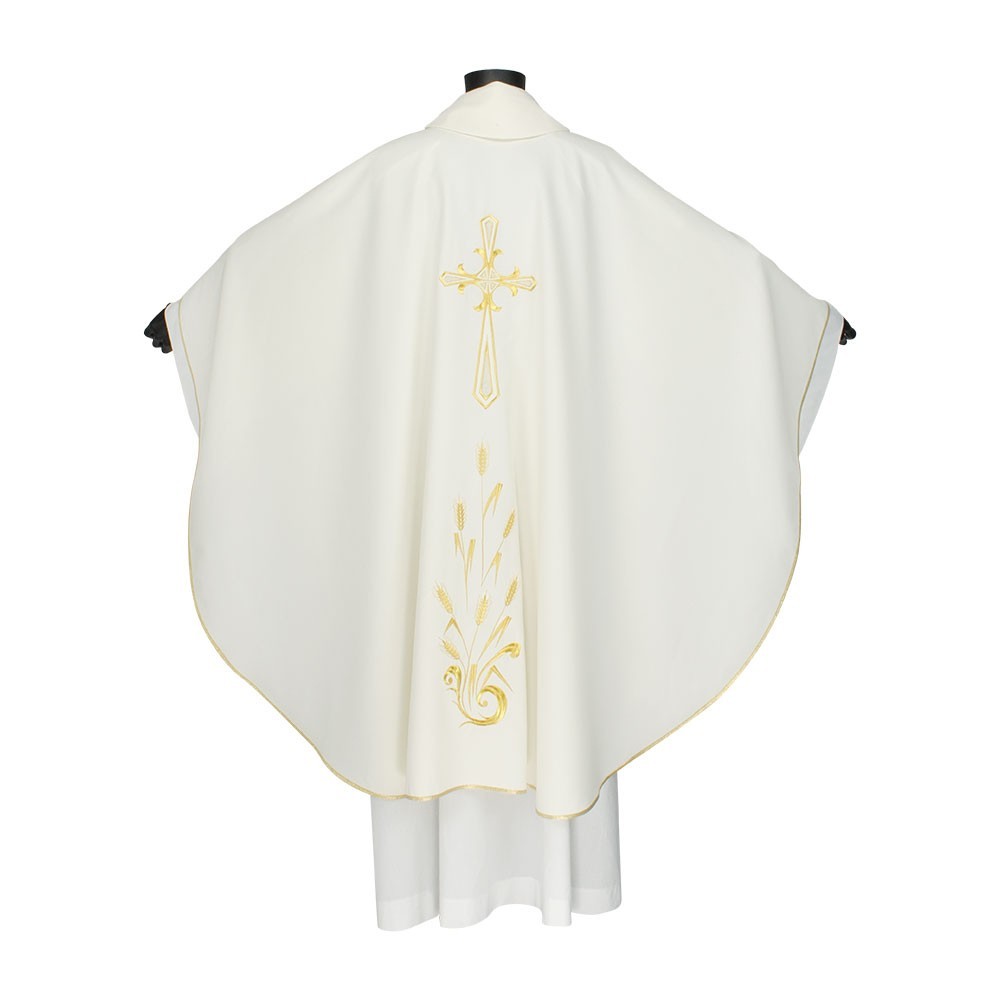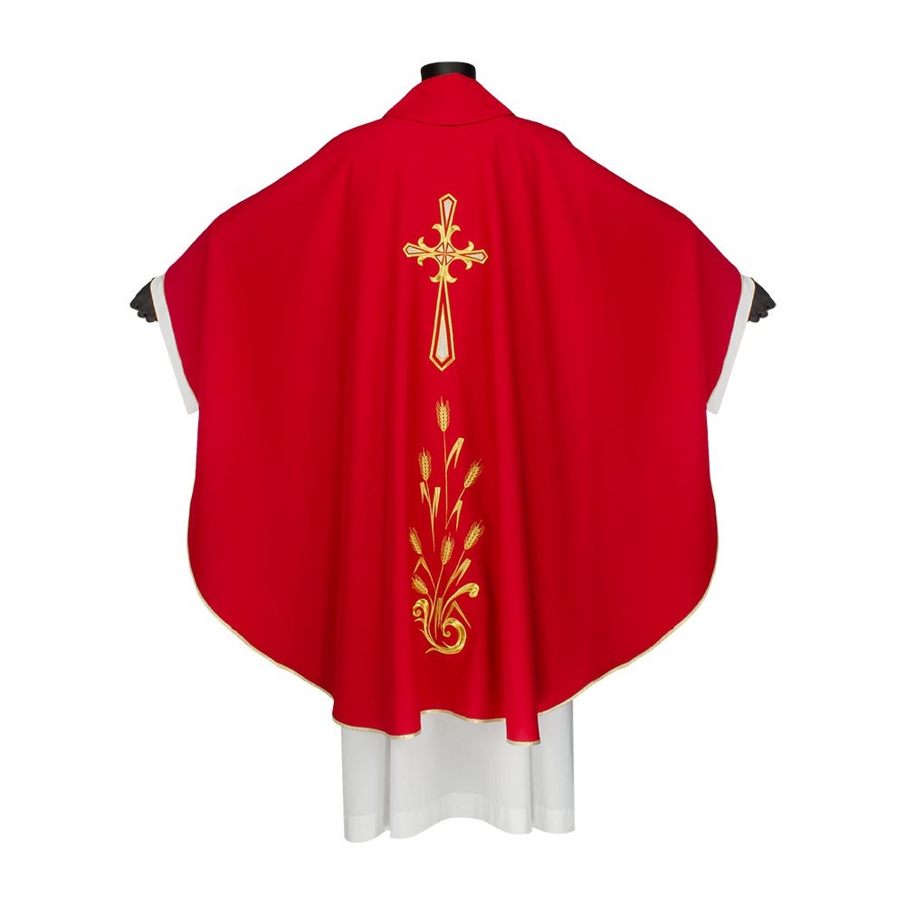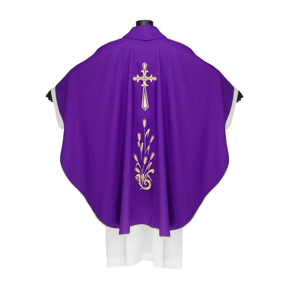 Casula liturgica in poliestere, disponibile nei quattro colori liturgici. Questo paramento sacro presenta un ricco ricamo in oro posto al centro, raffigurante una croce con un gruppo di spighe poste sotto di essa. Il ricamo viene realizzato a macchina ed è presente sia sul lato anteriore che su quello posteriore. Viene fornita di stola abbinata.