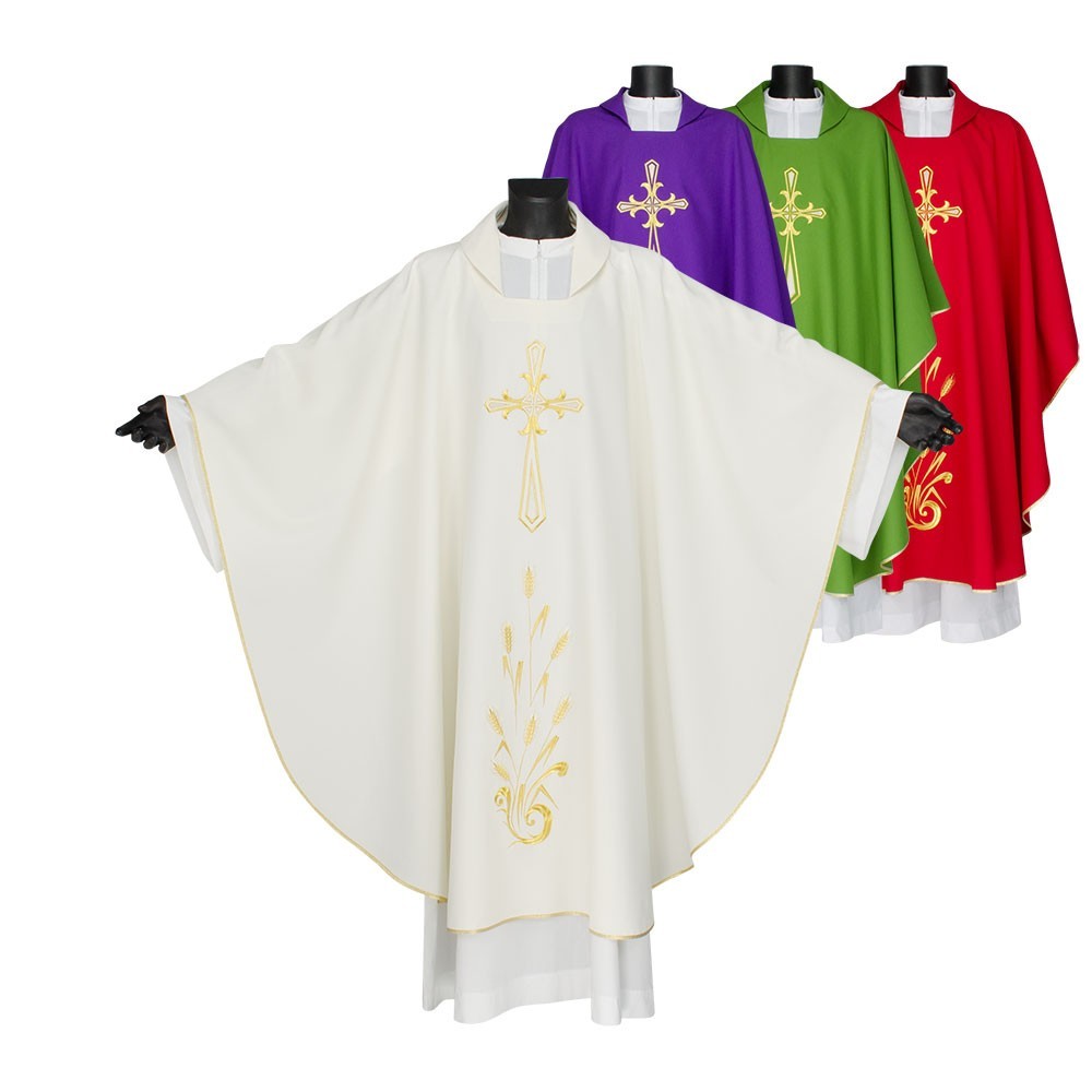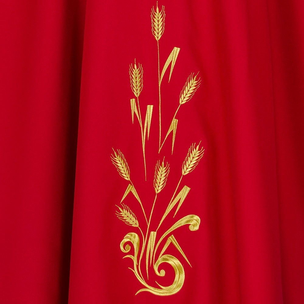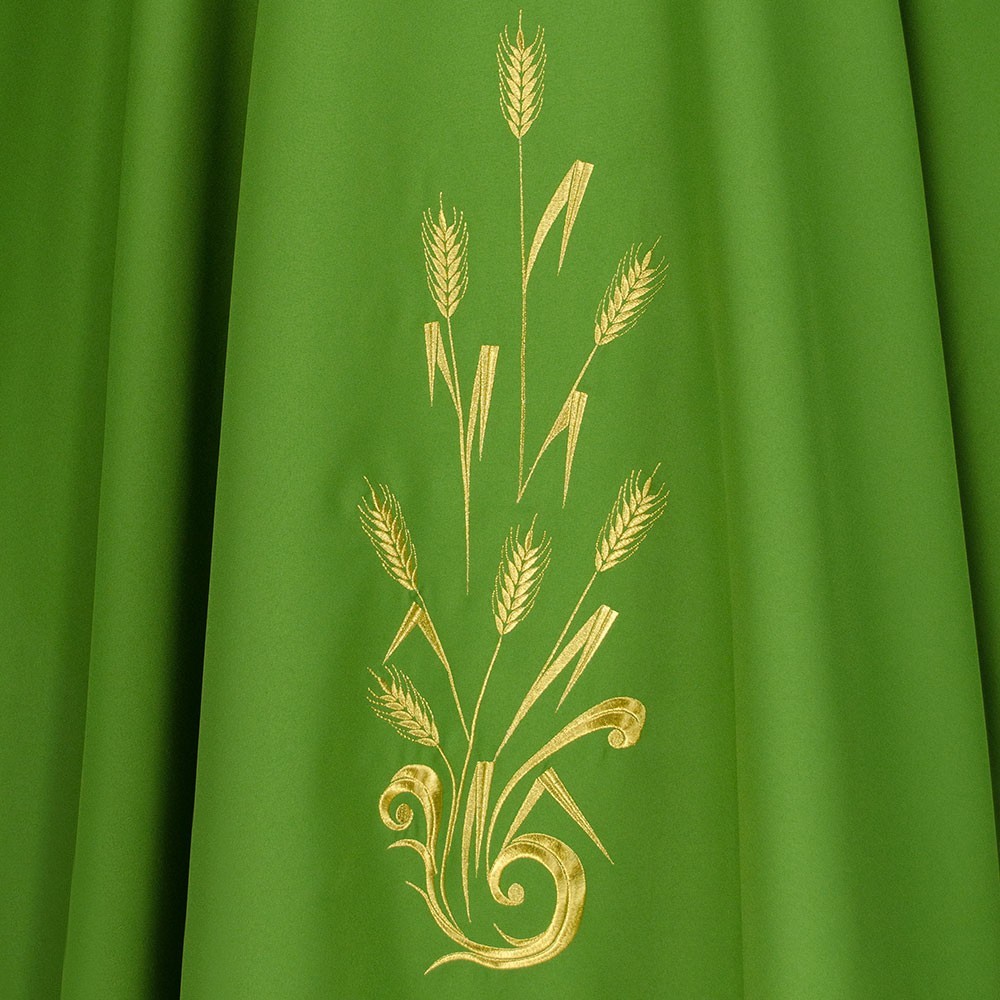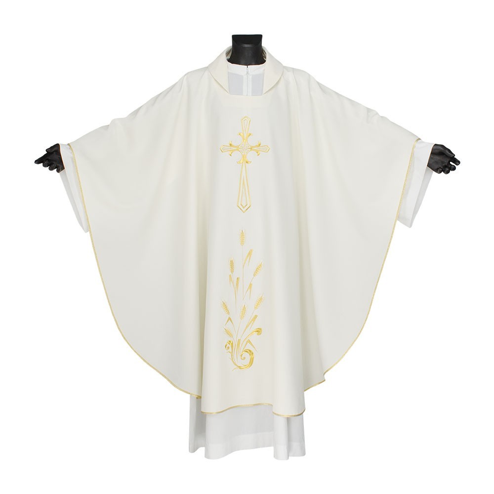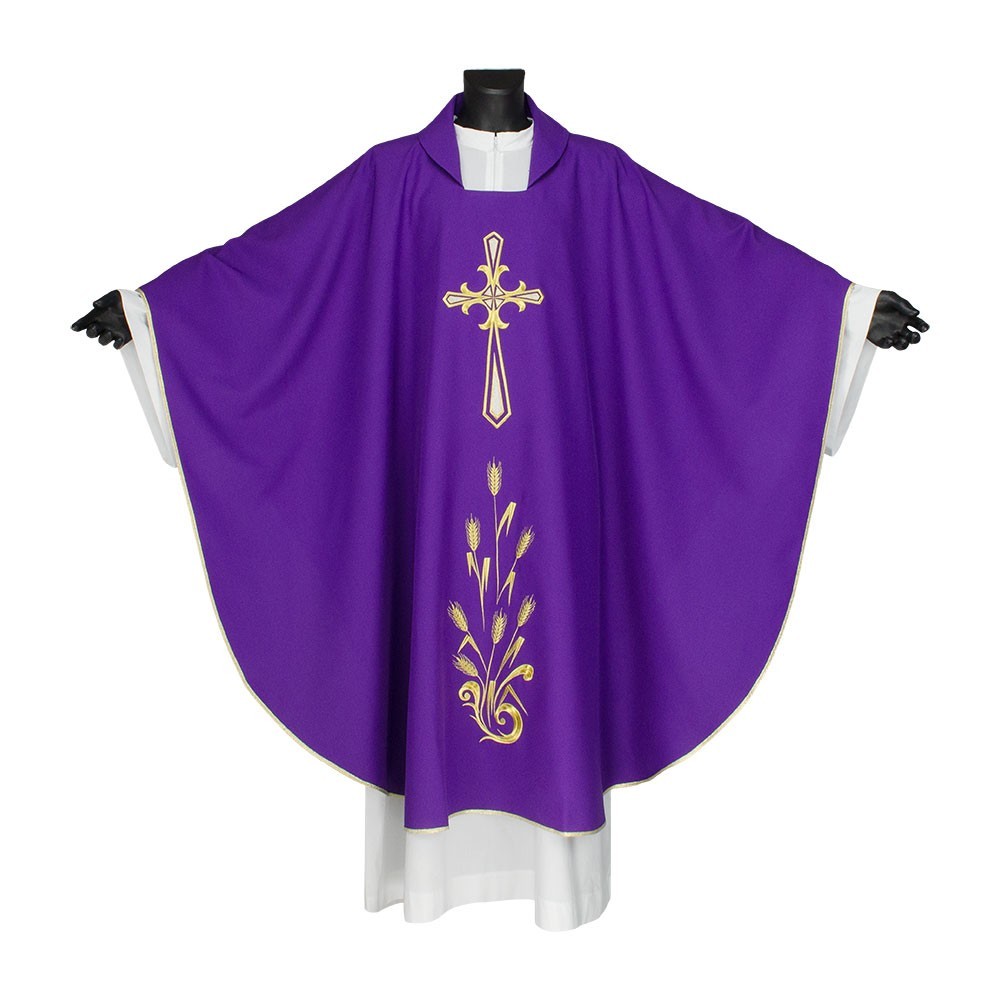 Casula liturgica in poliestere, disponibile nei quattro colori liturgici. Questo paramento sacro presenta un ricco ricamo in oro posto al centro, raffigurante una croce con un gruppo di spighe poste sotto di essa. Il ricamo viene realizzato a macchina ed è presente sia sul lato anteriore che su quello posteriore. Viene fornita di stola abbinata.