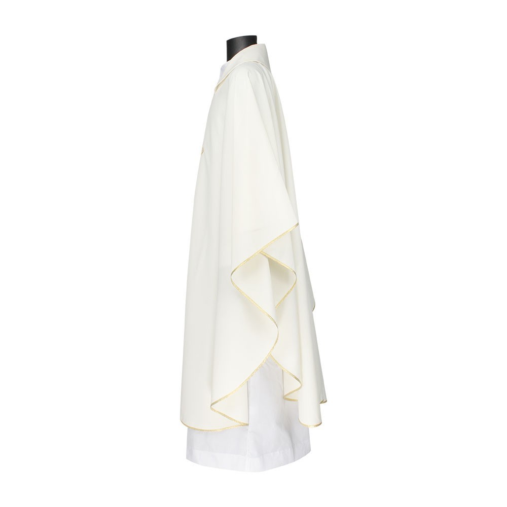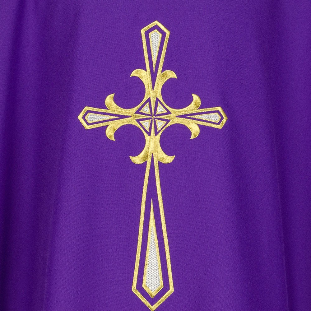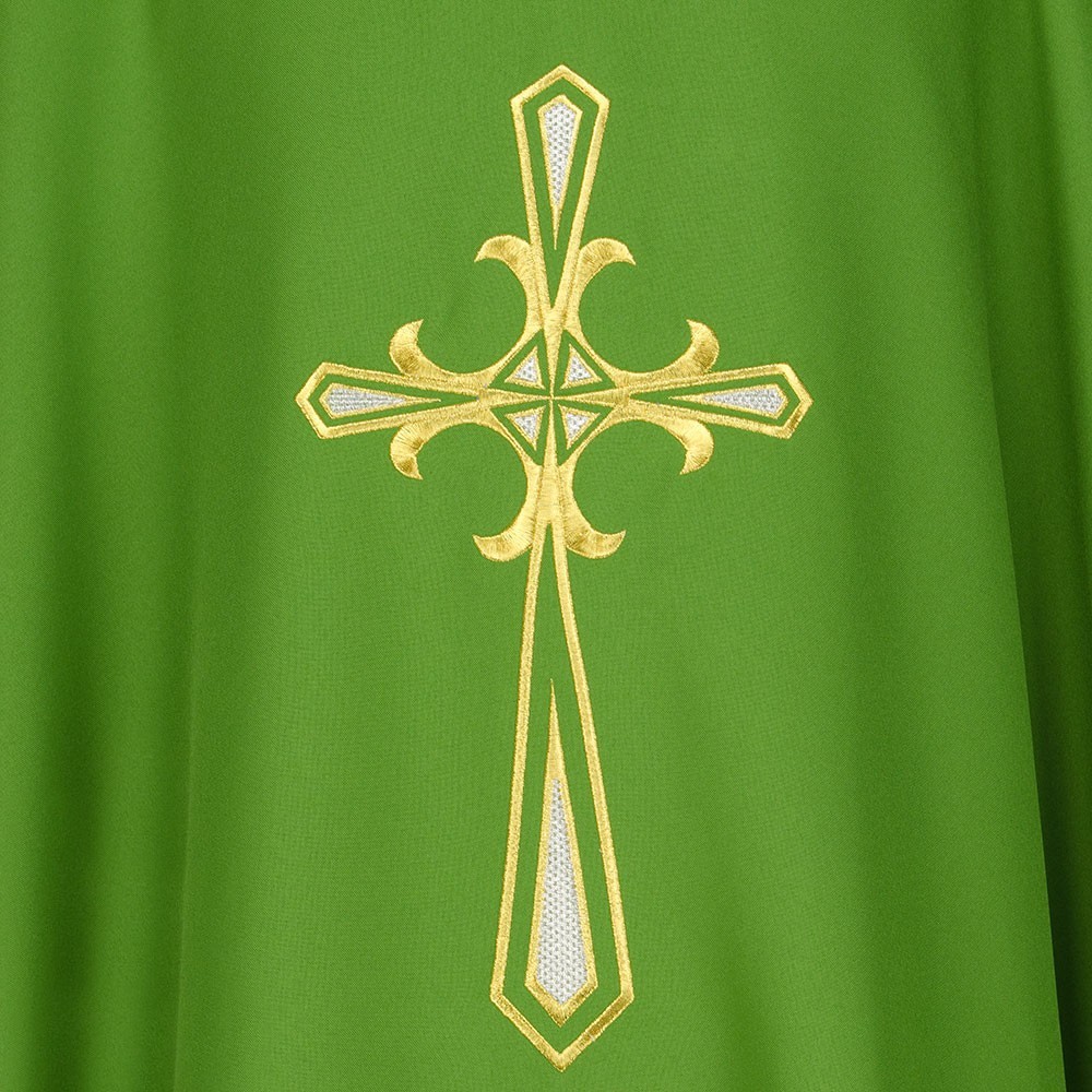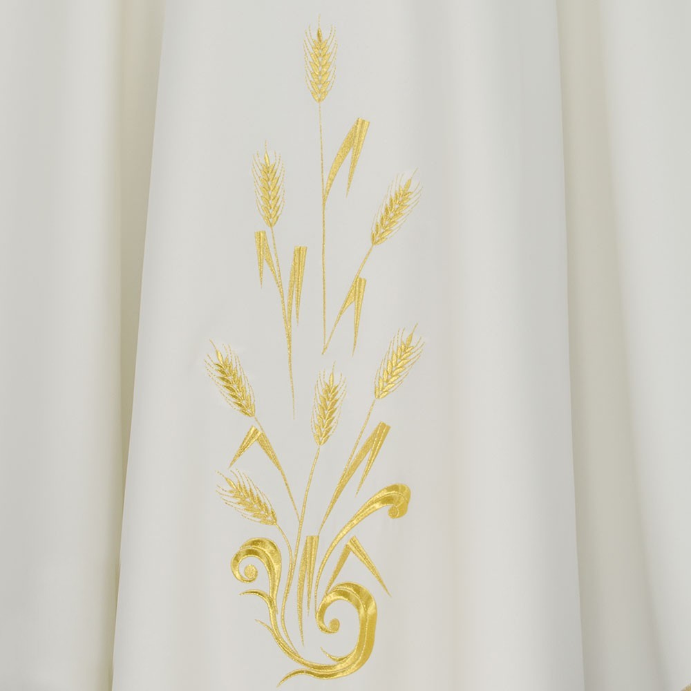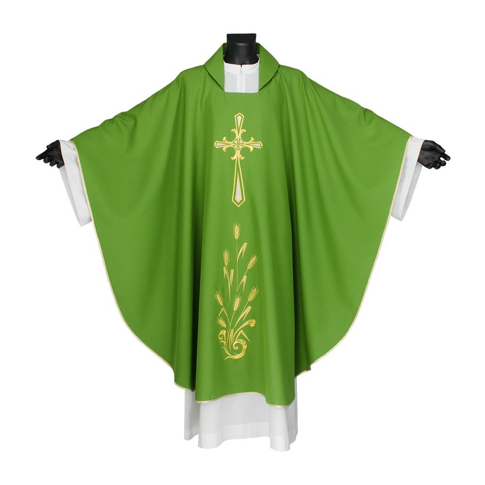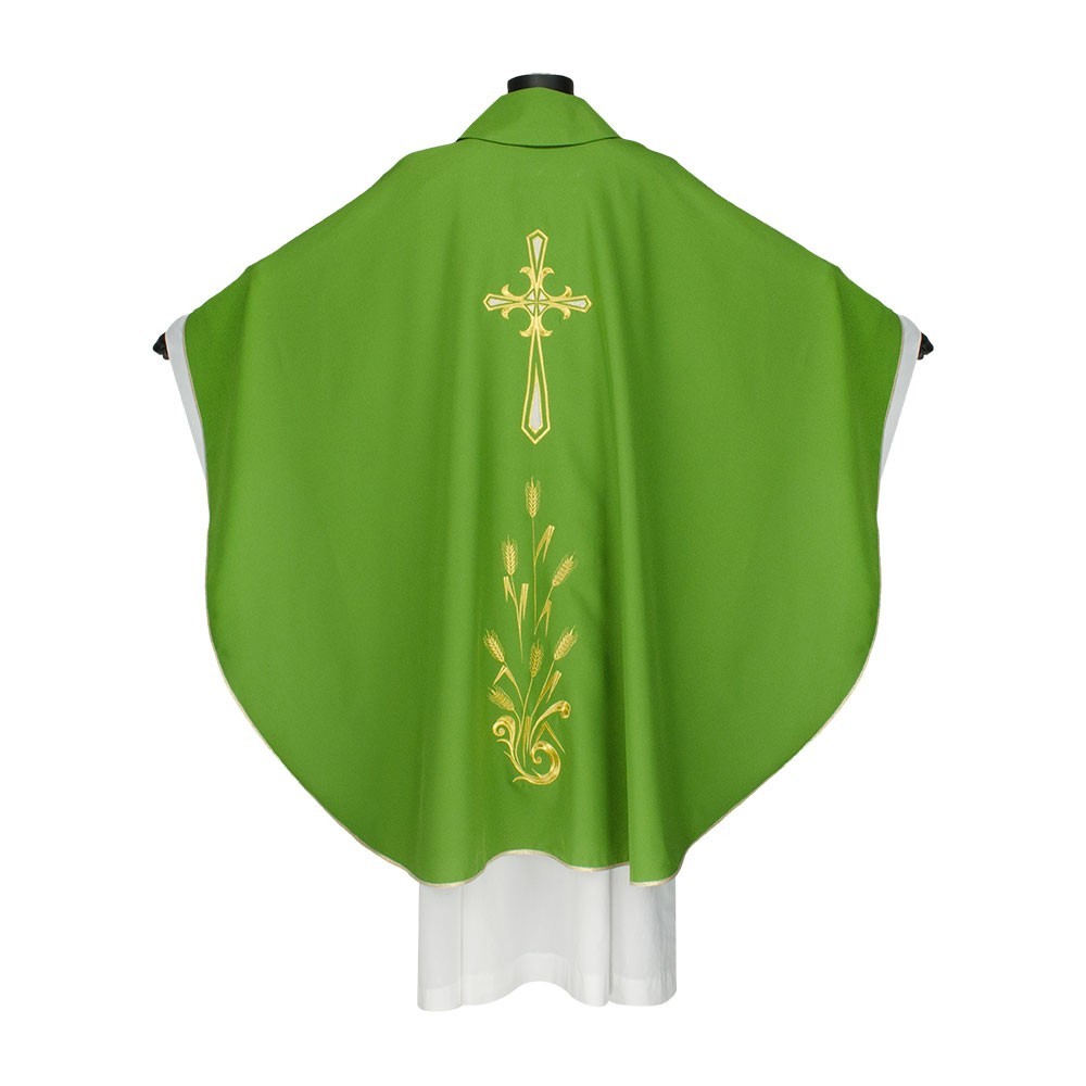 Casula liturgica in poliestere, disponibile nei quattro colori liturgici. Questo paramento sacro presenta un ricco ricamo in oro posto al centro, raffigurante una croce con un gruppo di spighe poste sotto di essa. Il ricamo viene realizzato a macchina ed è presente sia sul lato anteriore che su quello posteriore. Viene fornita di stola abbinata.