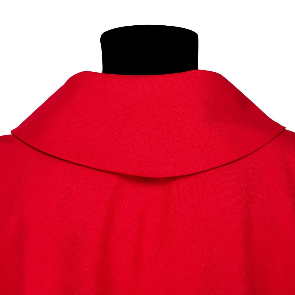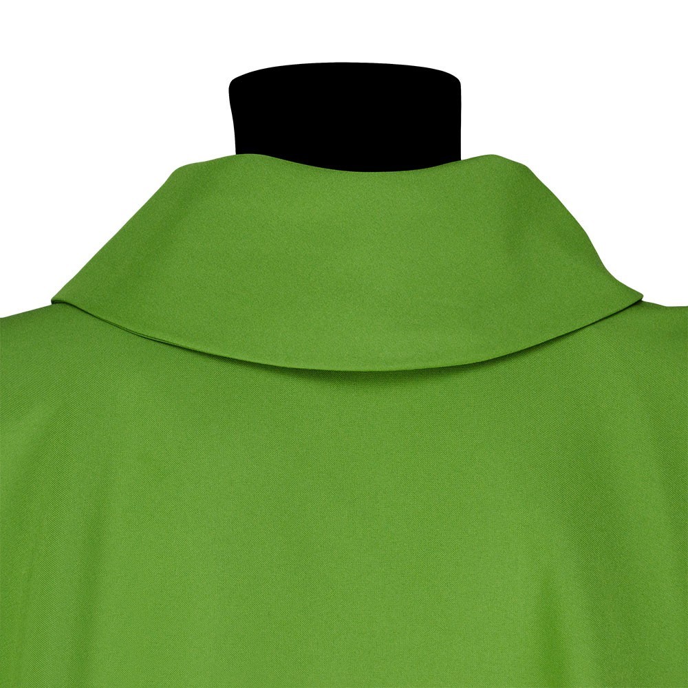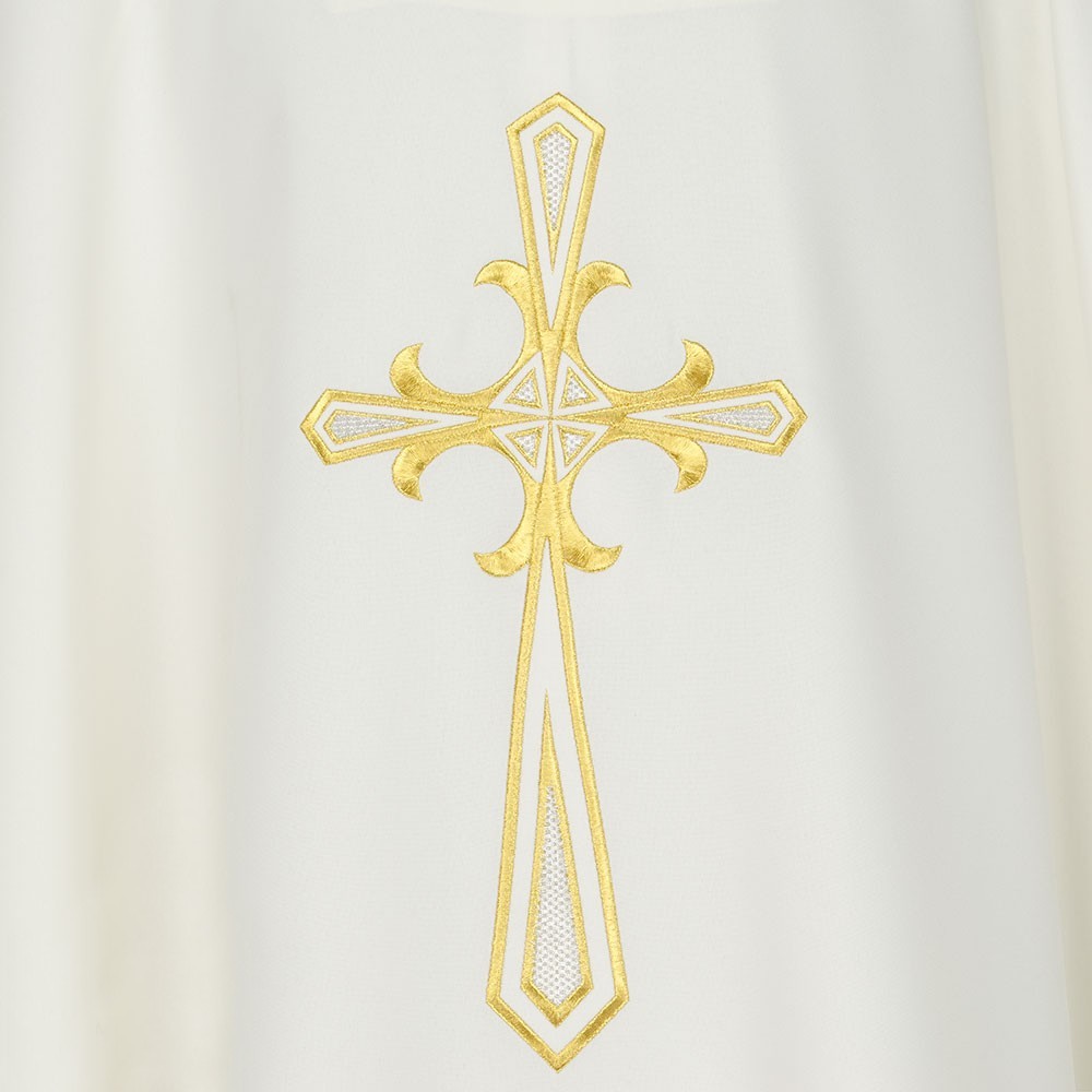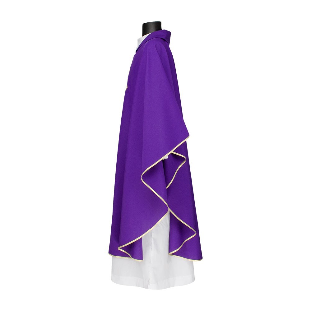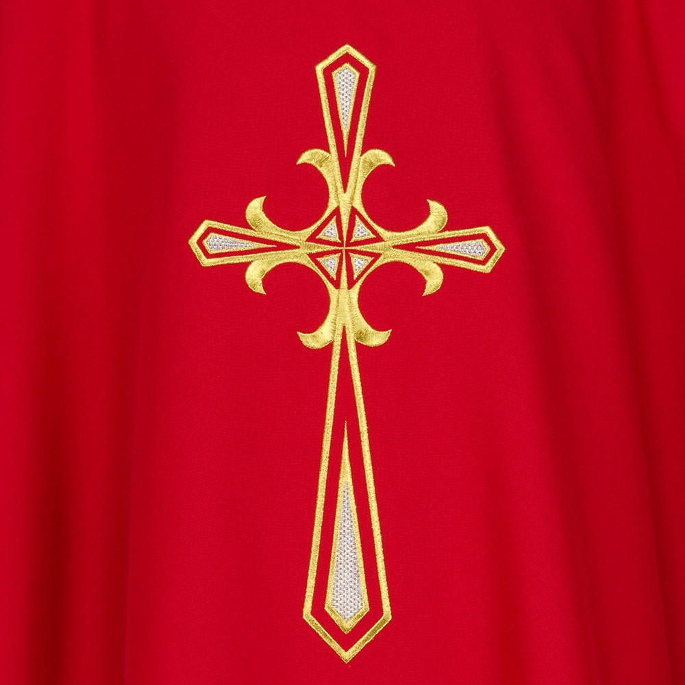 Casula liturgica in poliestere, disponibile nei quattro colori liturgici. Questo paramento sacro presenta un ricco ricamo in oro posto al centro, raffigurante una croce con un gruppo di spighe poste sotto di essa. Il ricamo viene realizzato a macchina ed è presente sia sul lato anteriore che su quello posteriore. Viene fornita di stola abbinata.