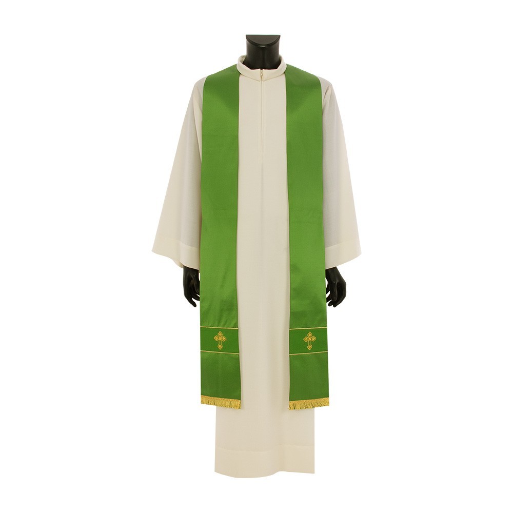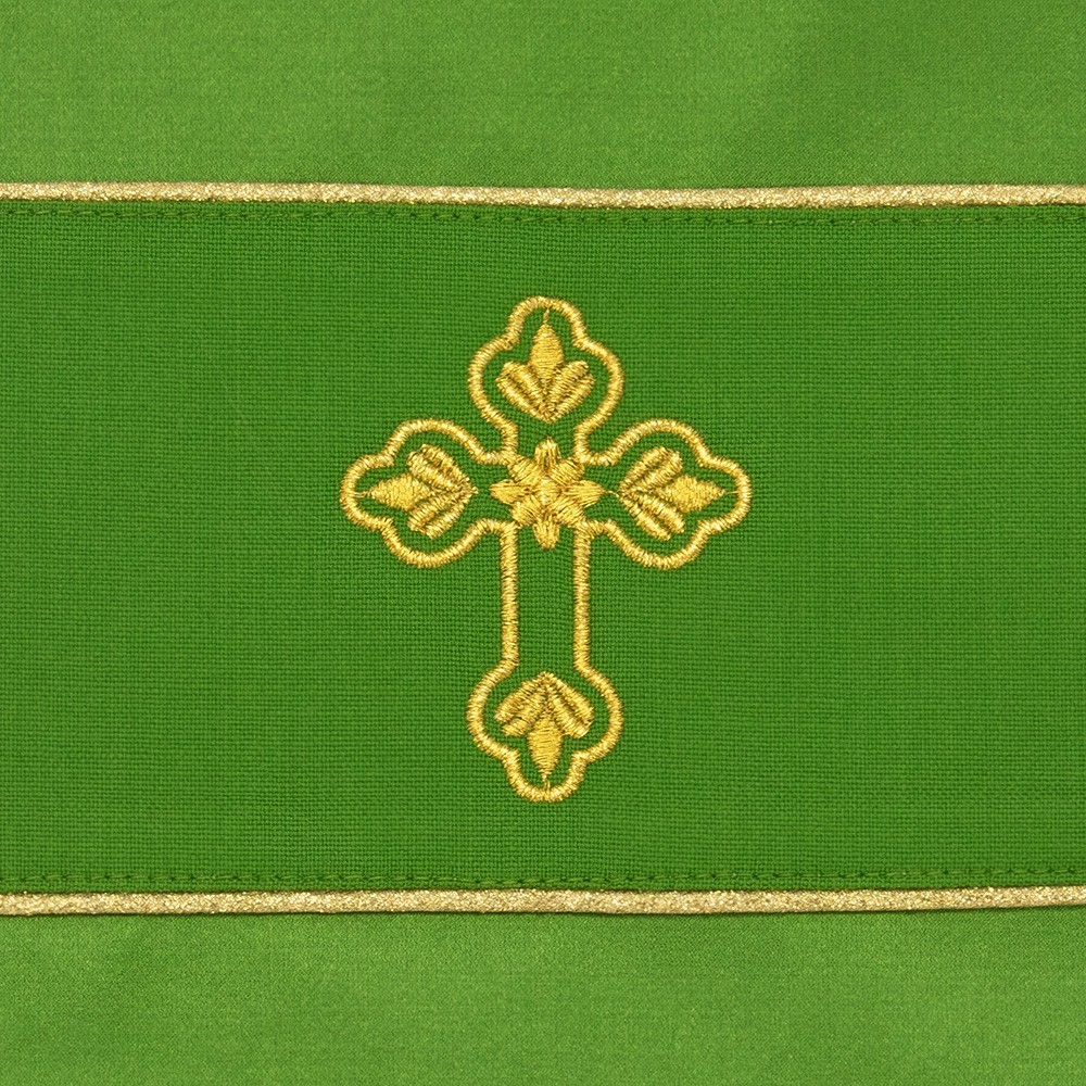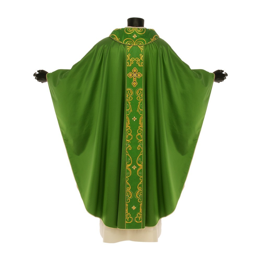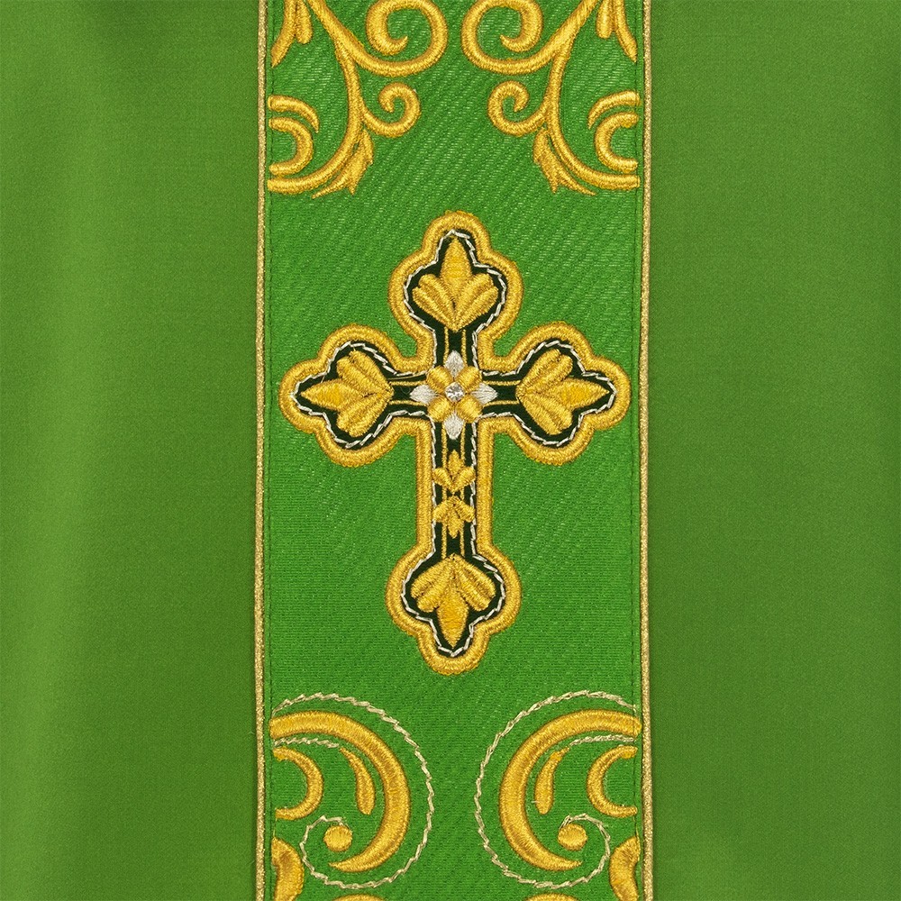 Questa elegante veste liturgica presenta decorazioni color oro sul collo, sul fronte e sul retro e impreziosita da una pietra trasparente. I tessuti utilizzati per questo paramento sono di ottima qualità. Il taglio è ampio con collo ad anello e stolone cucito. Rifinita con sbiego perimetrale dorato. Viene fornita di stola abbinata