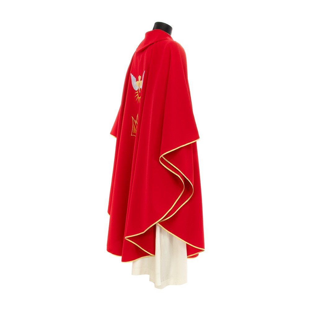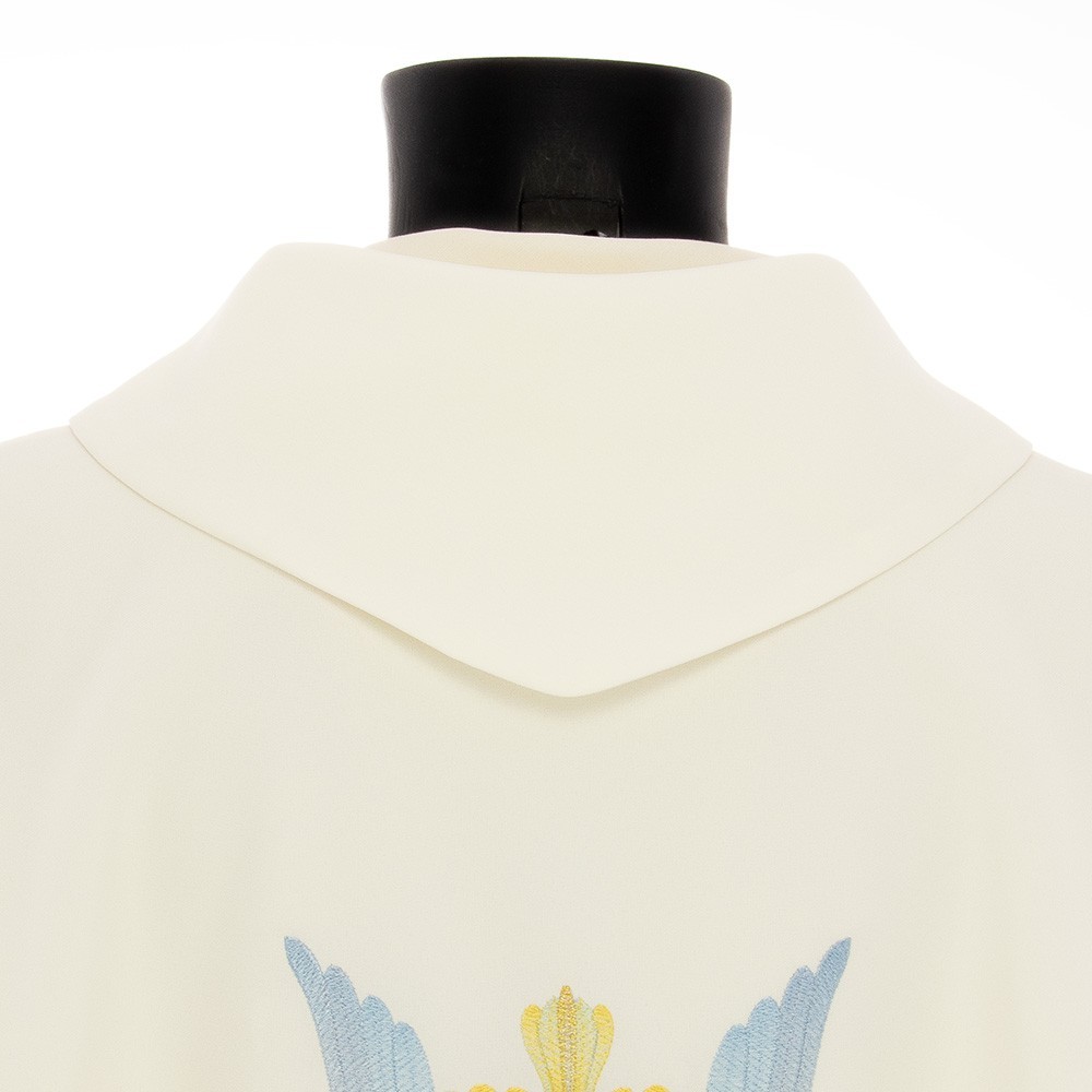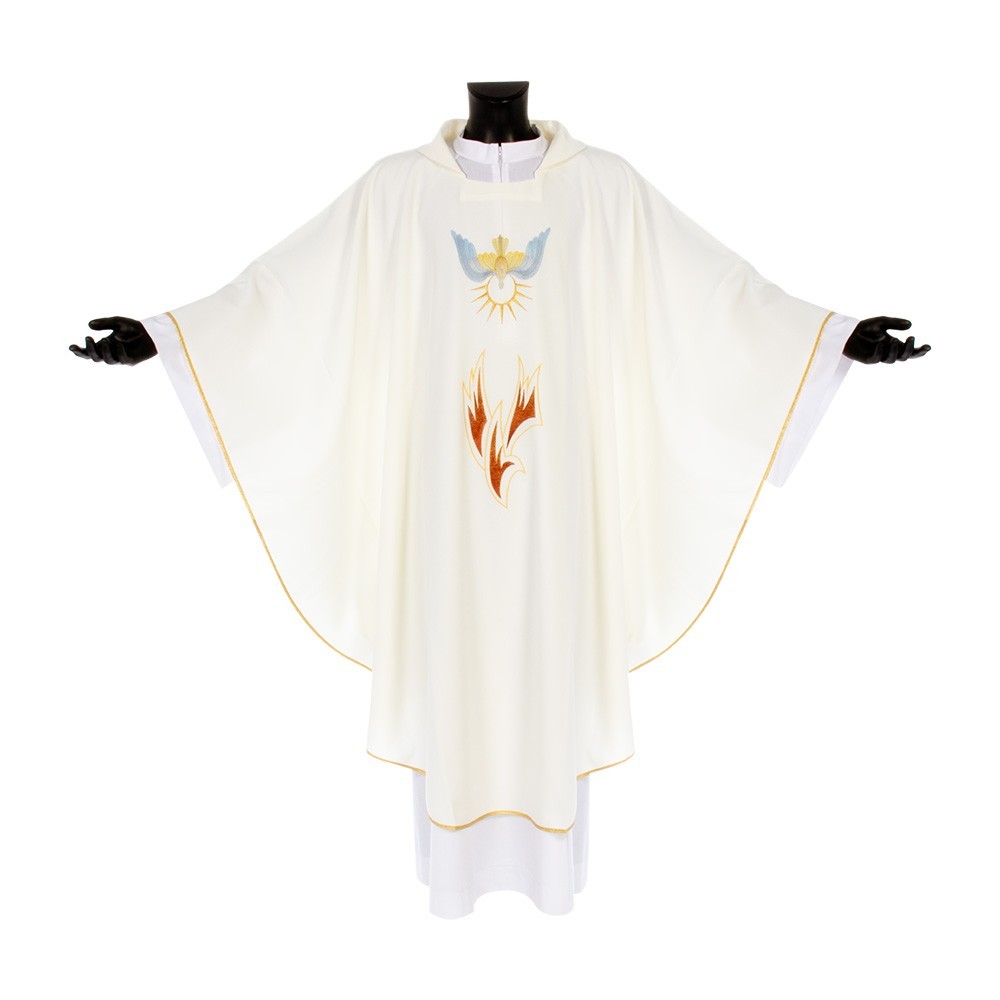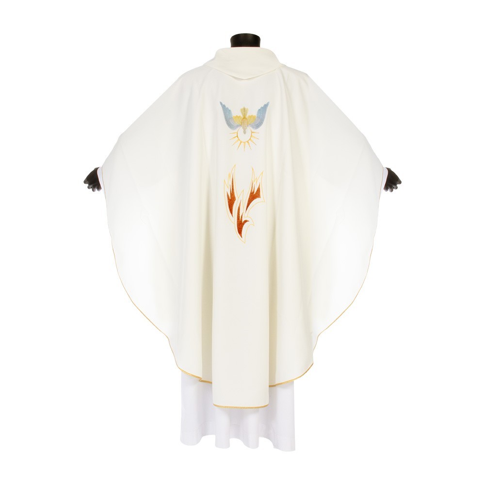 Realizzata in leggero e fresco tessuto in poliestere. Il ricamo diretto sul fronte e sul retro casula, raffigura lo Spirito Santo (Colomba) con lingue di fuoco. Fornita con stola abbinata.