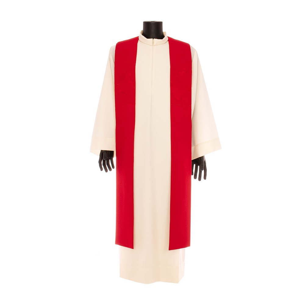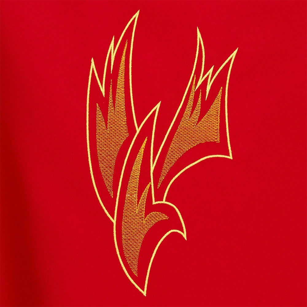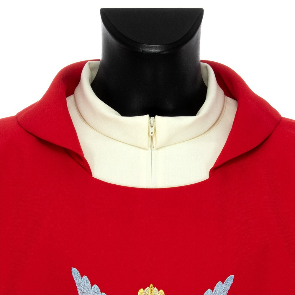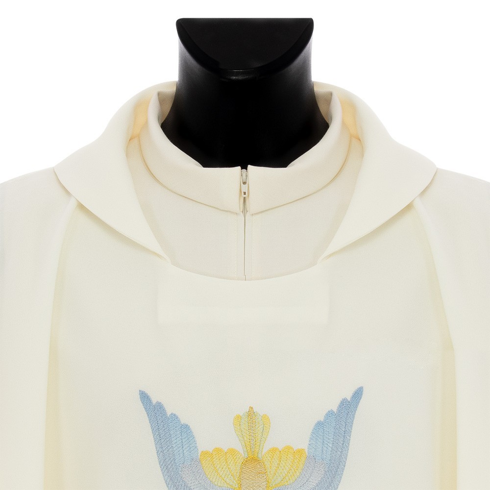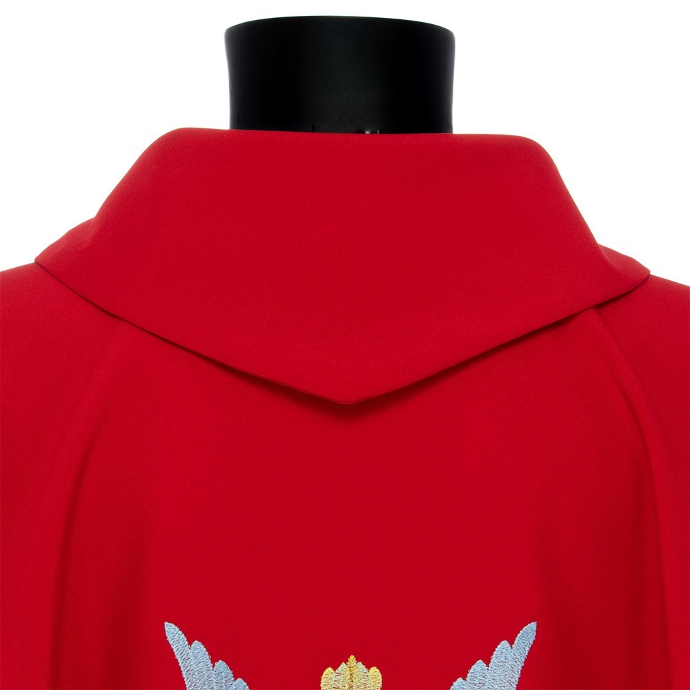 Realizzata in leggero e fresco tessuto in poliestere. Il ricamo diretto sul fronte e sul retro casula, raffigura lo Spirito Santo (Colomba) con lingue di fuoco. Fornita con stola abbinata.
