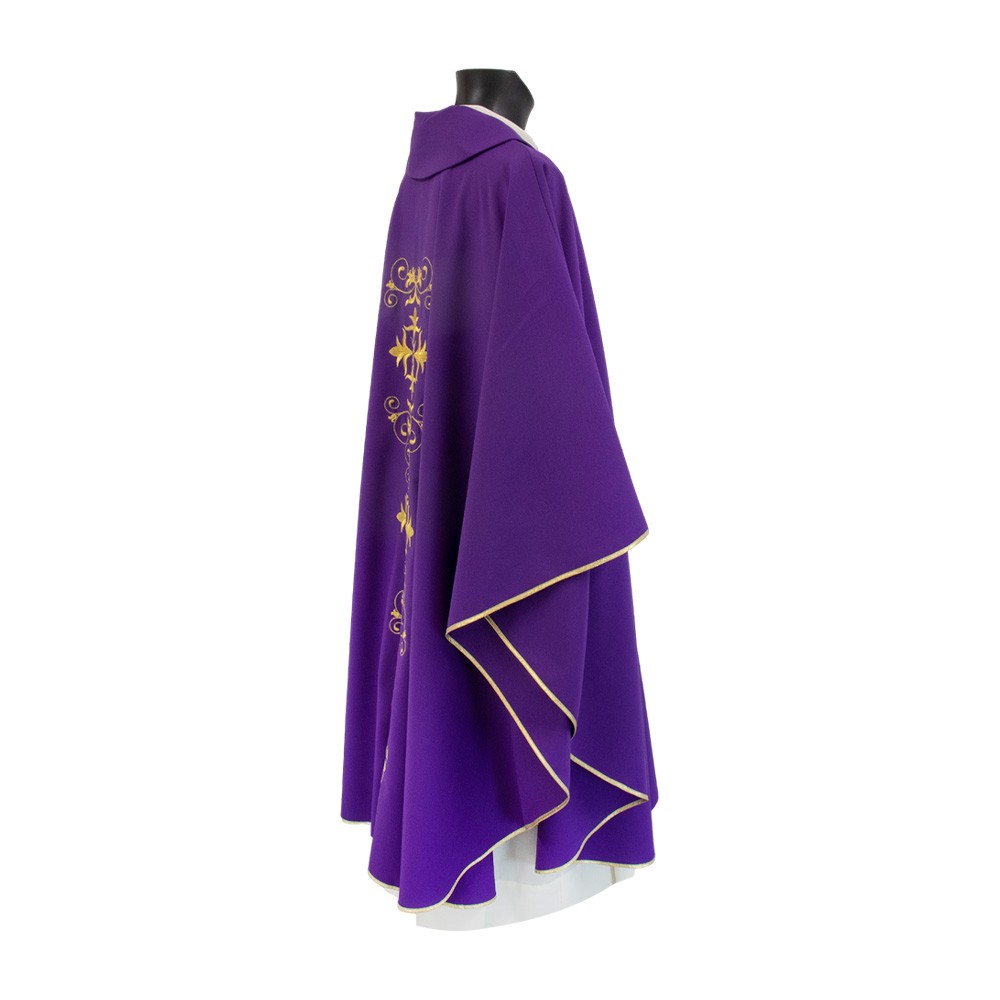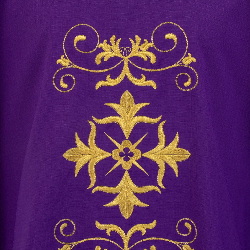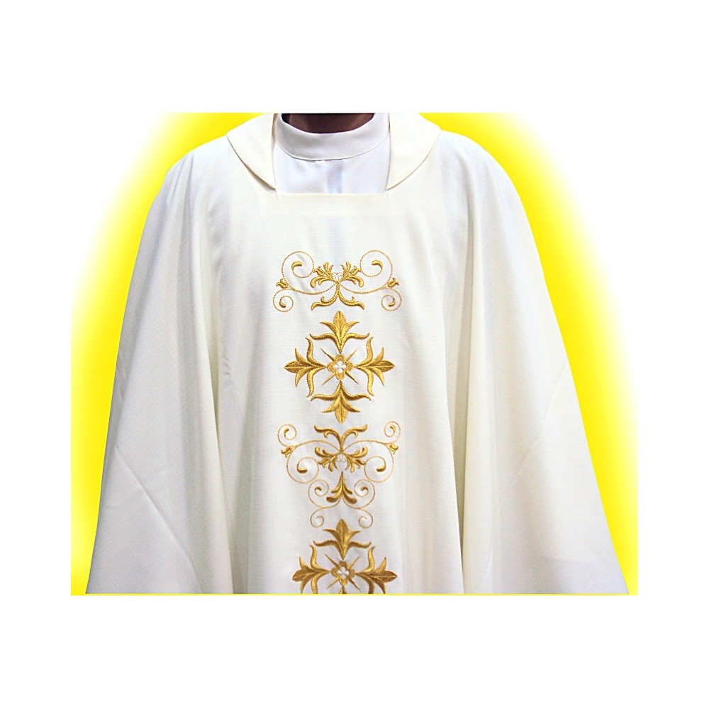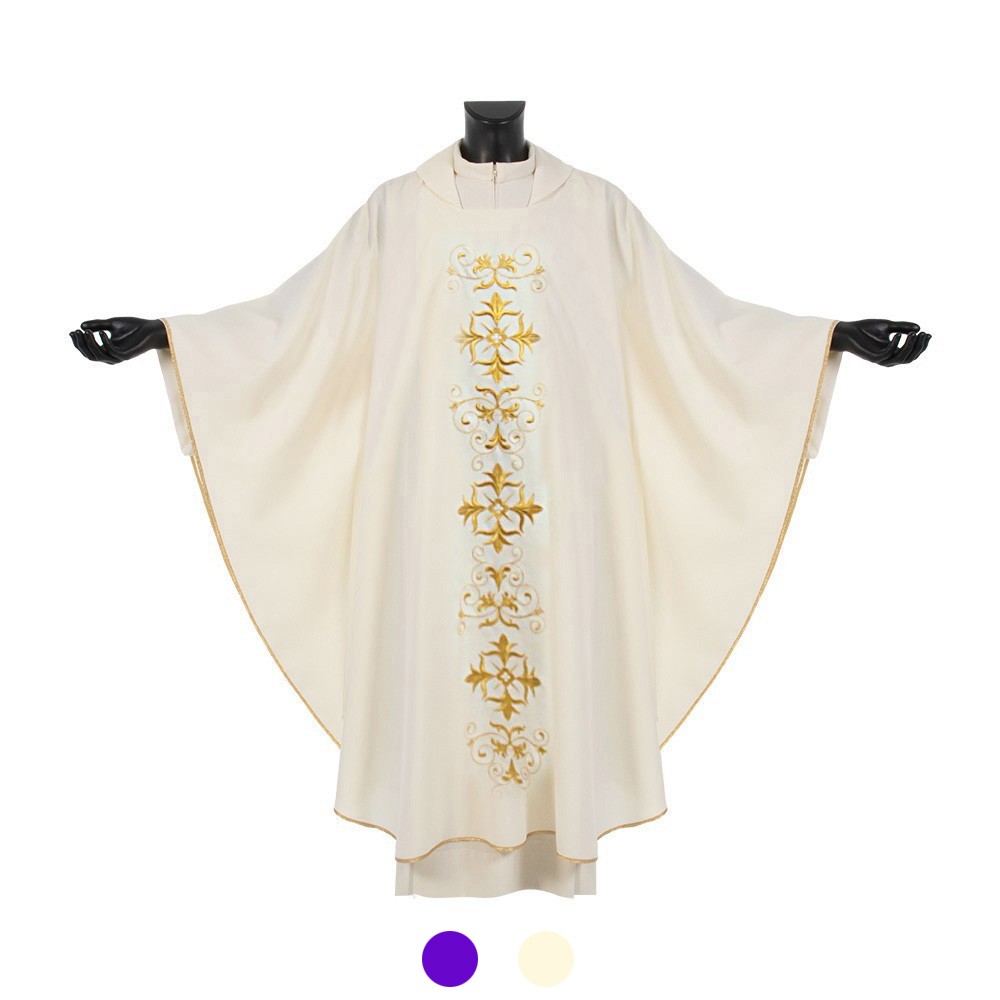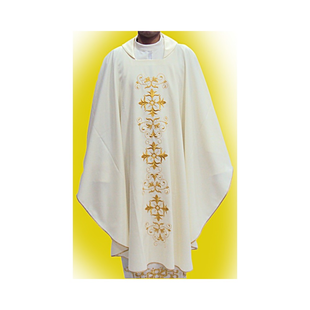 Casula sacerdotale realizzata in poliestere con ricco ricamo presente sia sul fronte che sul retro. Taglio classico correlata di stola.