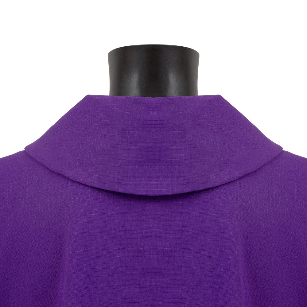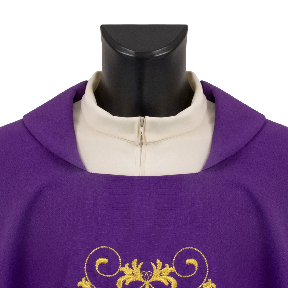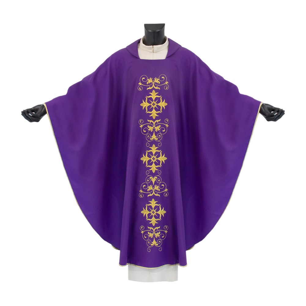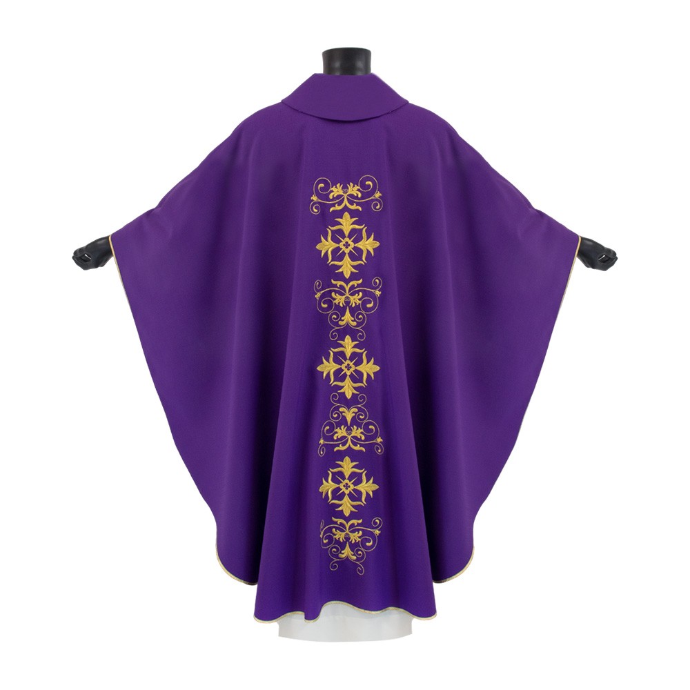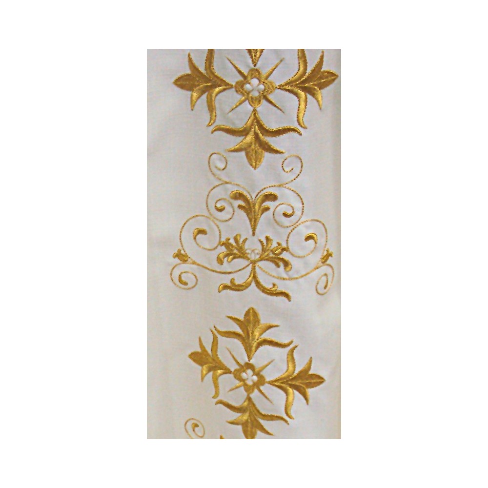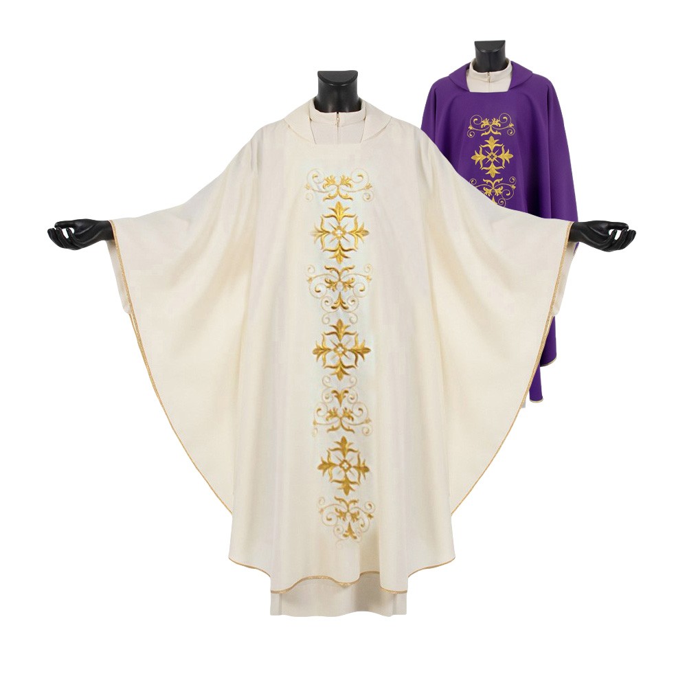 Casula sacerdotale realizzata in poliestere con ricco ricamo presente sia sul fronte che sul retro. Taglio classico correlata di stola.