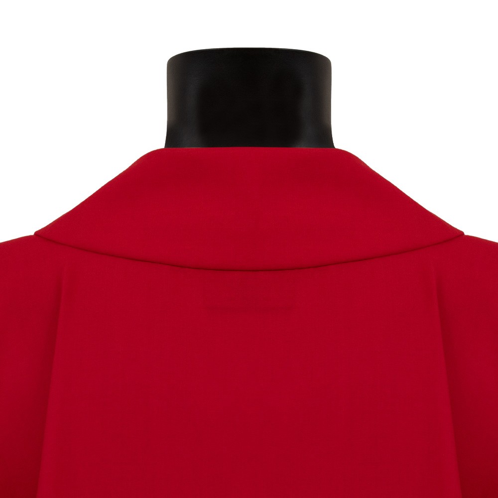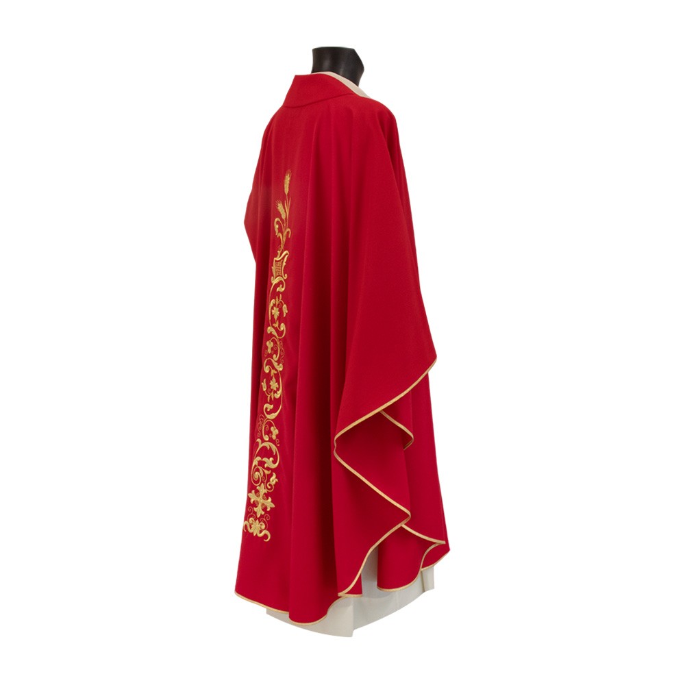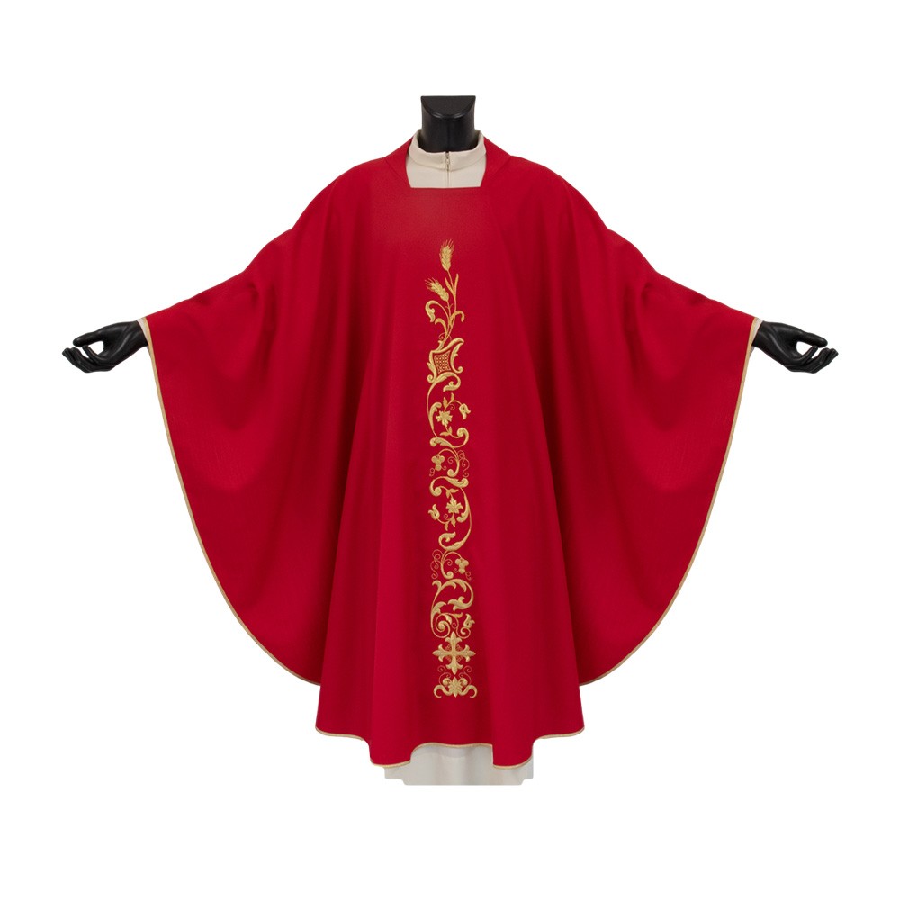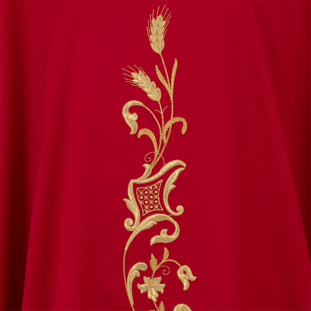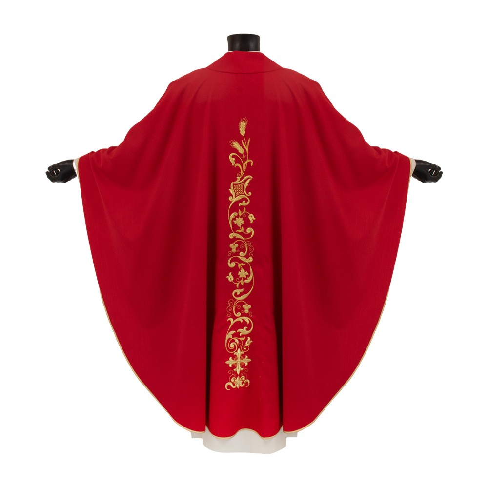 Casula per sacerdote di colore rossa con ricamo color oro presenti sia sul fronte che sul retro.