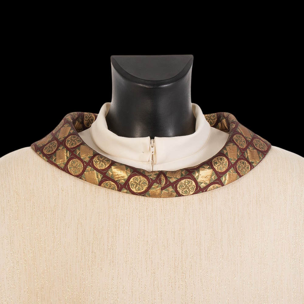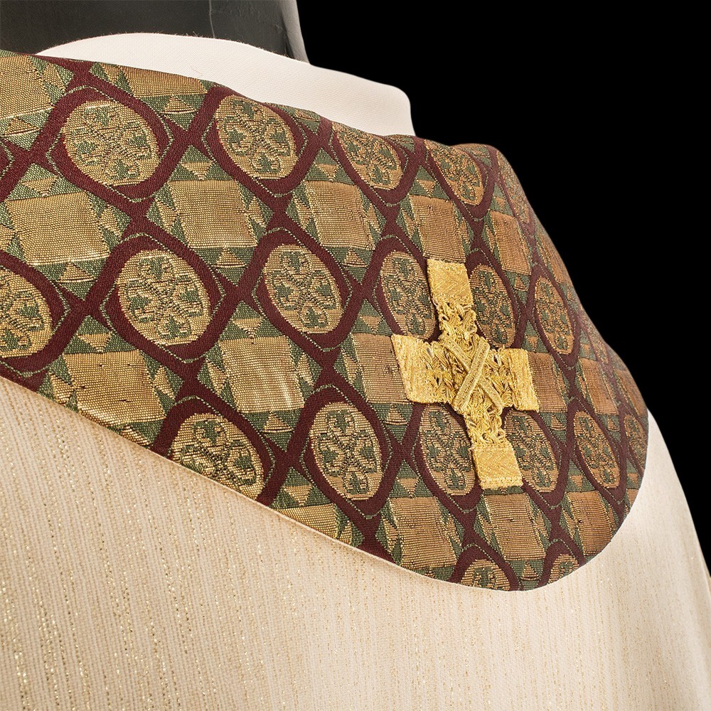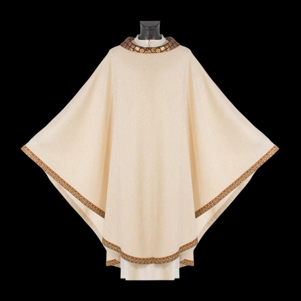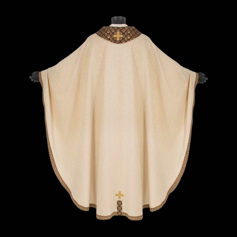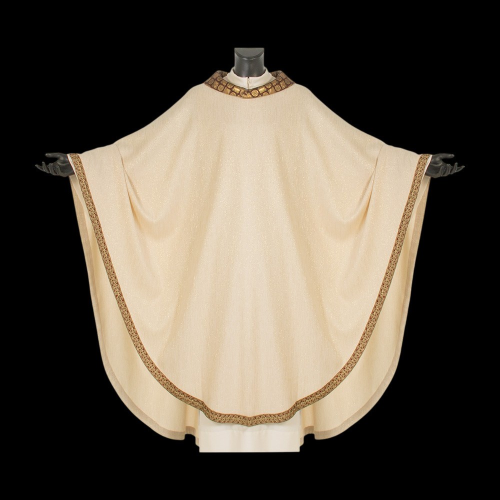 Casula sacerdotale avorio (collezione V piana). Elegante paramento sacro realizzato in pregiato tessuto pura lana vergine a quattro capi ritorti tramata lurex argento del Lanificio Faliero Sarti ed aurifregi in jacquard di viscosa e lurex delle Soieries TBM, Lyon.