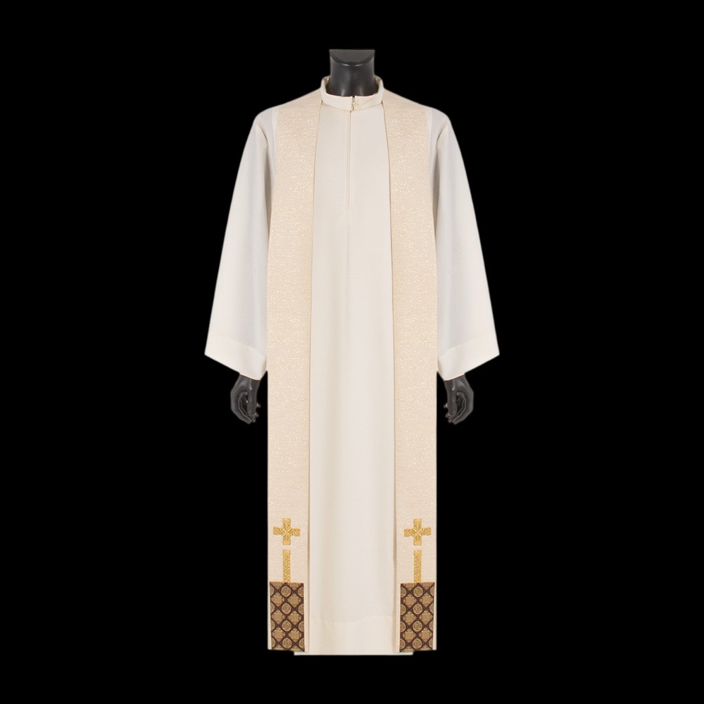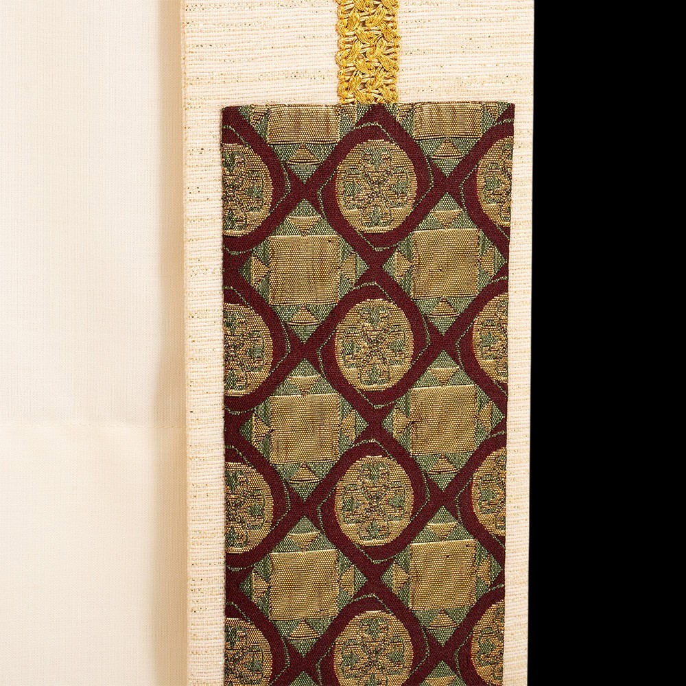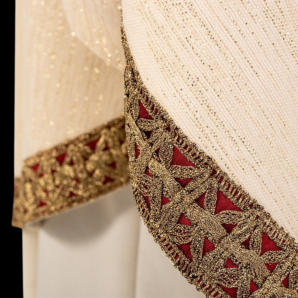 Lungo tutto il profilo della casula sono applicati quattro agrimani in oro. Stola abbinata. Articolo interamente made in Italy, eseguito e prodotto dalla sartoria X REGIO.