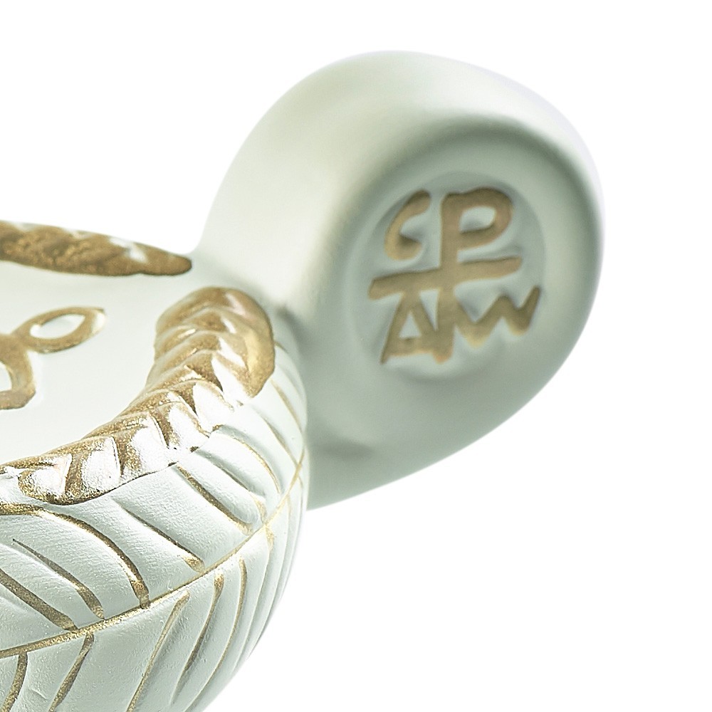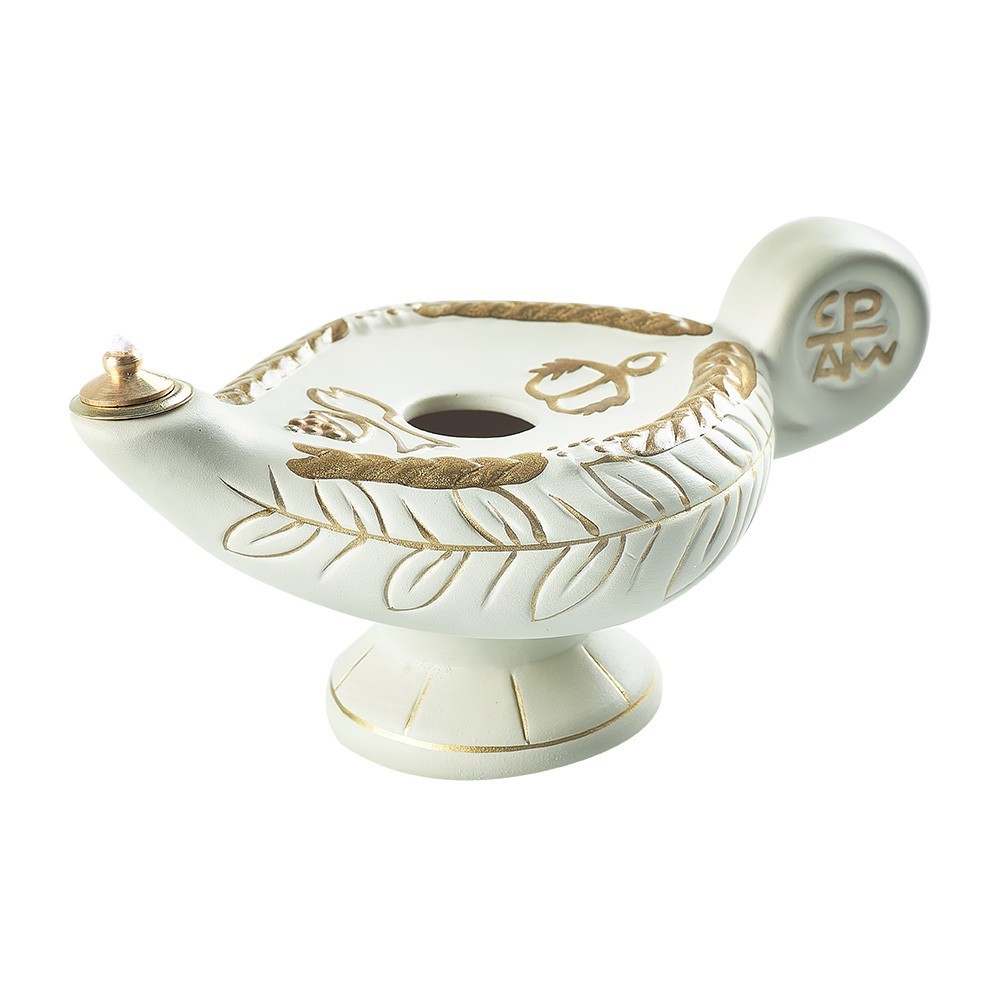 Lampada in porcellana bianca finemente decorata. La lucerna è completa di stoppino e gigler. La fiamma è alimentata dalla cera liquida che brucia tramite lo stoppino in corda.