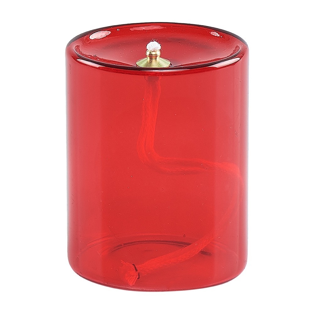 Bicchiere in vetro rosso integrato per cera liquida. Questo bicchiere per Santissimo è realizzato in vetro rosso, chiuso in alto e completo di stoppino e gigler. Usato per cera liquida con durata massima di 4 giorni.
