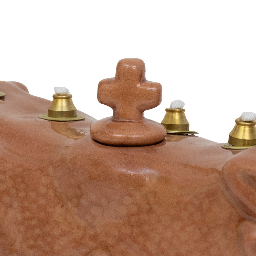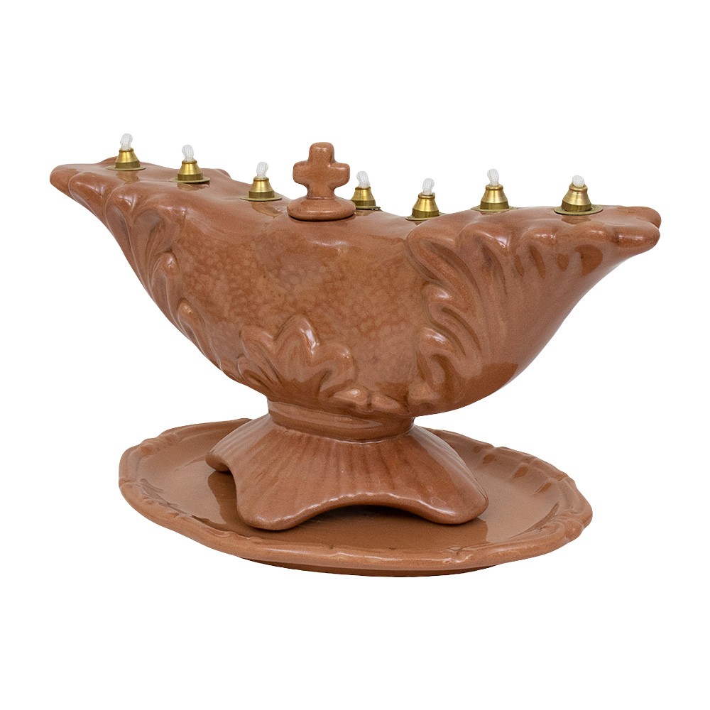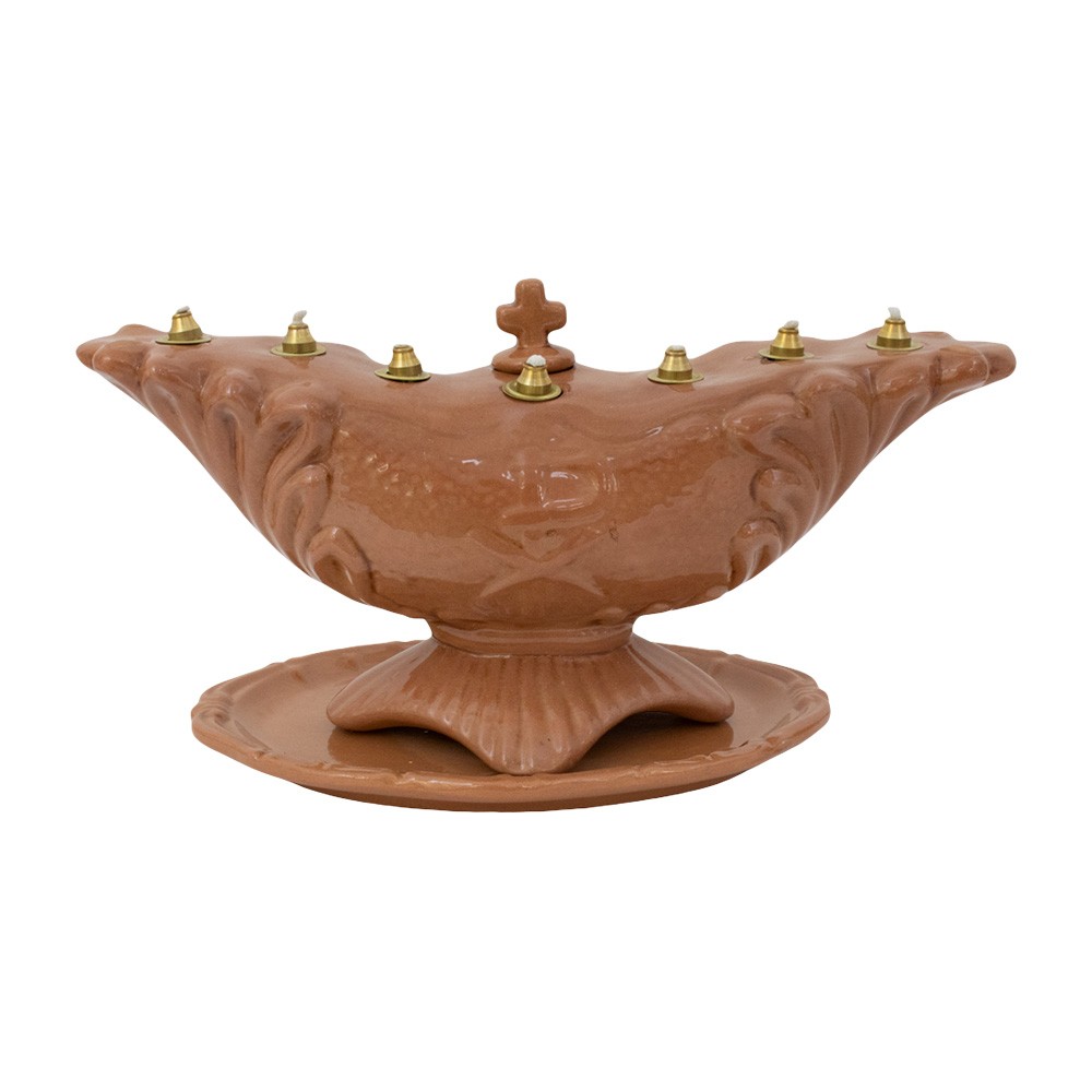Realizzata in ceramica smaltata con decoro Pax, completa di stoppini e gigler.