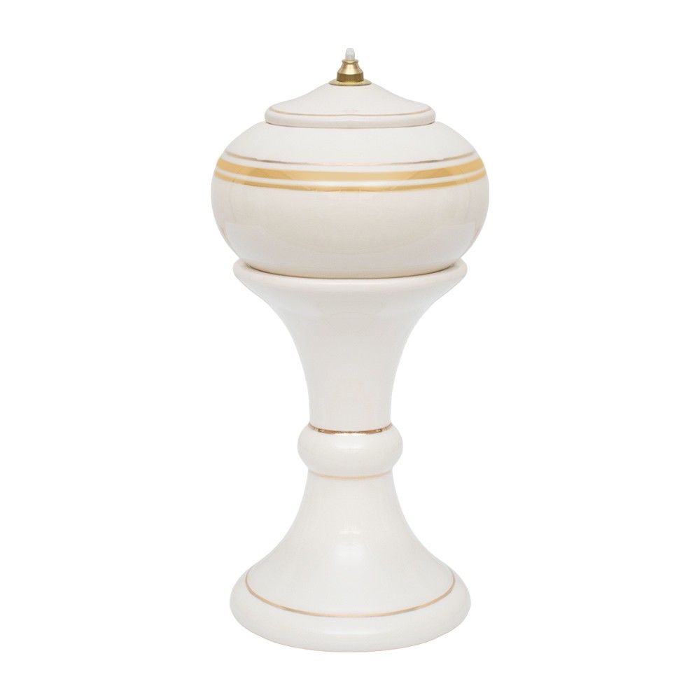 Questa lampada liturgica è realizzata interamente in ceramica dipinta a mano con inserti dorati.