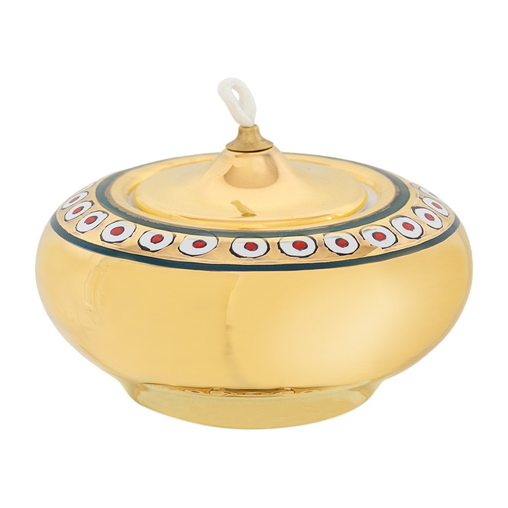 Questa lucerna a cera liquida è per uso liturgico, prodotta interamente in ceramica ed è dipinta finemente a MANO, completa sia di stoppino che di gigler in ottone.
