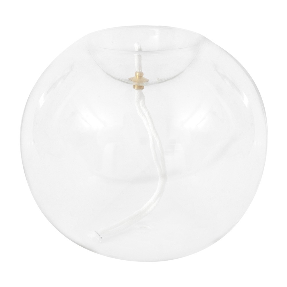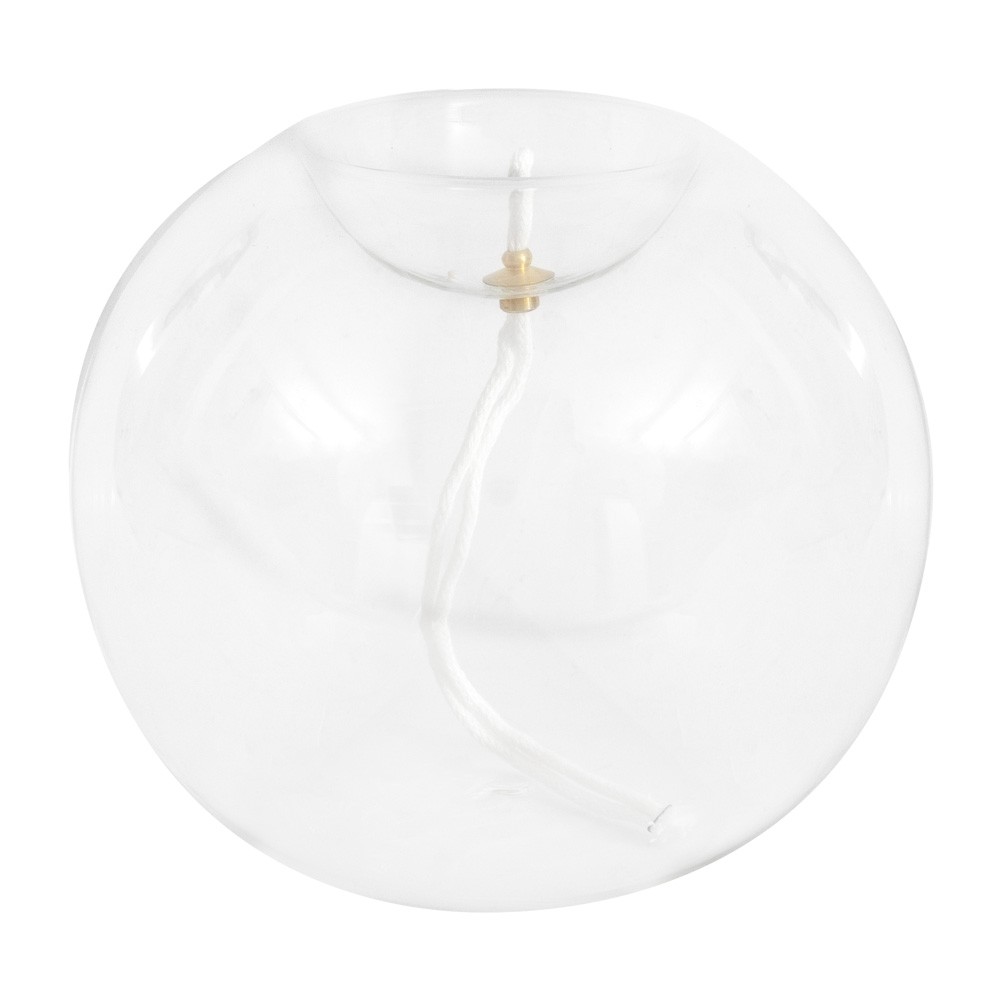 Lampada in vetro a forma di boccia trasparente per cera liquida.