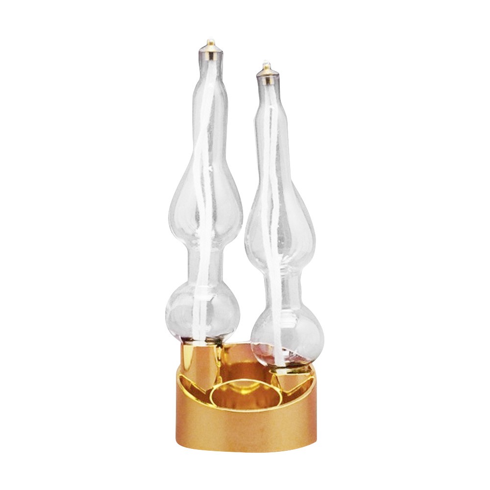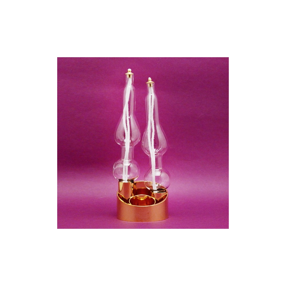 Lume a cera liquida modello "Iris" a due fiamme, con base in ottone dorata.