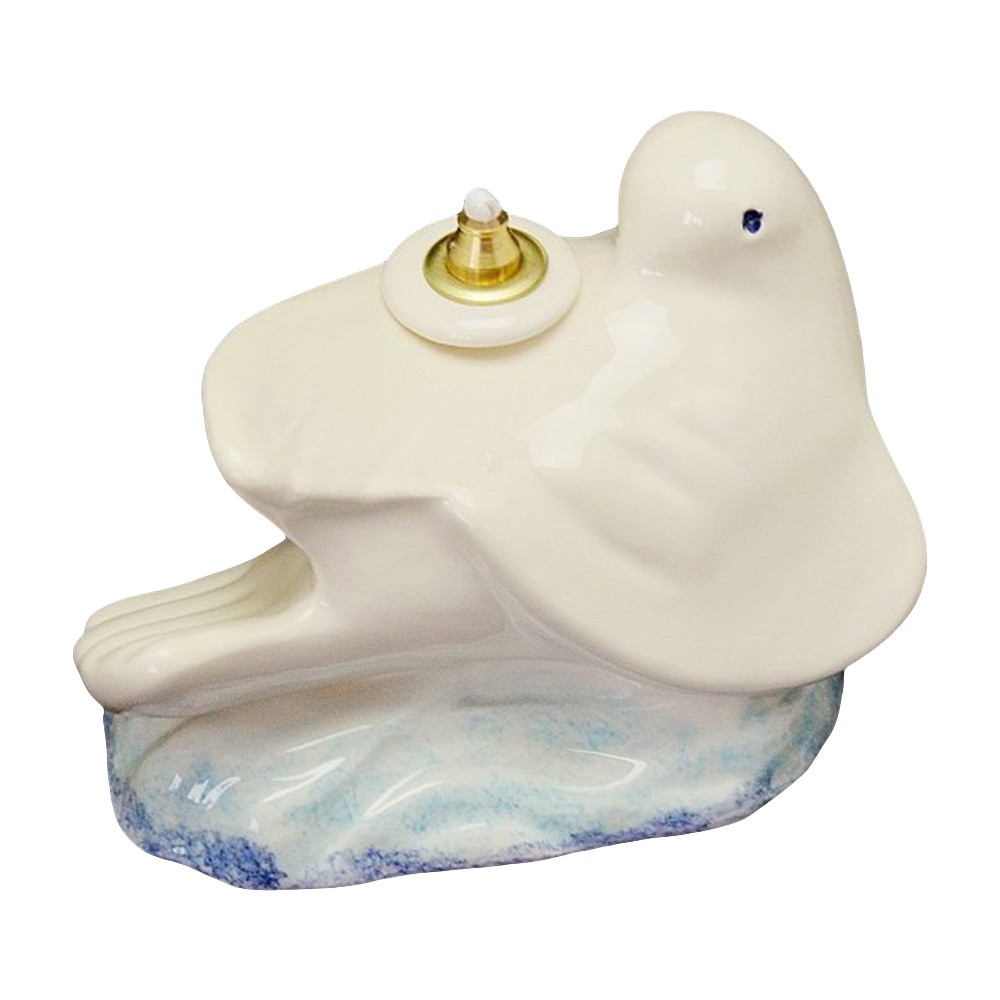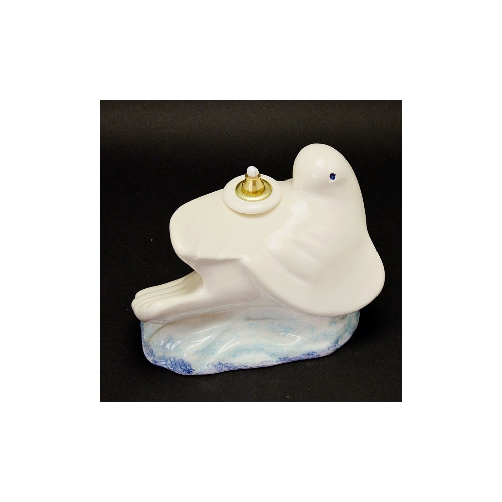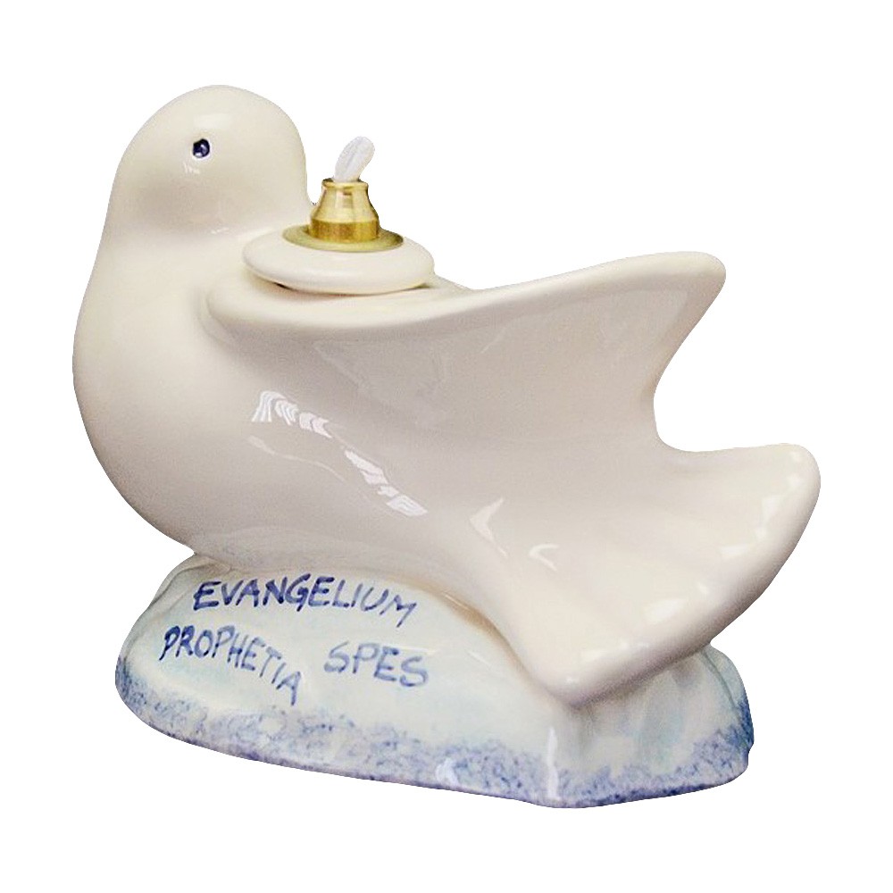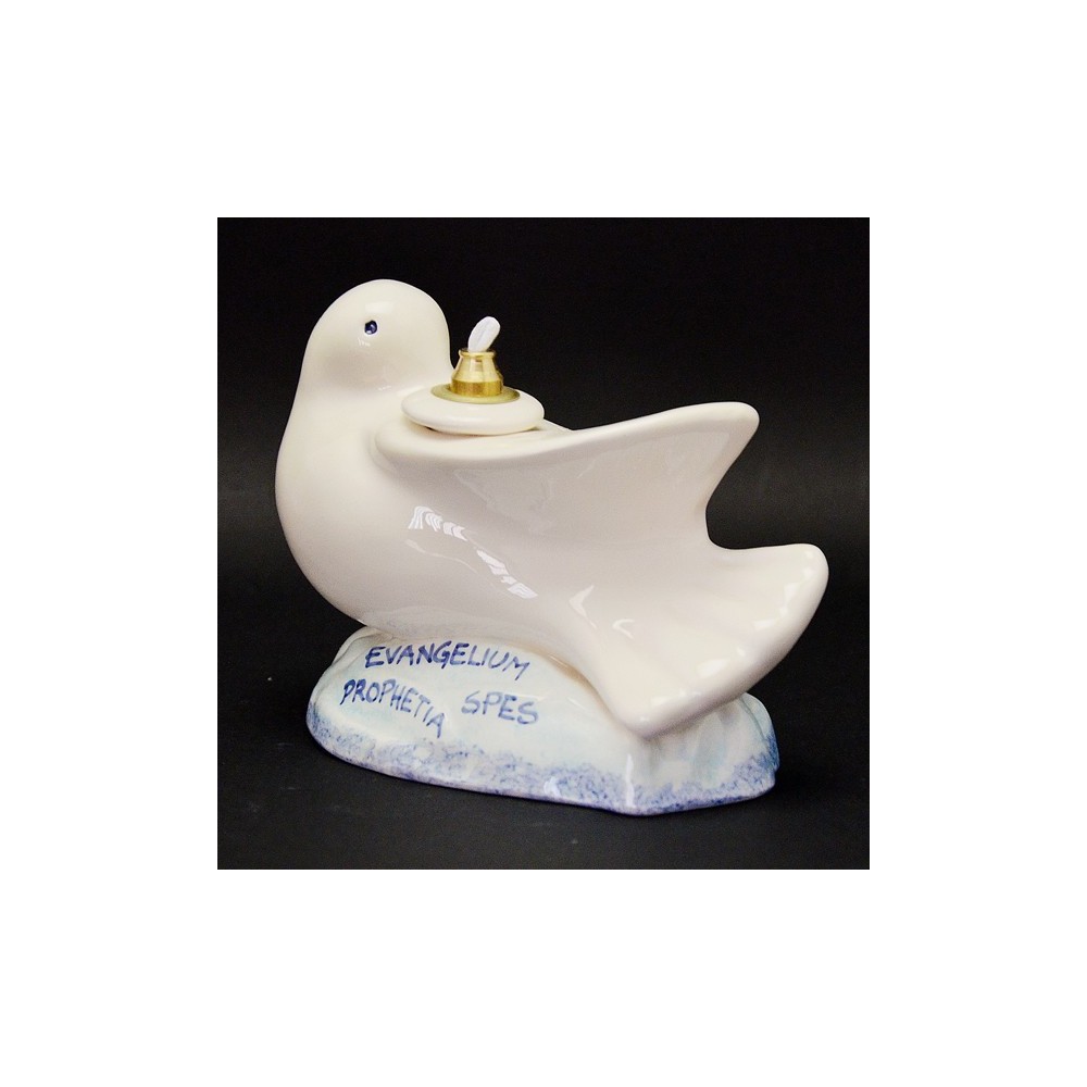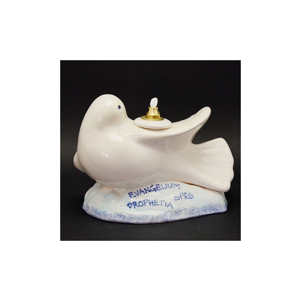 Lampada Colomba a cera liquida in ceramica decorata con scritta EVANGELIM PROPHETIA SPES. Completa di stoppino e gigler in ottone. La lampada è alta 10 cm ca ed e' larga 11,5 cm. Made in Italy.