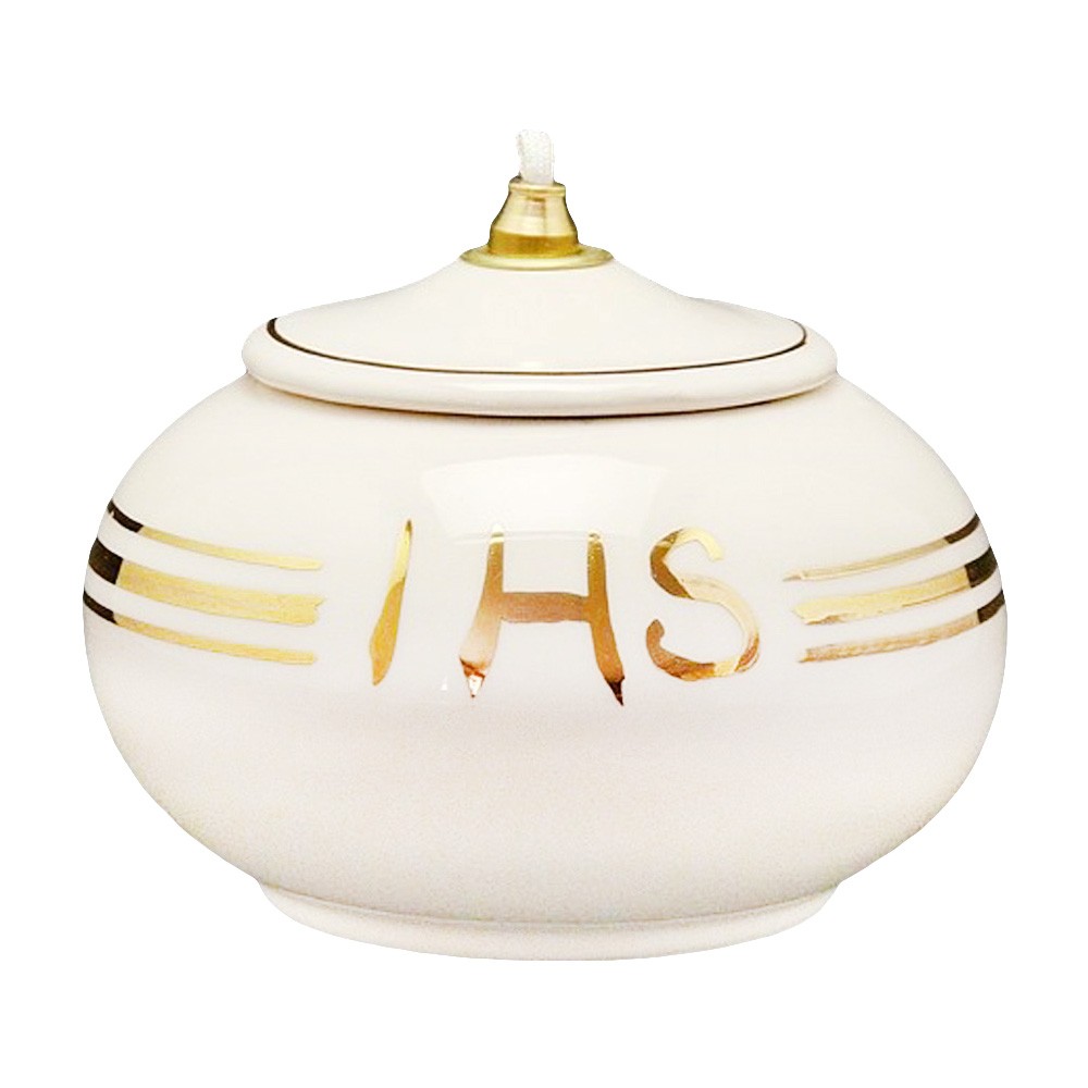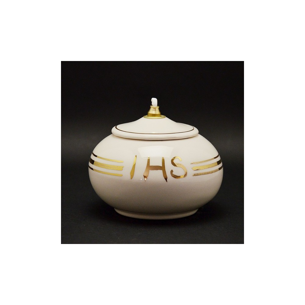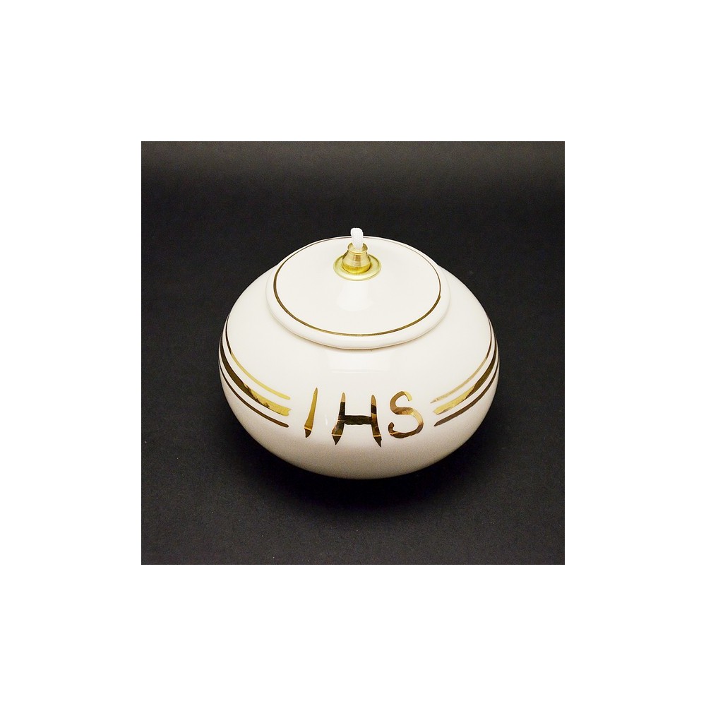 Lampada tonda in ceramica bianca con rifiniture in oro e scritta JHS. La Lampada funziona a cera liquida. Completa di KIT in ottone e stoppino.