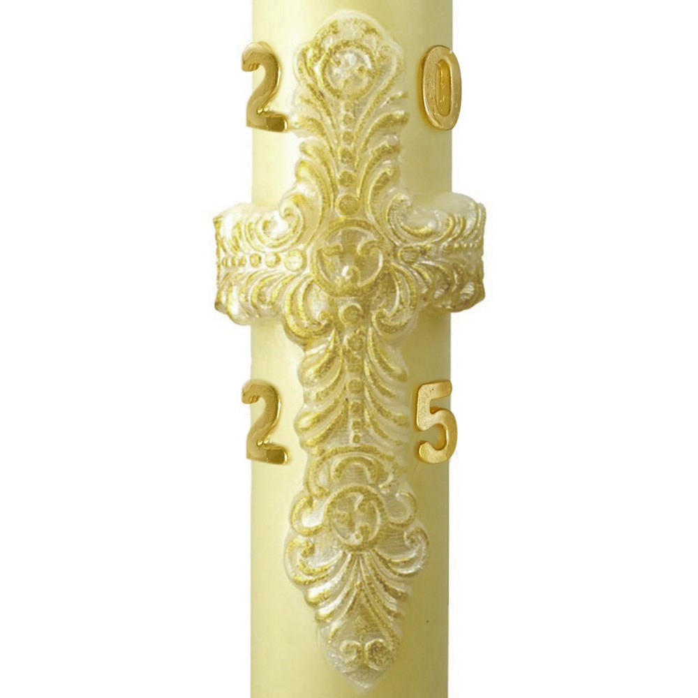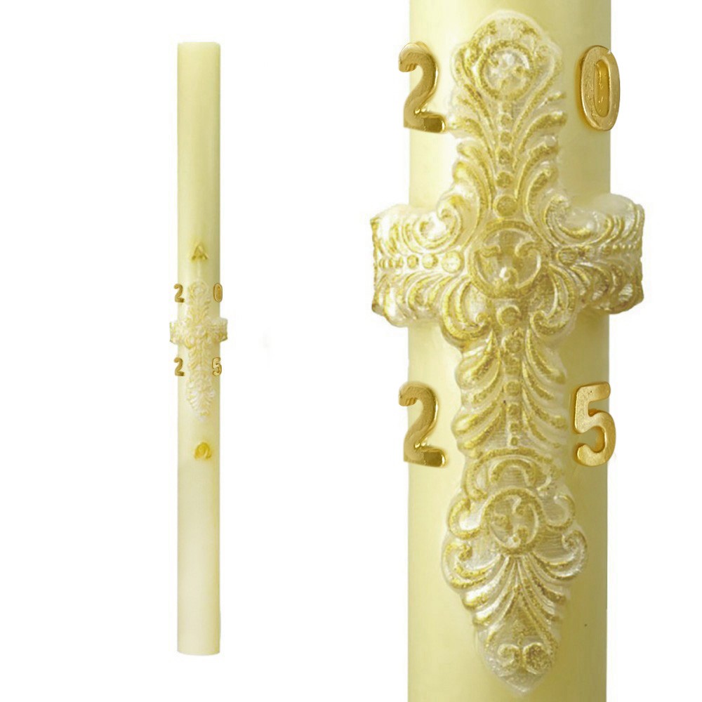 Cero Pasquale con decori in rilievo croce, anno attuale e simboli Alfa e Omega. Il cero è realizzato in CERA di altissima qualità.